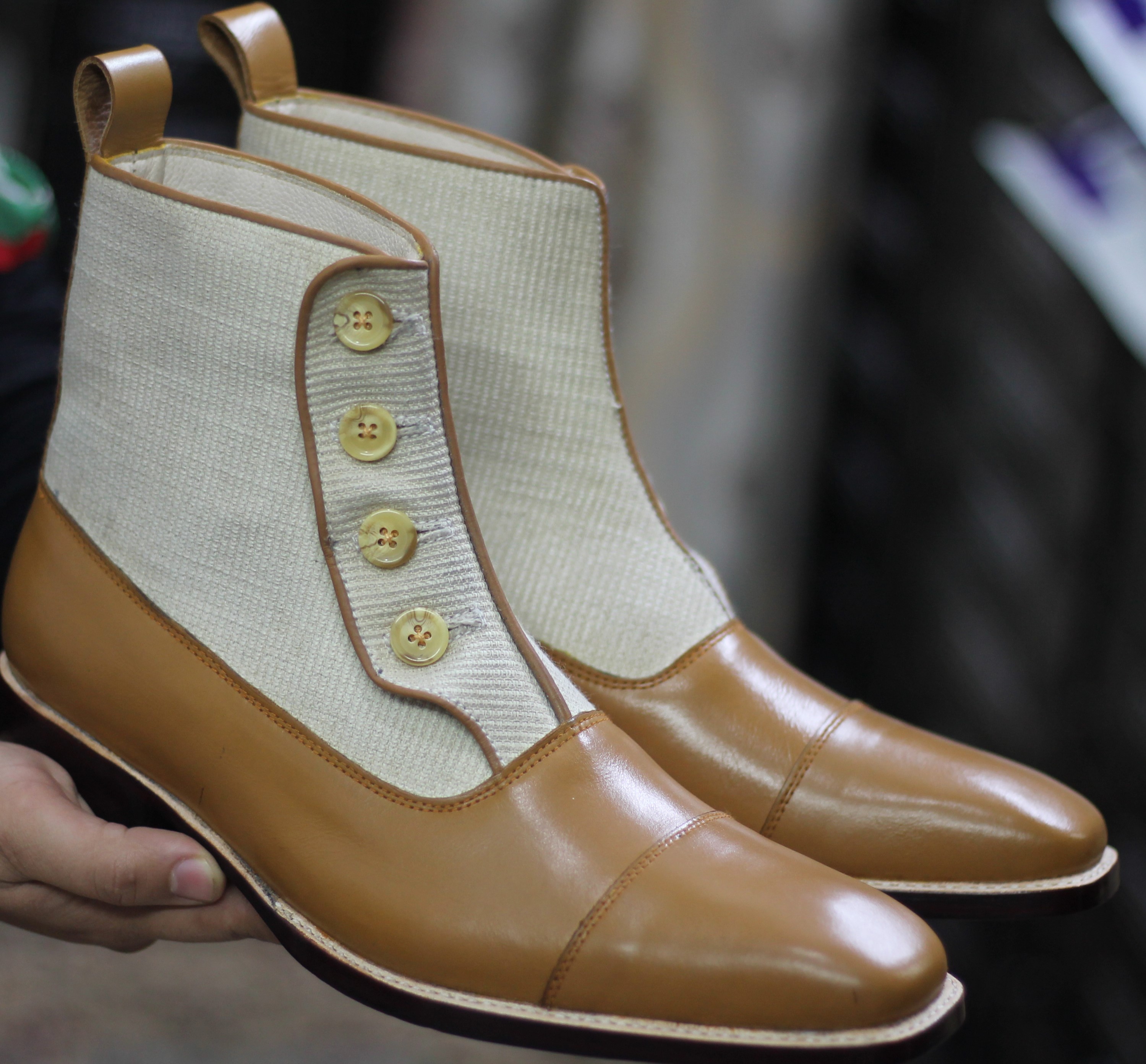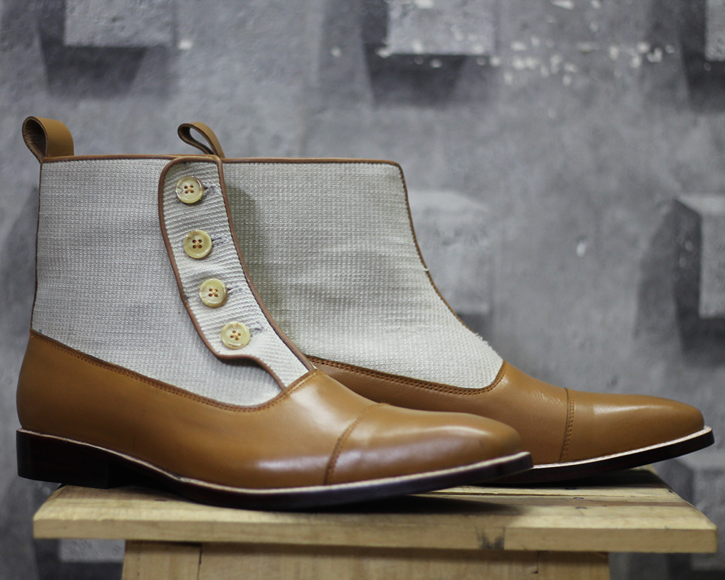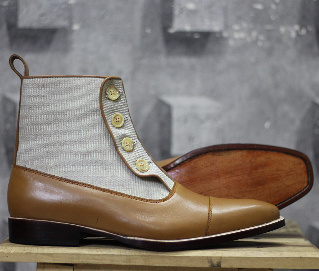 Handmade Button Top Cap Toe Brown Beige Leather Boots For Men's