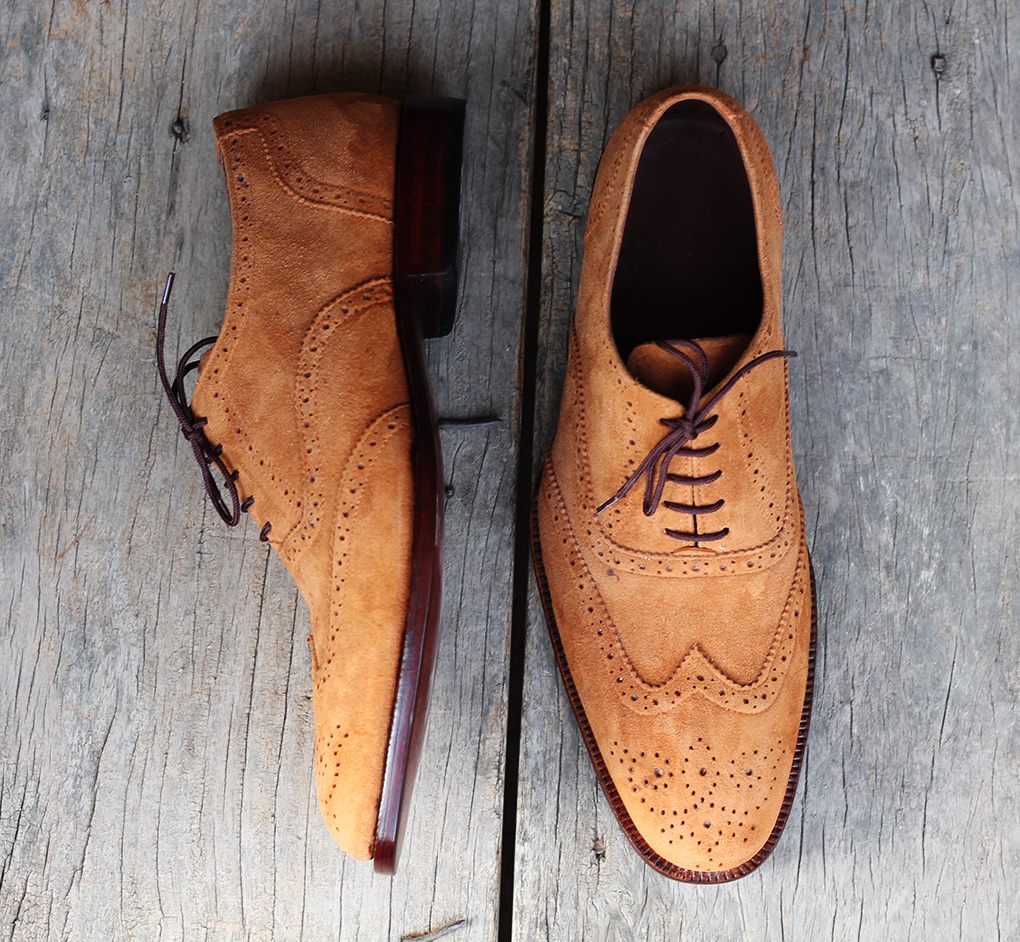 Handmade Men's Wing Tip Brogue Tan Suede Leather Shoes