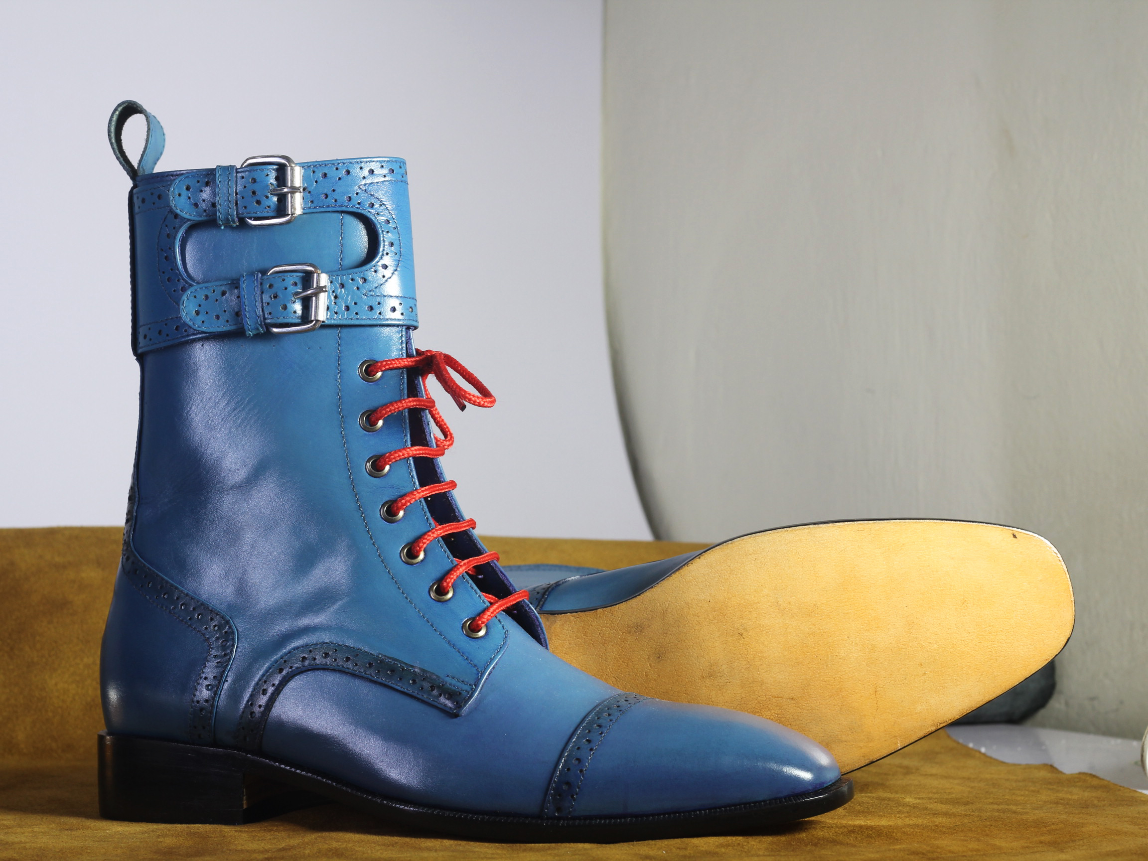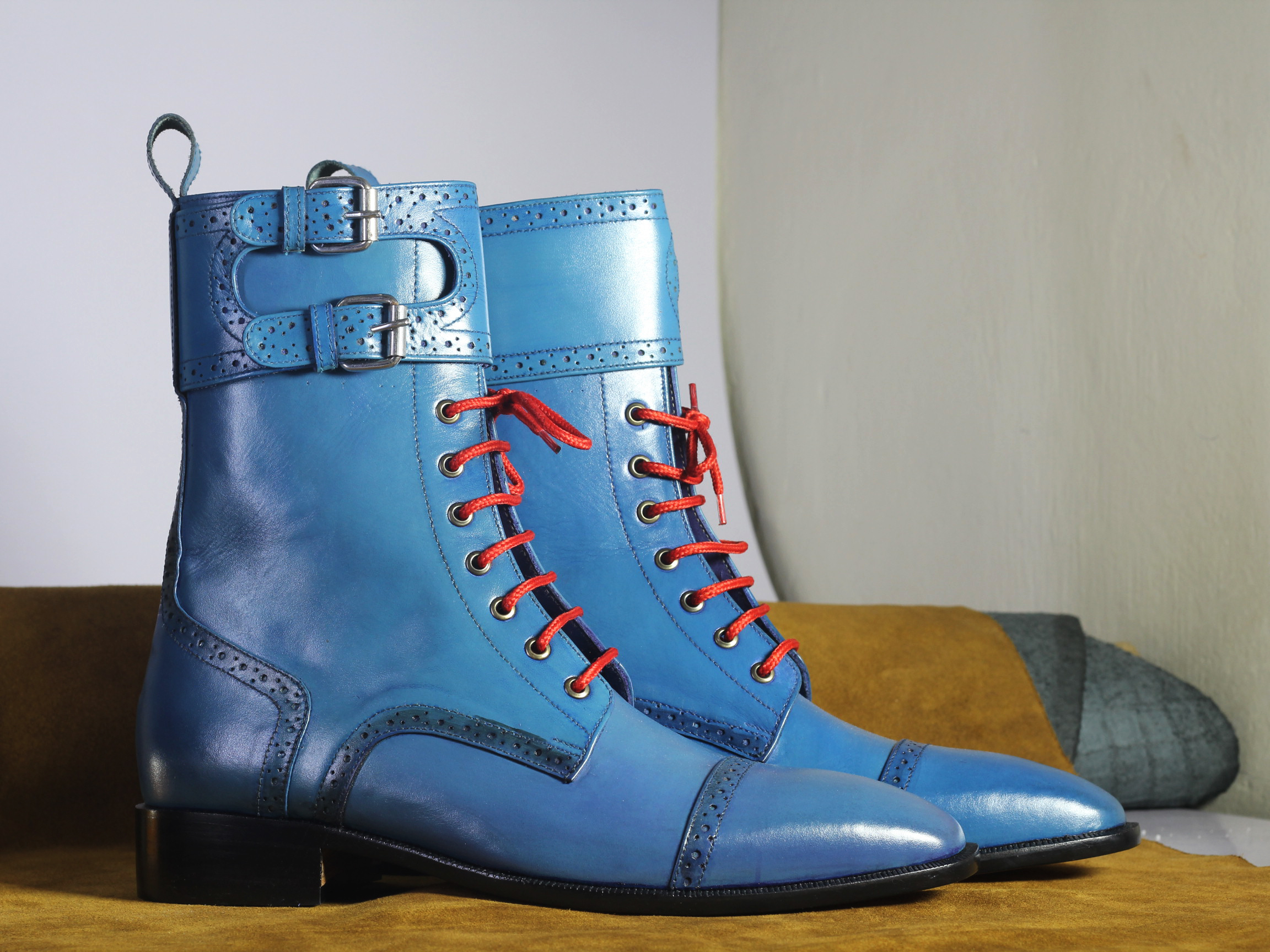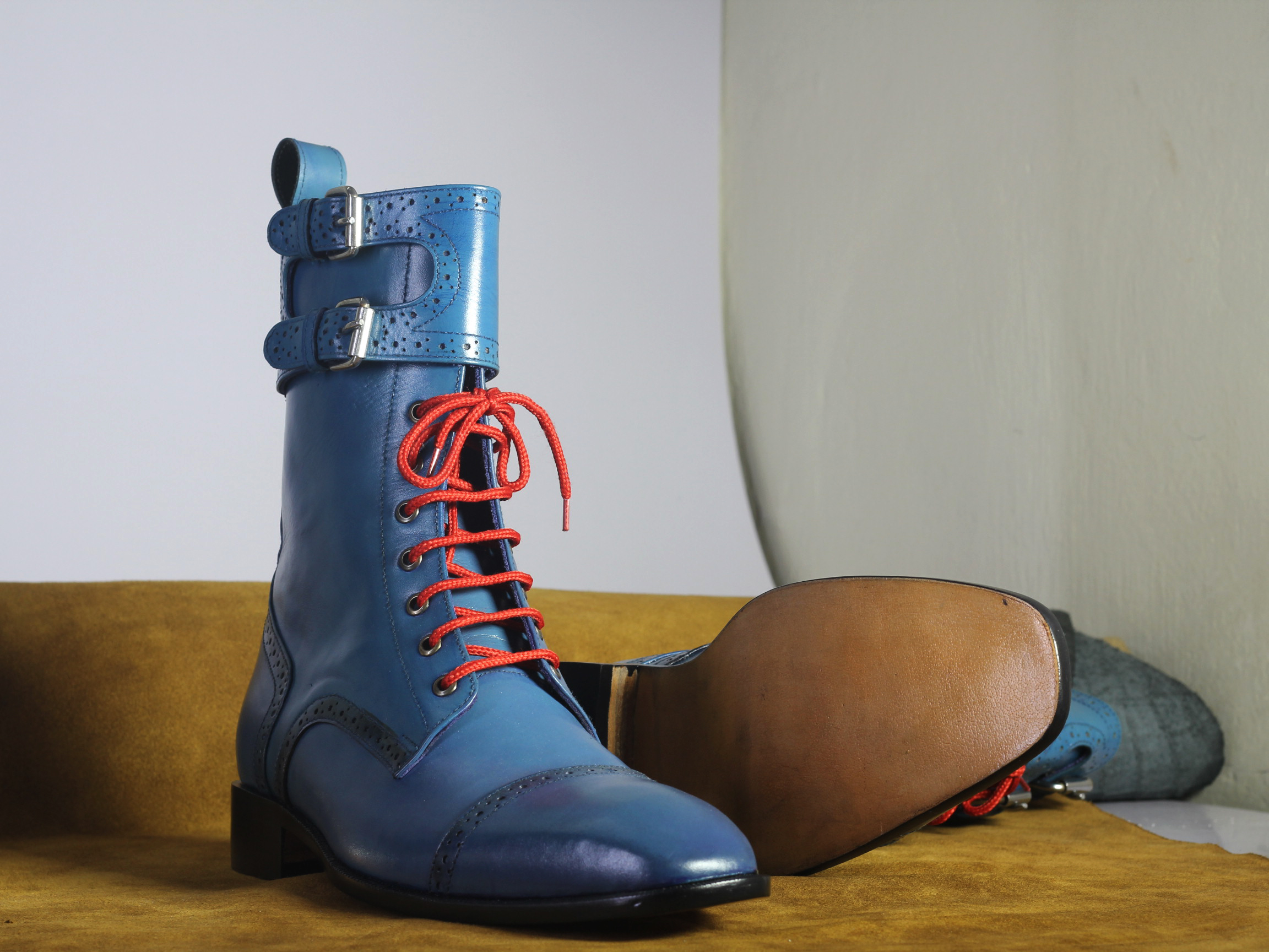 Blue Double Monk Oxford Cap Toe Leather Lace Up Boot