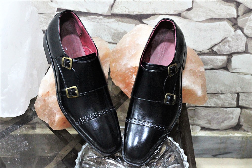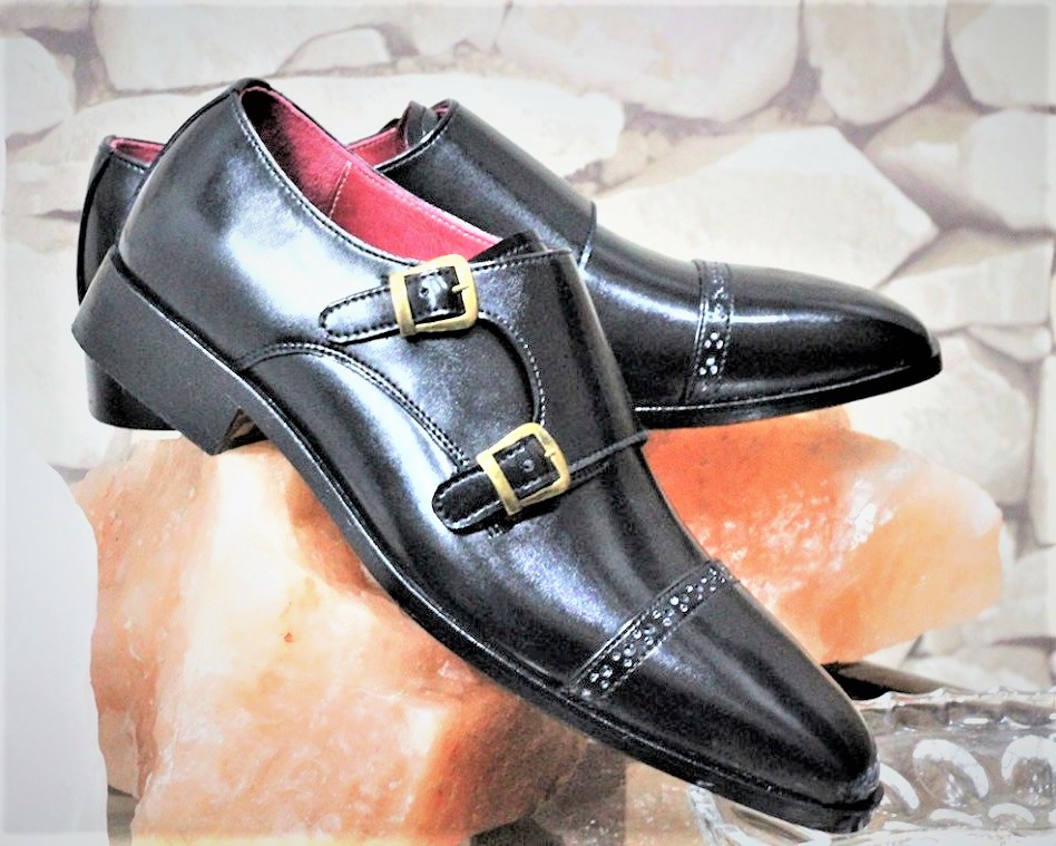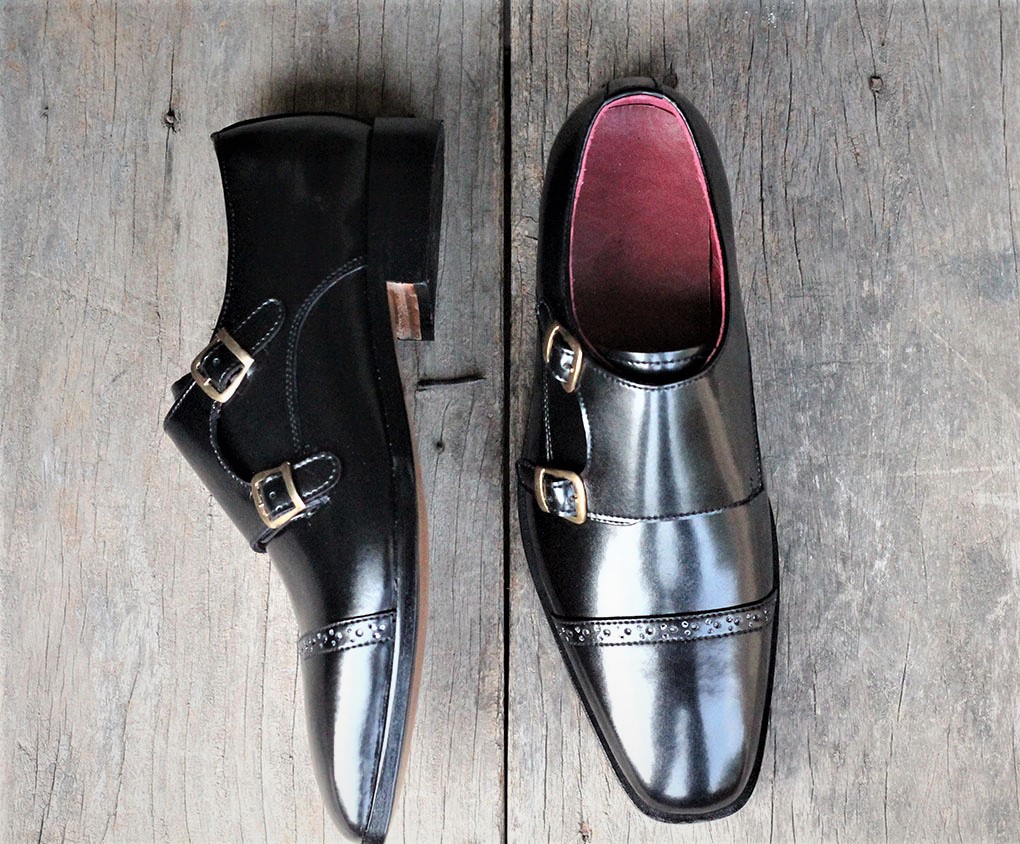 Handmade Men's Black Double Monk Cap Toe Leather Shoes