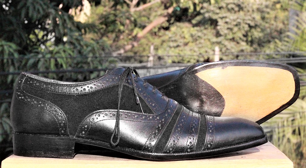 Handmade Men's Black Leather-Suede Cap Toe Lace-up Shoes