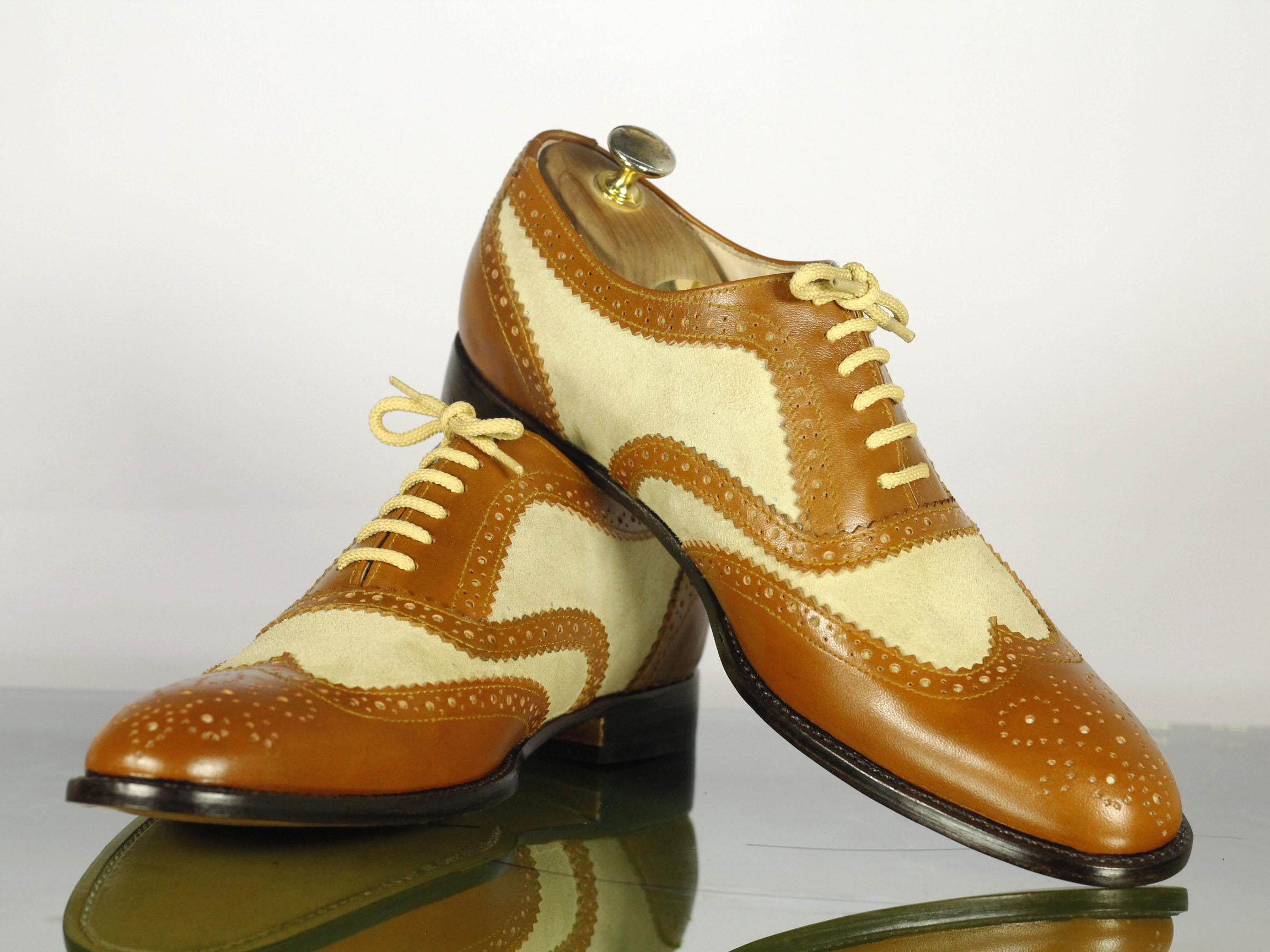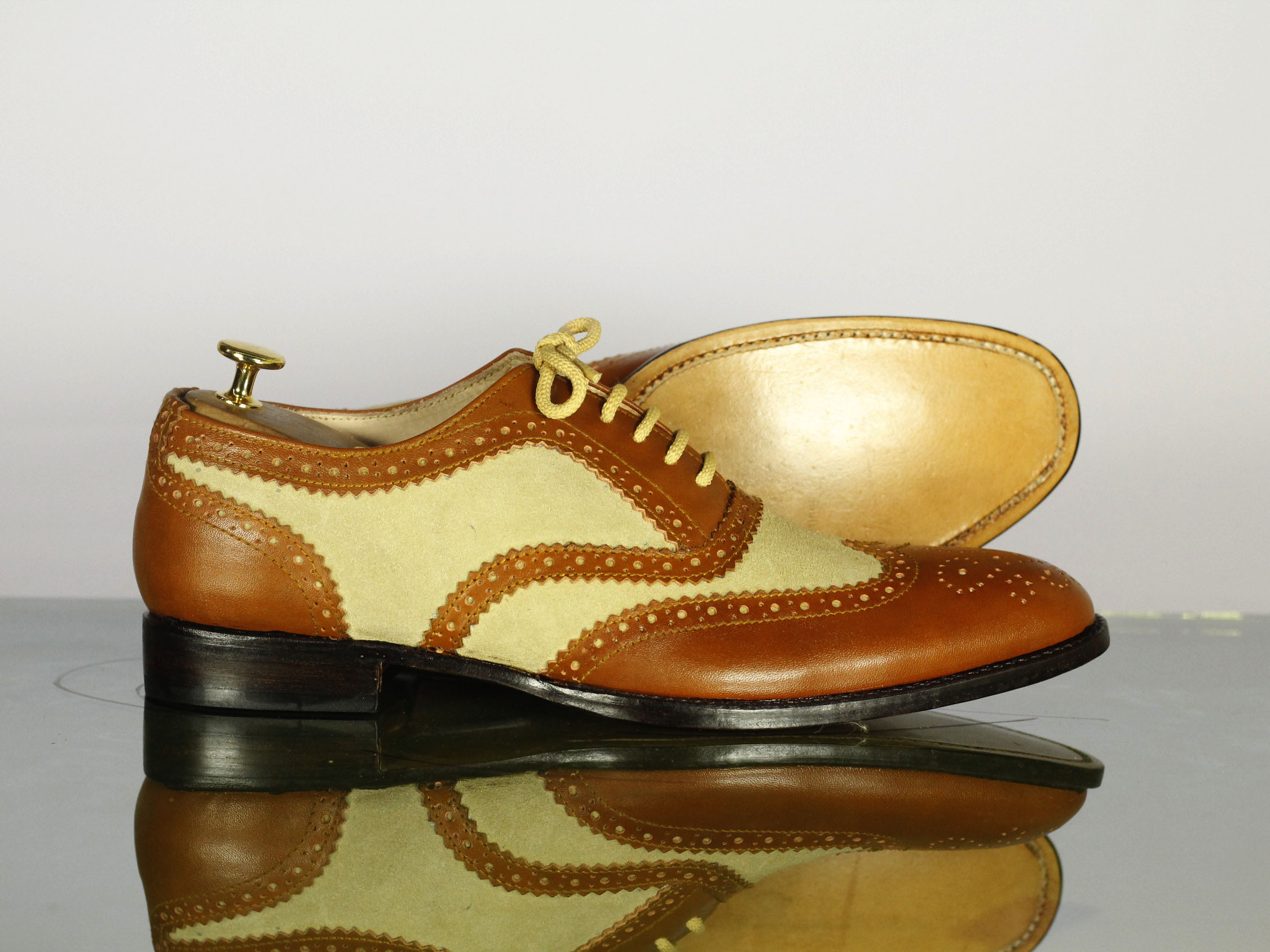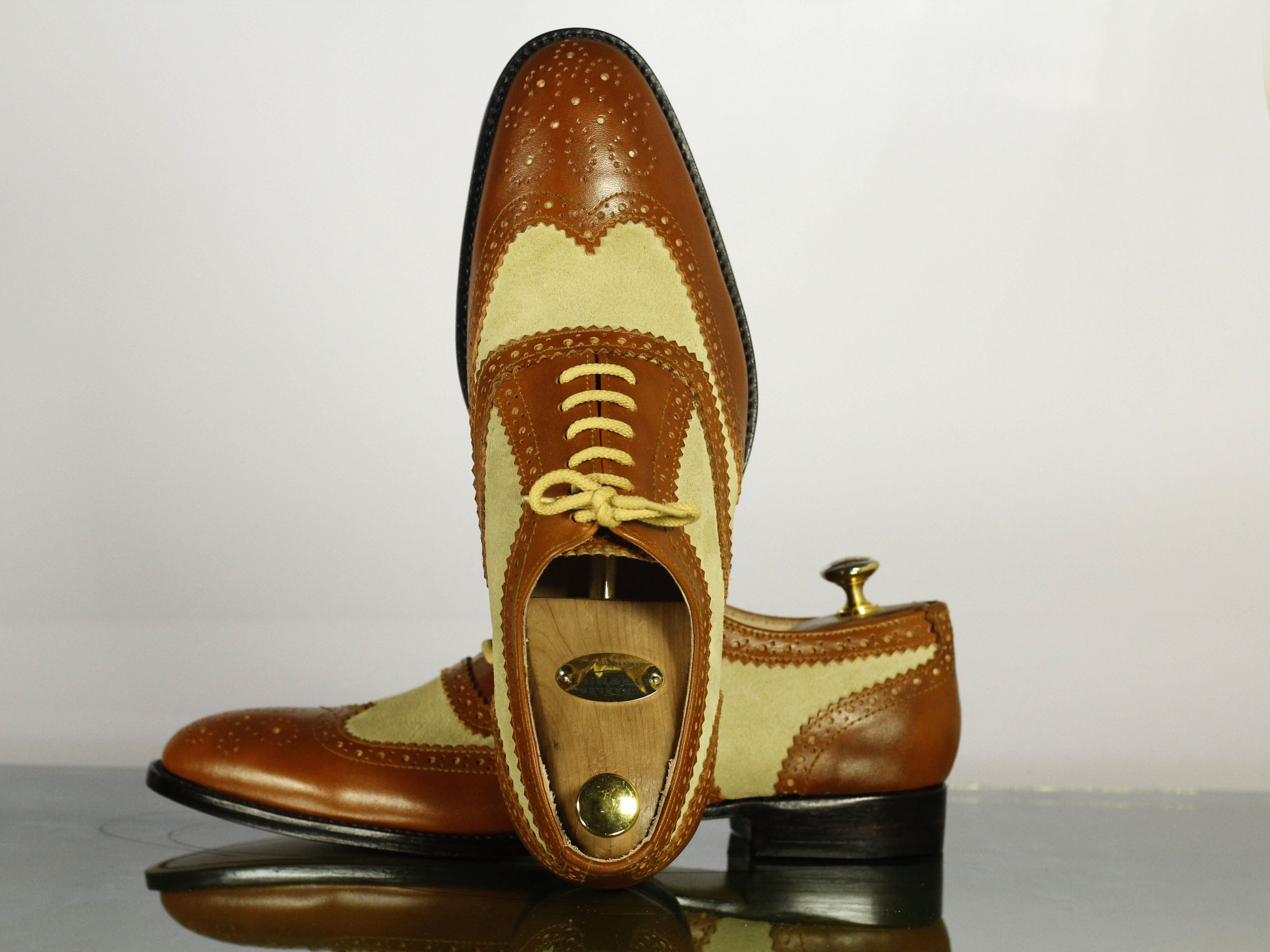 Beige & Tan Wing tip Brogue Lace Up Leather Suede Shoes