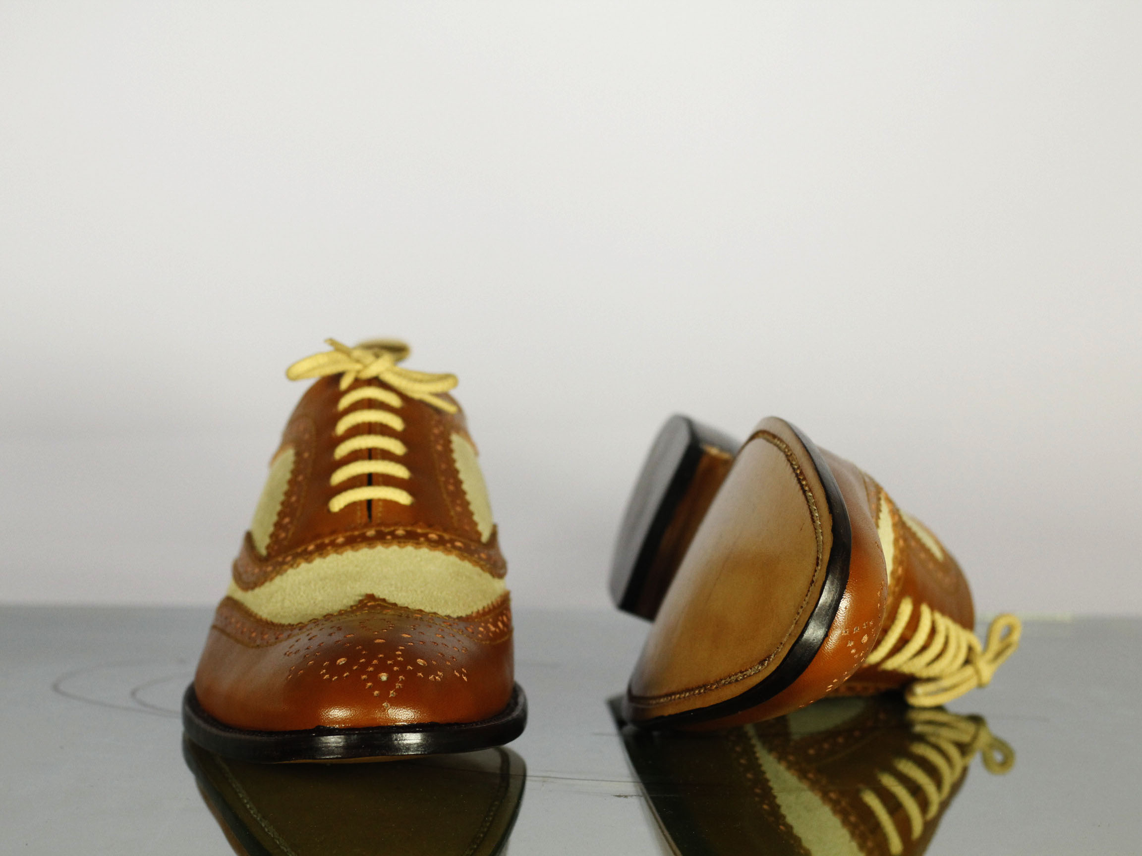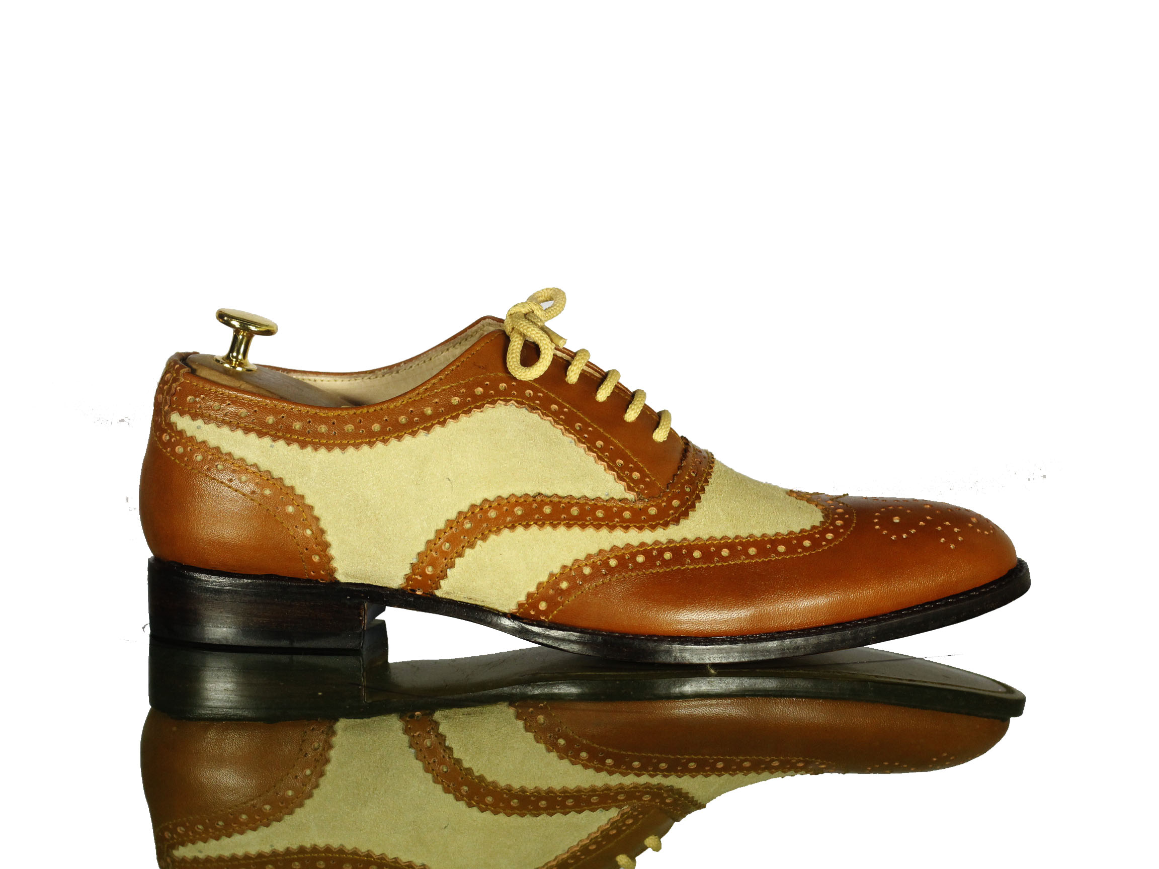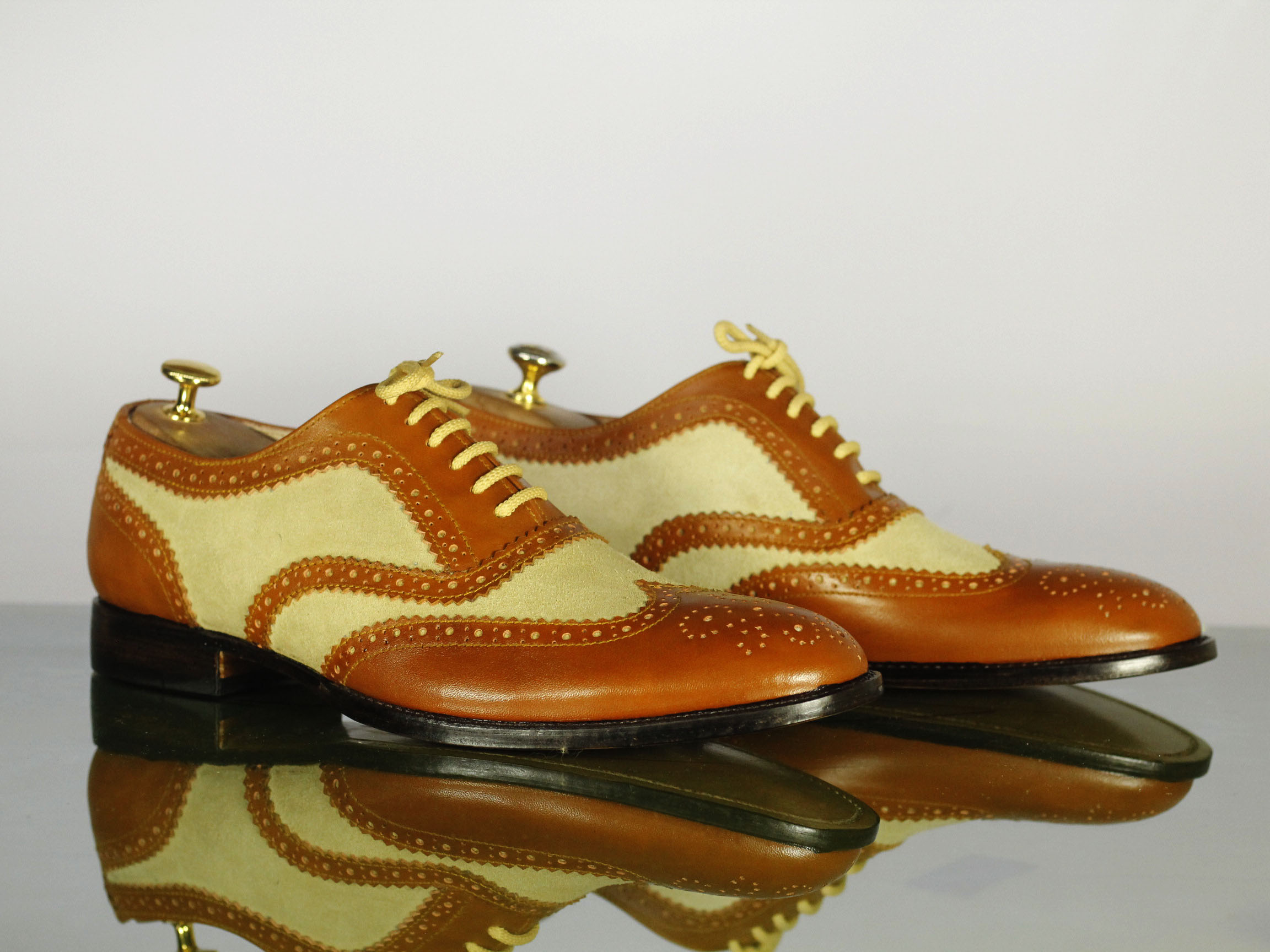Beige & Tan Wing tip Brogue Lace Up Leather Suede Shoes