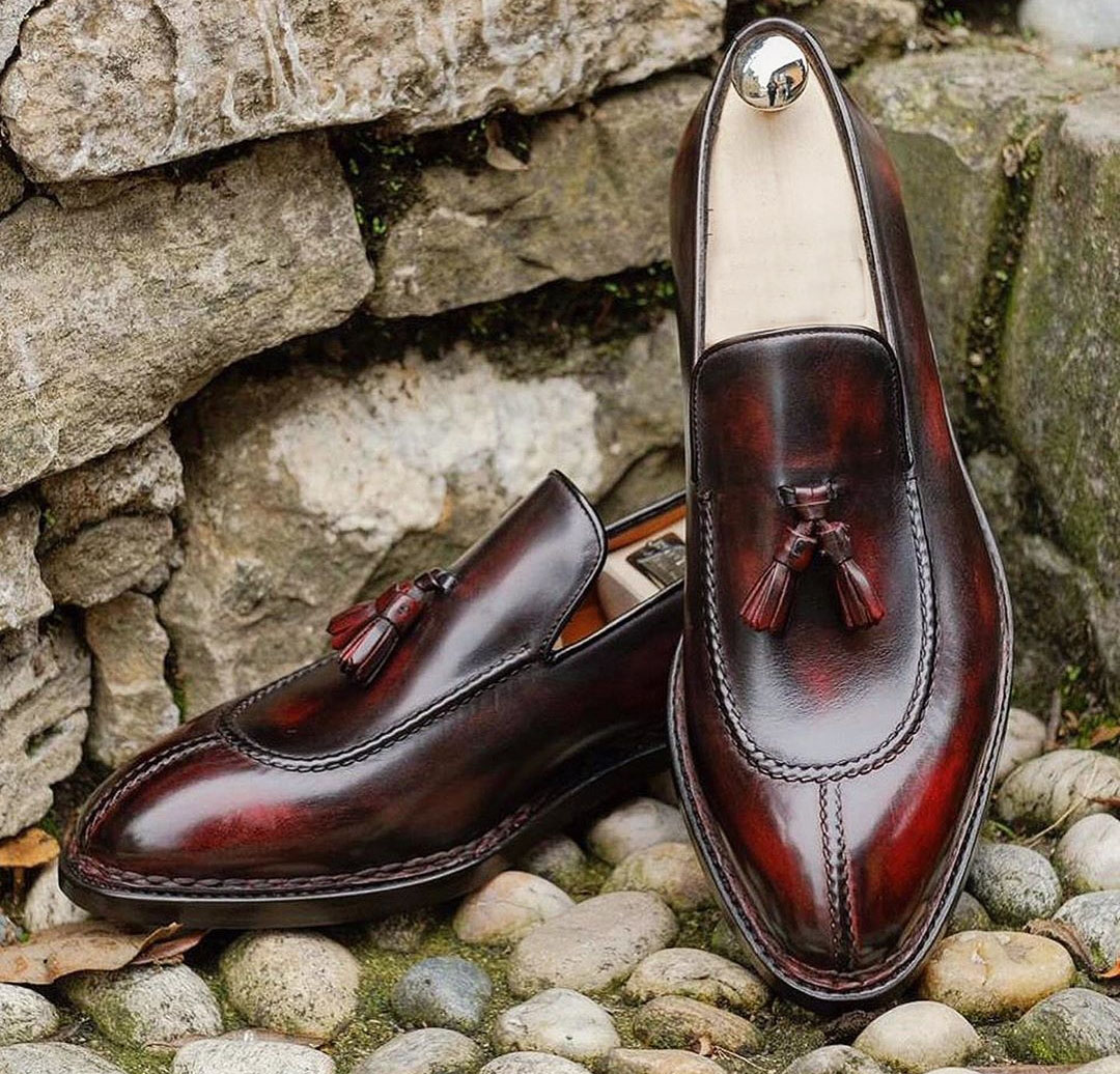 Stylish Burgundy Tasseled Round Toe Leather Slip On Loafers