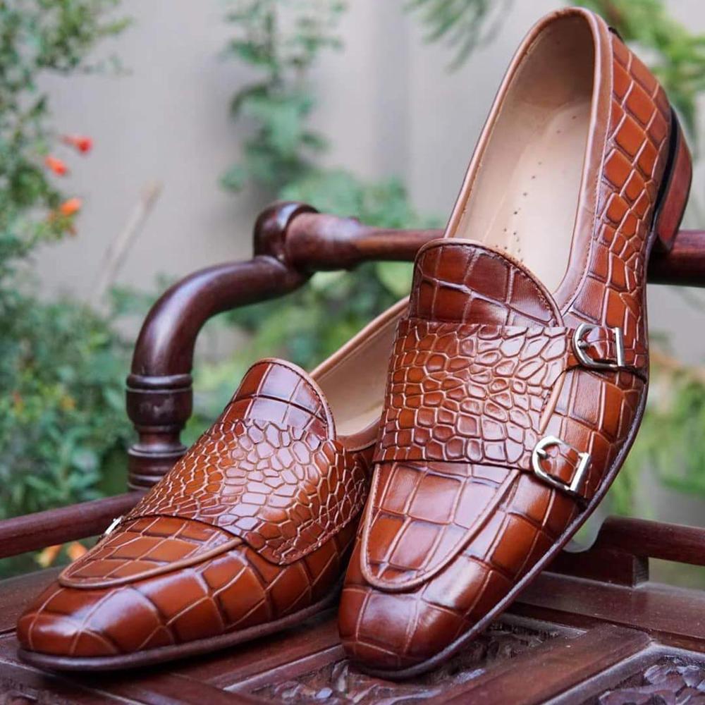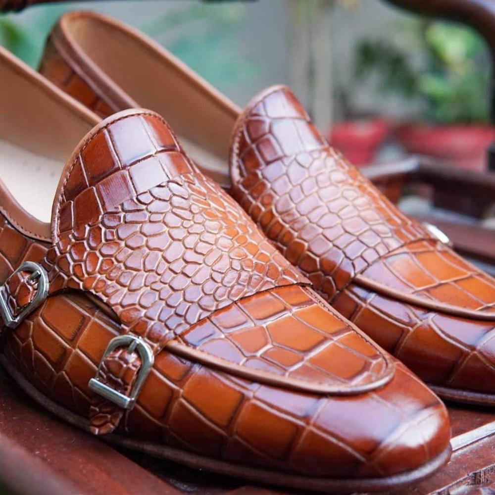 Tan Alligator Texture Round Toe Double Monk Leather Shoes
