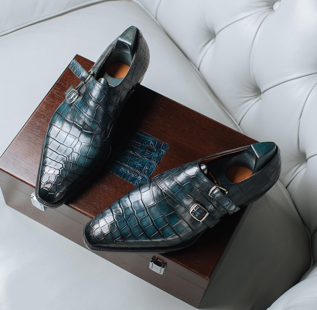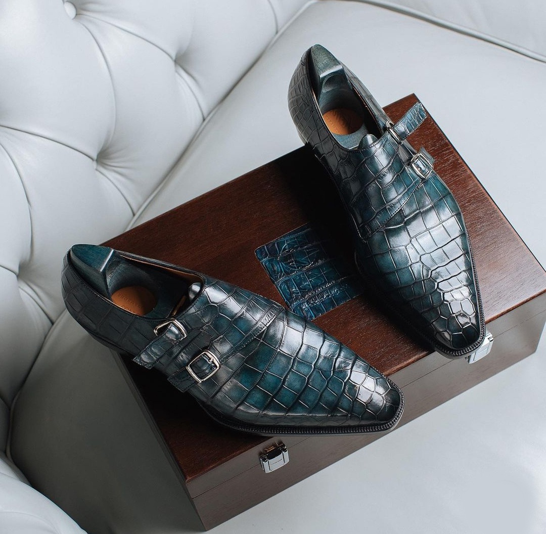 Alligator Texture Side Buckle Turquoise Leather Oxford Men's Shoes