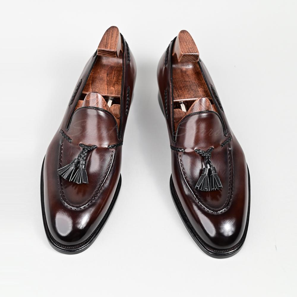 Cordovan Patent Leather Round Toe Tasseled Slip On Loafers