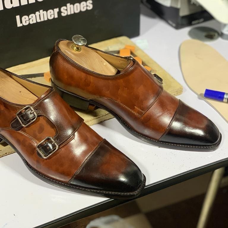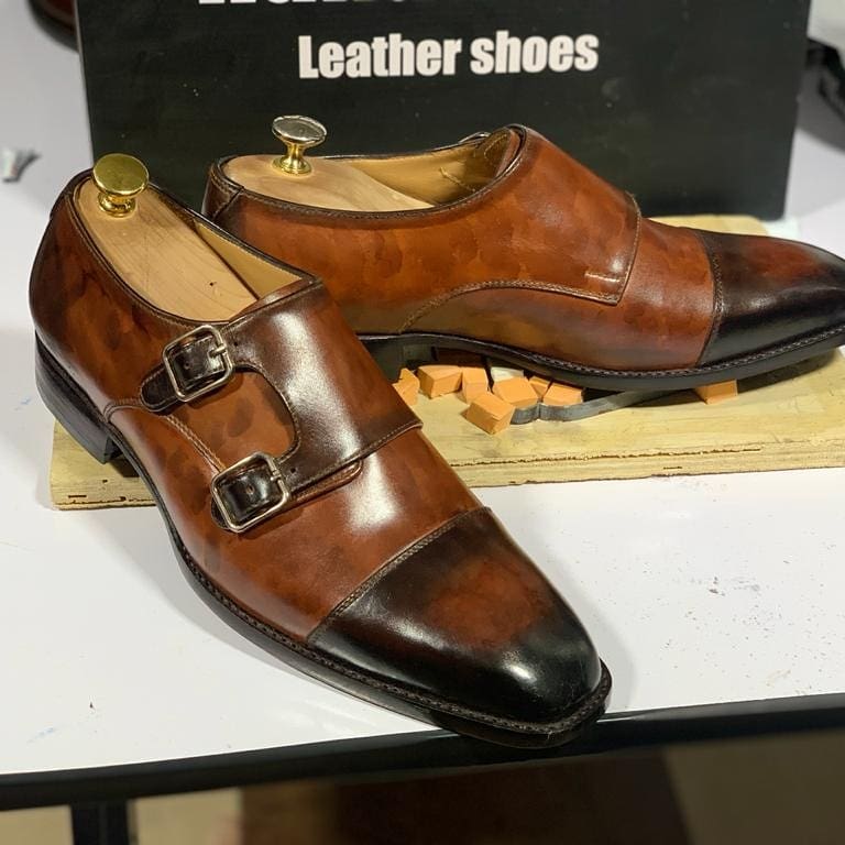Hand Painted Cap Toe Two Tone Double Monk Leather Men's Shoes
