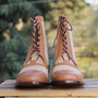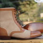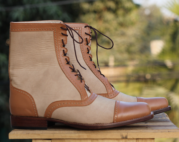 Handmade Beige Brown Cap Toe Ankle Lace Up Denim Leather Boots for Men