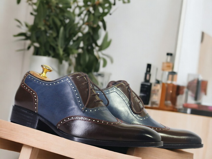 Handmade Men’s Brown Blue Wing Tip Leather Shoes, Men Lace Up Formal Shoes
