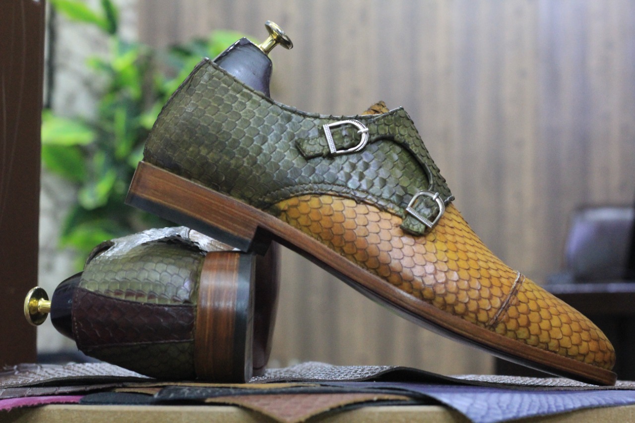 Handmade Men's Two Tone Python Leather Cap Toe Double Monk Buckle Dress Shoes