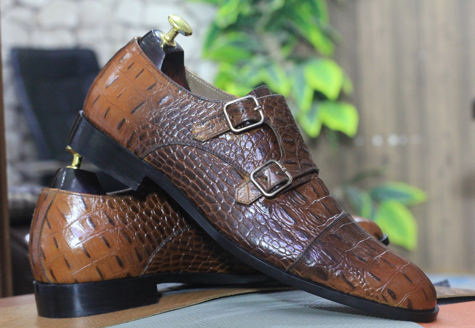 Handpainted Men's Brown Leather Cap Toe Double Buckle Alligator Print Fashion Shoes