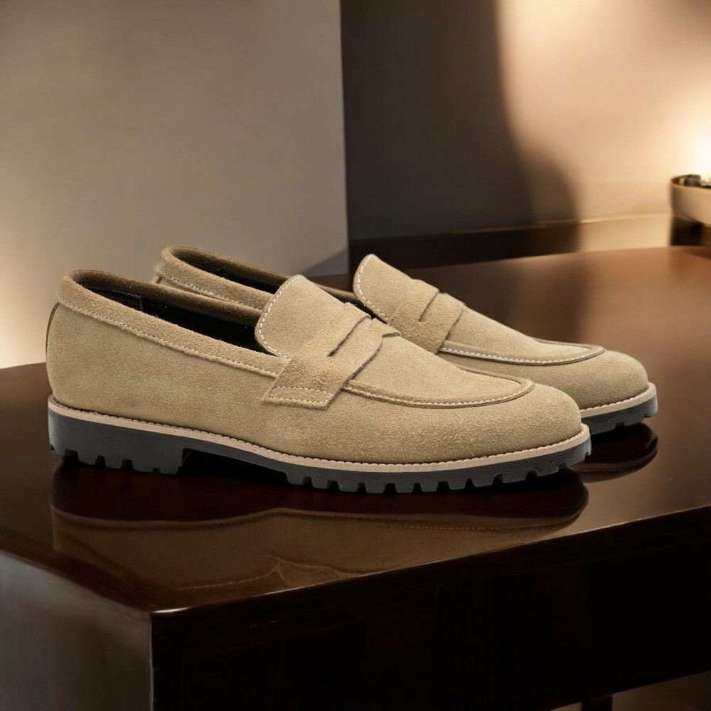 Men's Handmade Beige Suede Penny Loafer Shoes, Moccasin Shoes