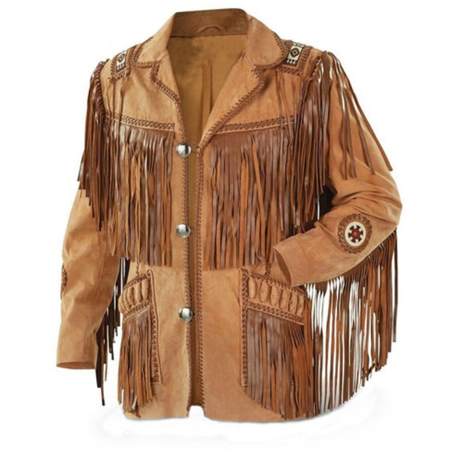 New Men Brown Western Style Suede Cowboy Leather Jacket With Fringes and Beads