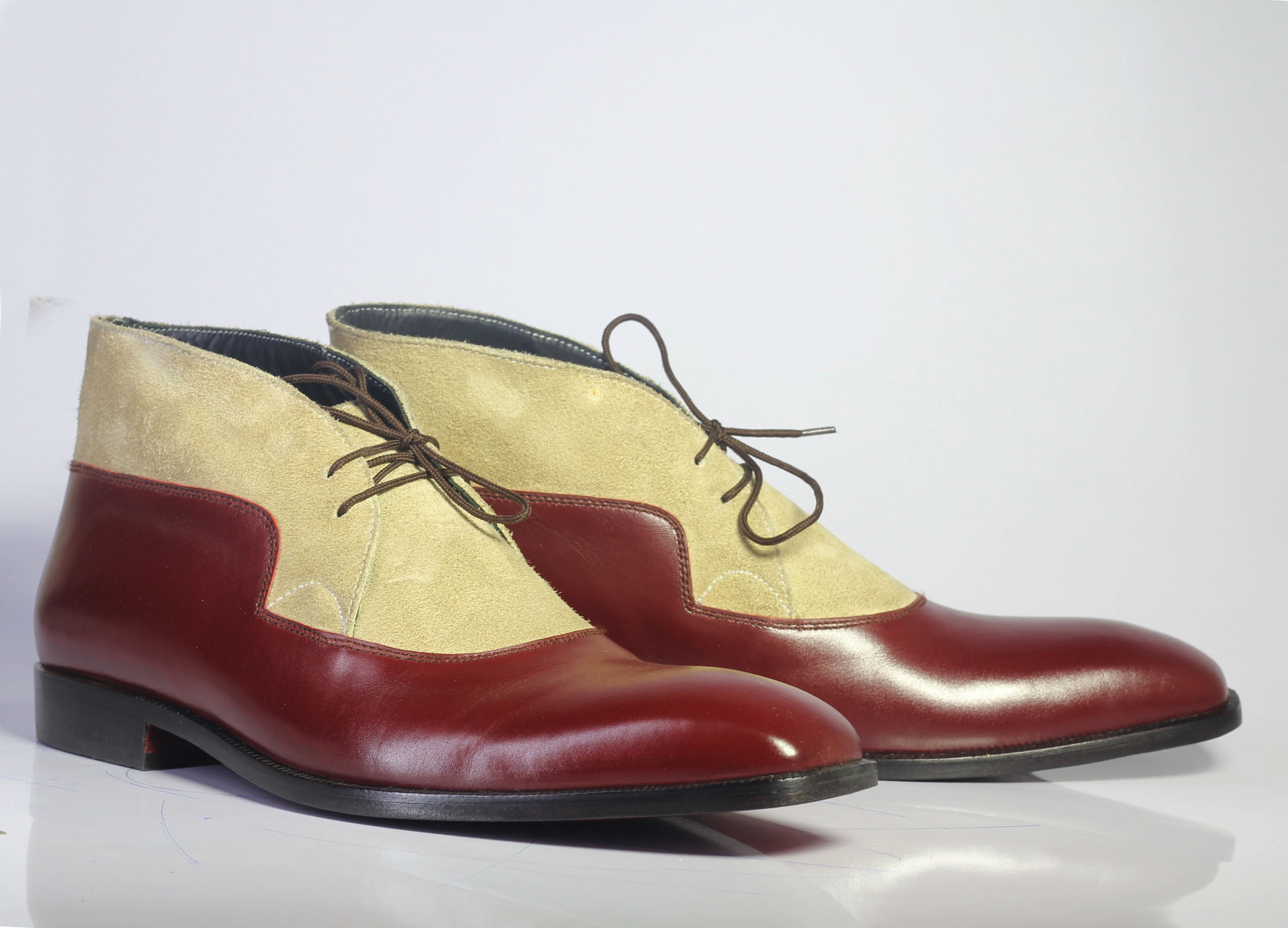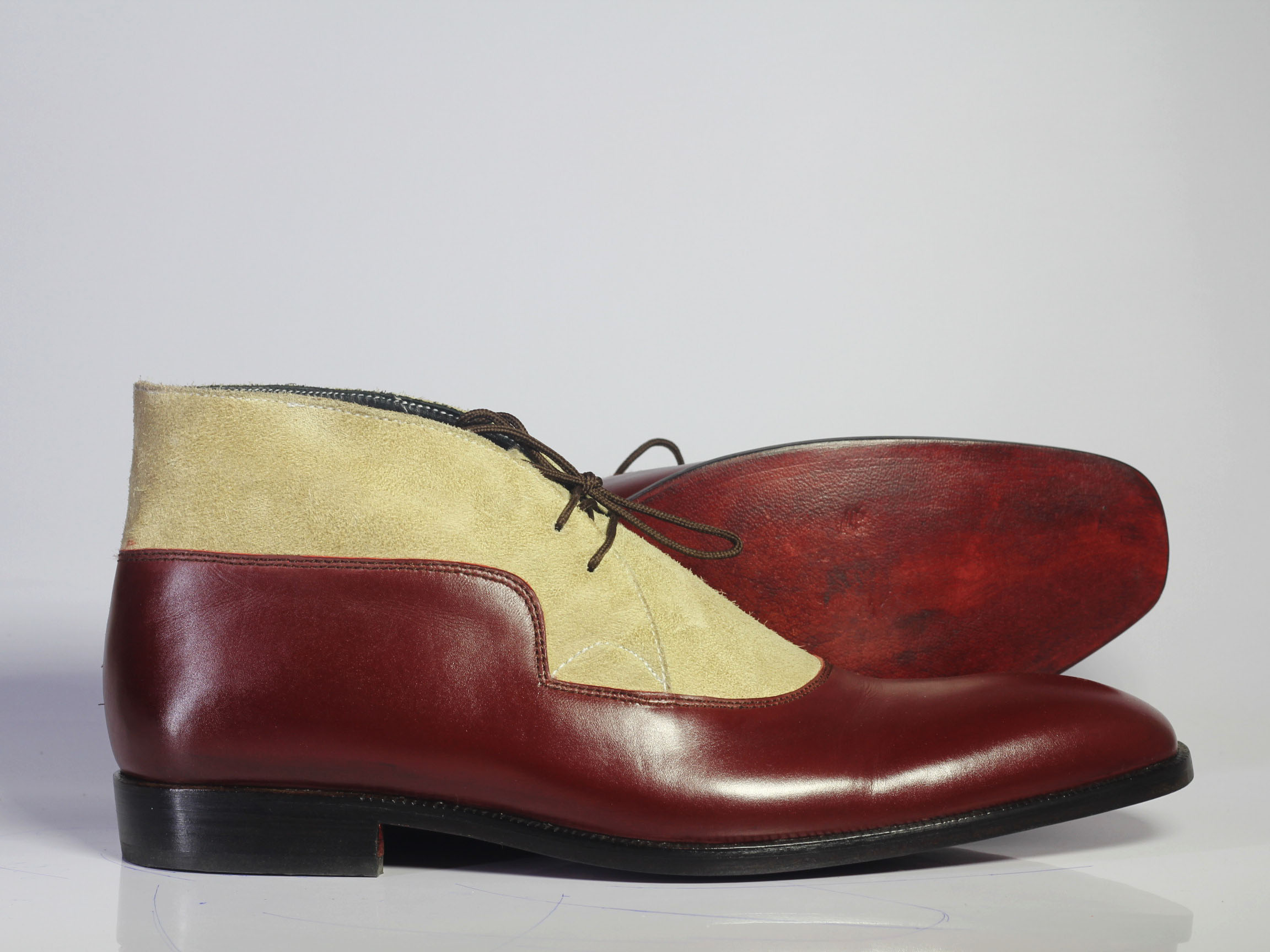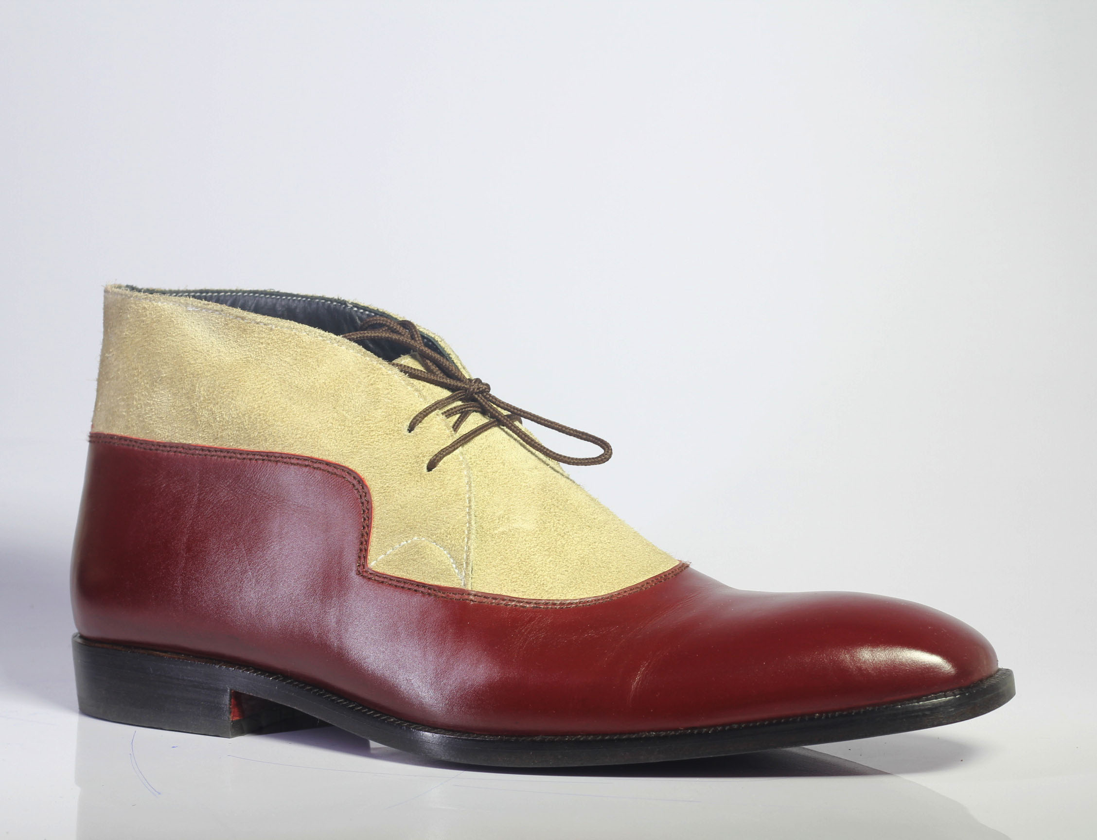 Handmade Men's Burgundy Beige Lace Up Leather Suede Shoes