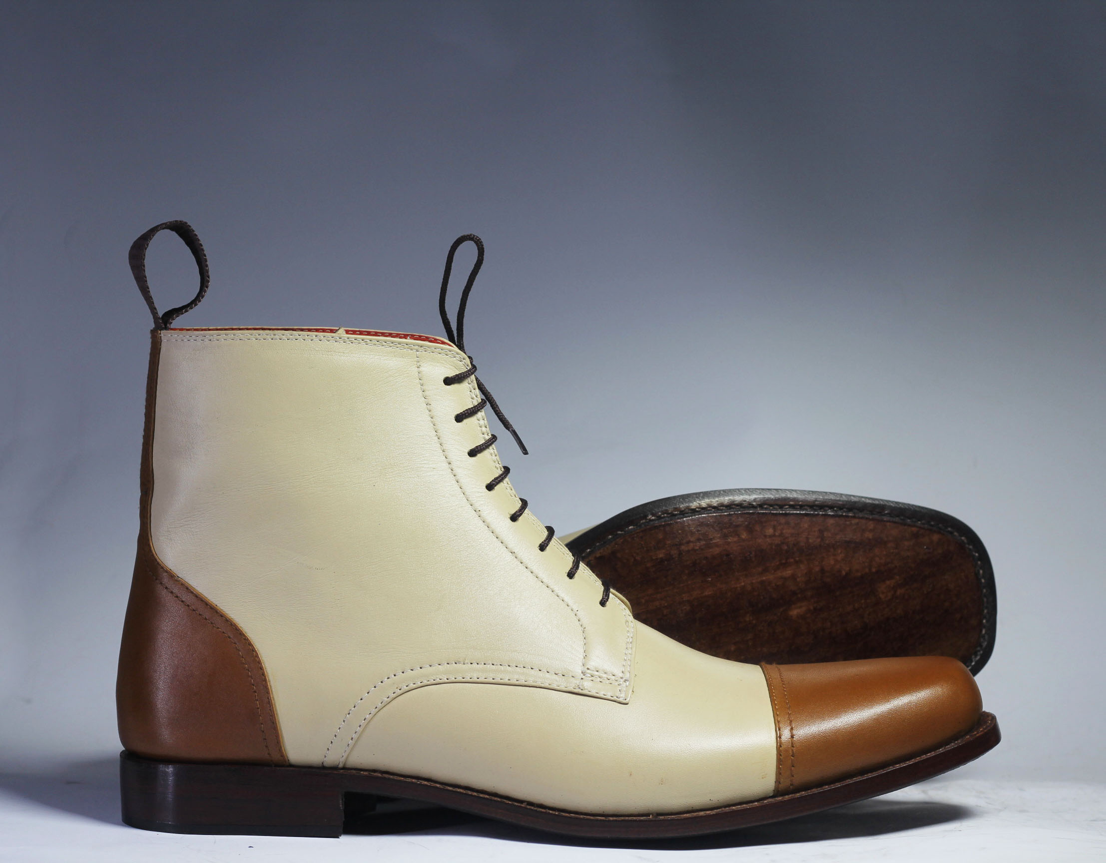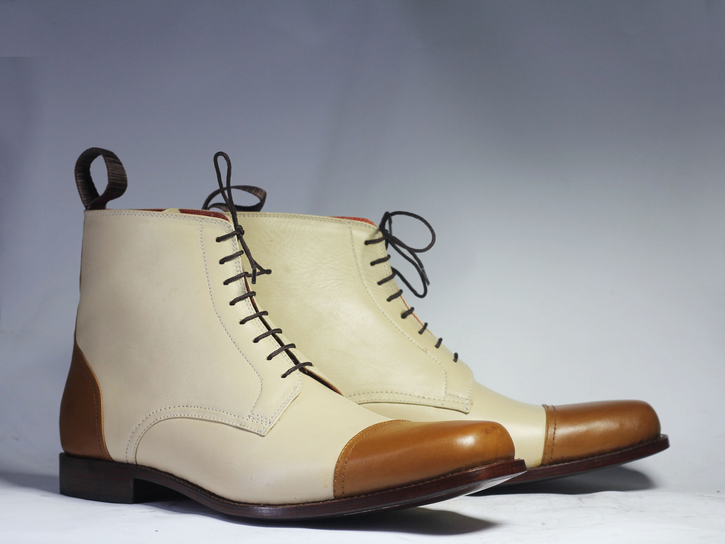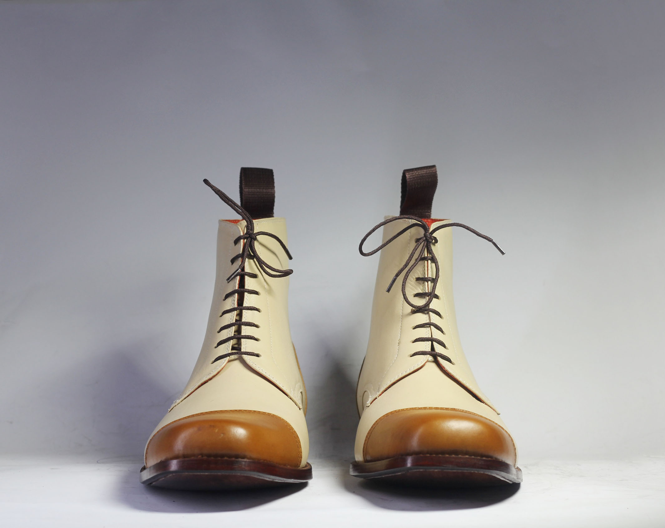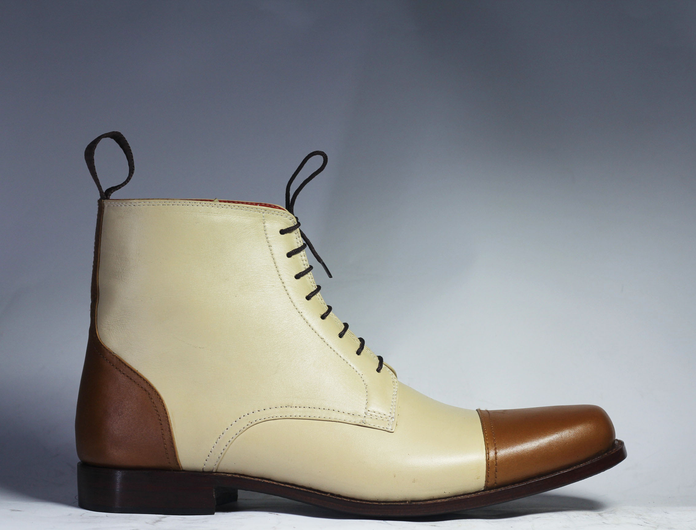 Ankle High Boots Brown White Cap Toe Lace Up Leather Handmade