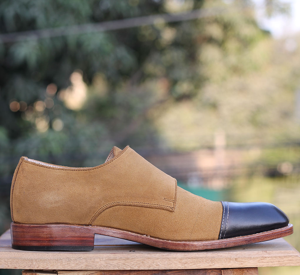 Handmade Cap Toe Double Monk Leather Suede Shoes