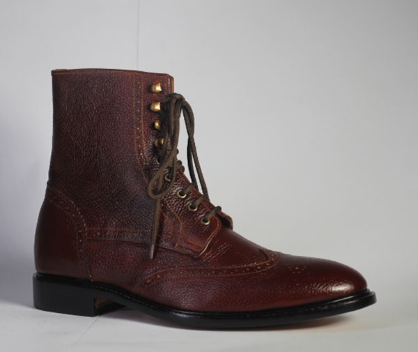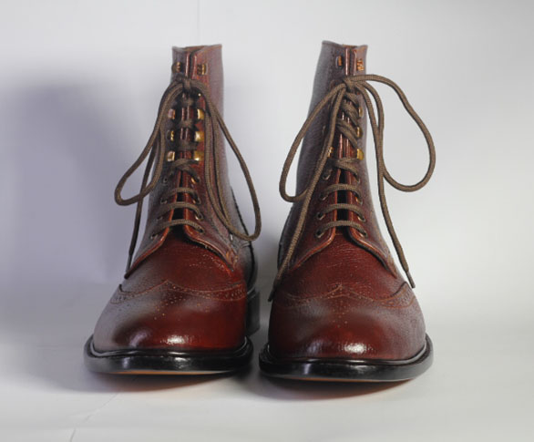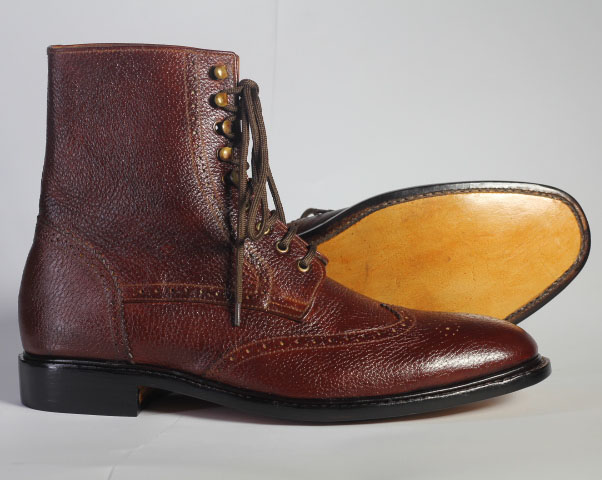 Handmade Ankle High Dark Brown Wing Tip Lace Up Pebbled Leather Boots