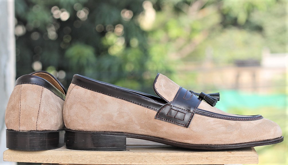 Handmade Men's Beige Suede Leather Tussle Slip On Shoes