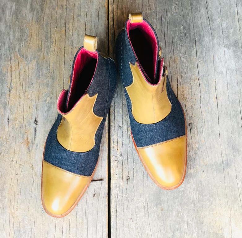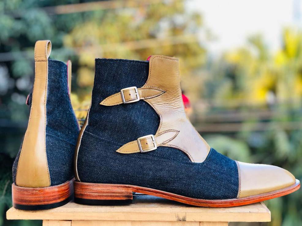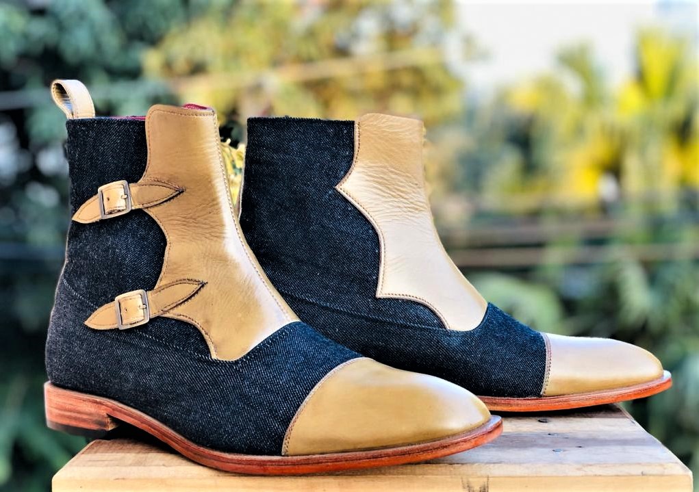 Handmade Ankle High Beige Blue Denim Leather Boots For Men