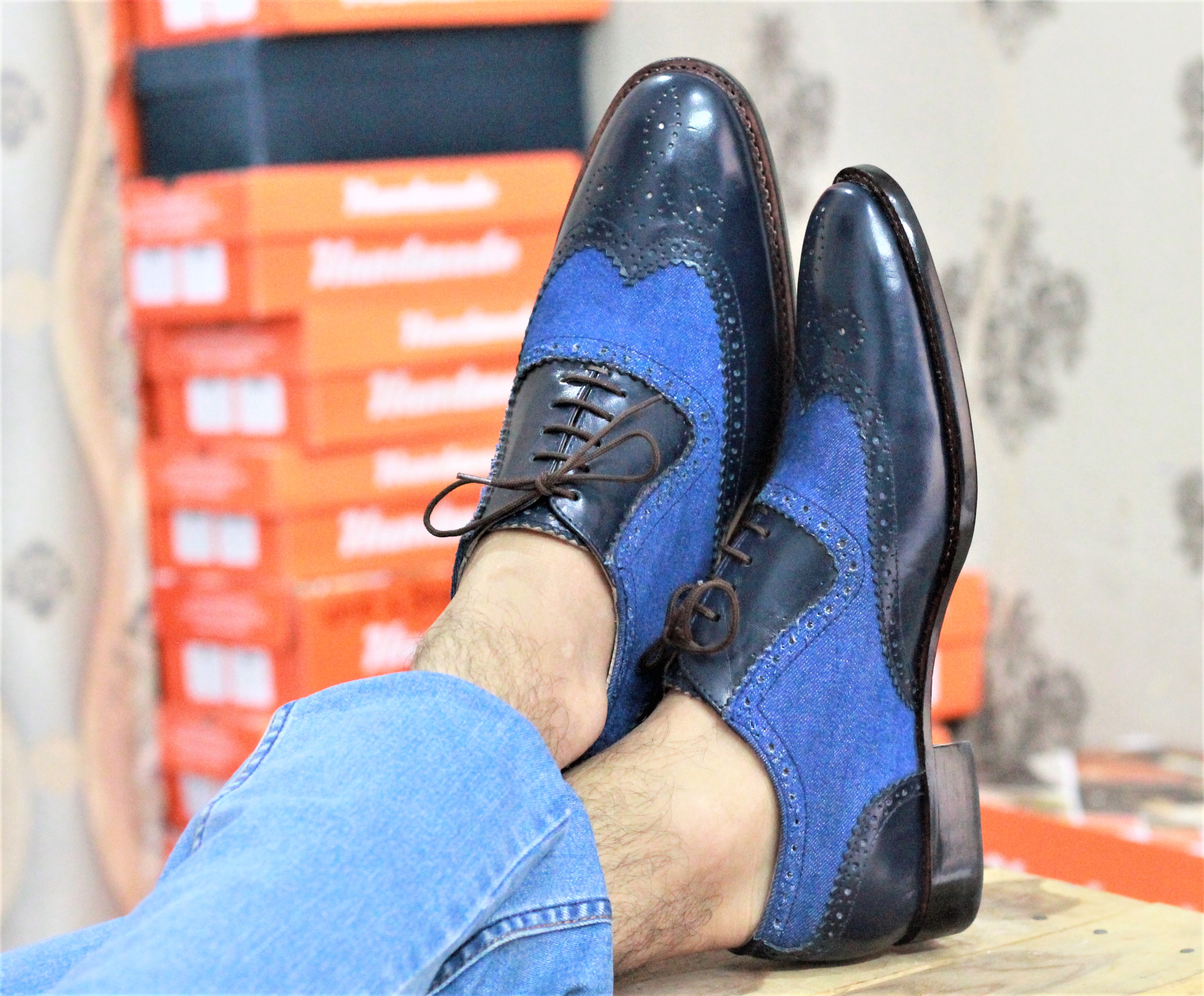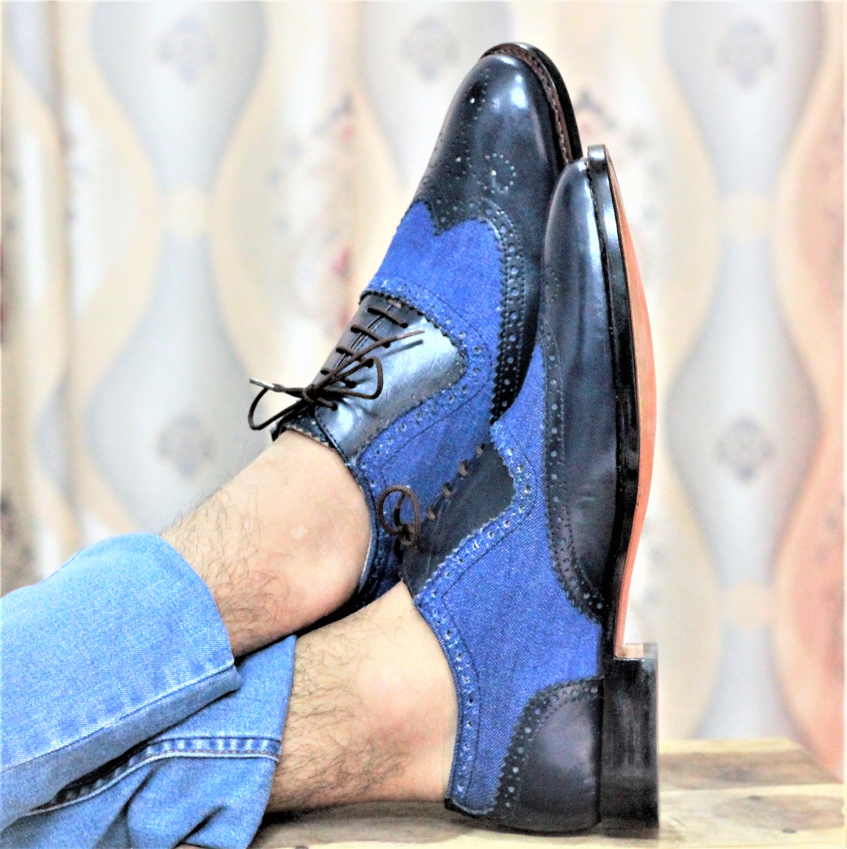 Handmade Men's Black Blue Denim Wing Tip Brogue Shoes