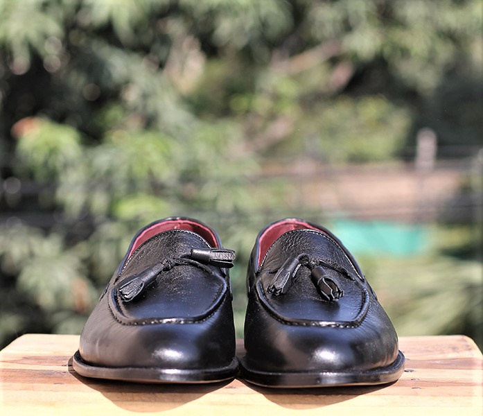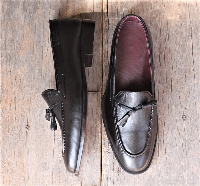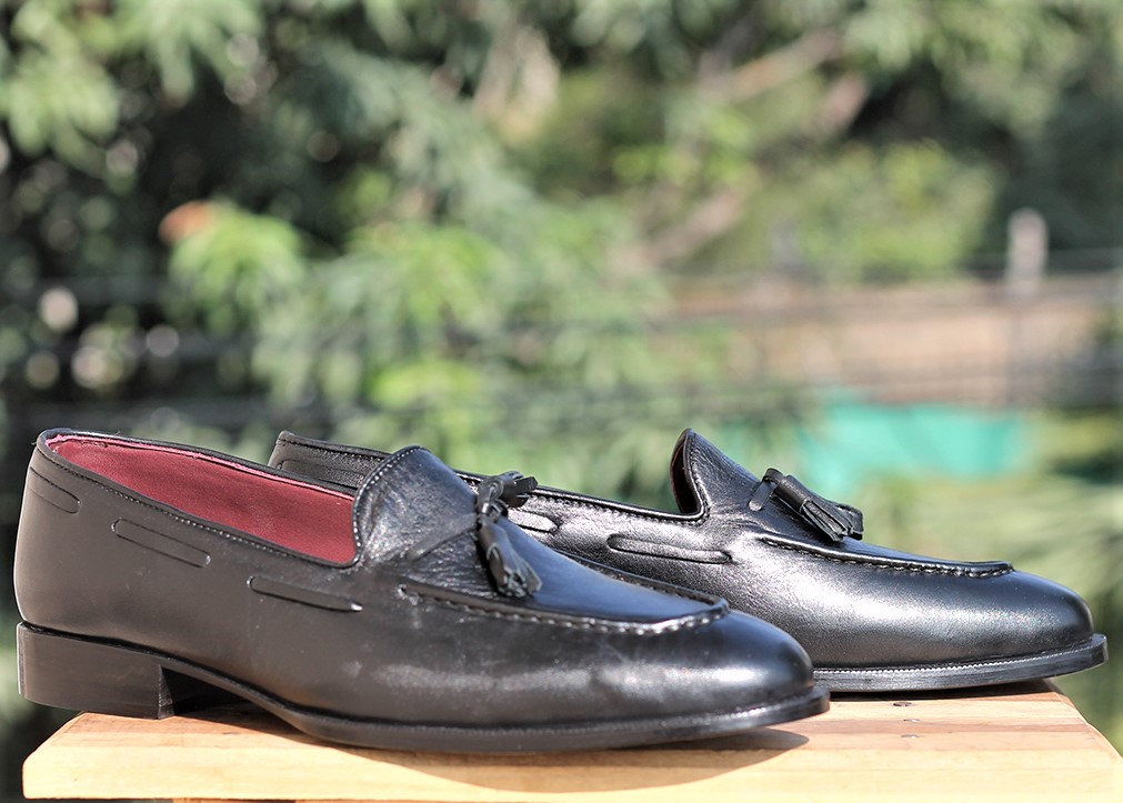 Handmade Men's Round Toe Black Leather Tussle Loafers