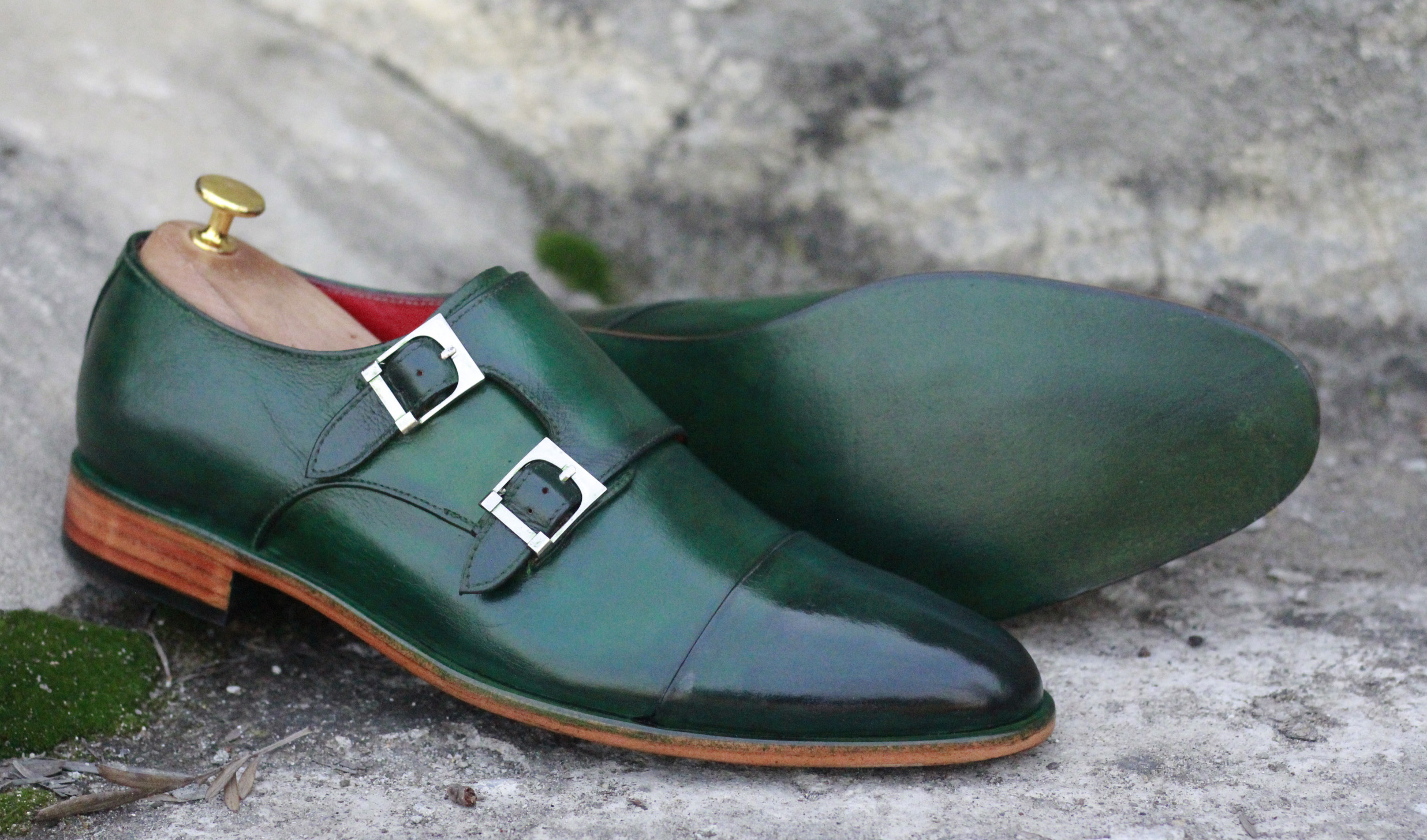 Men's Green Stylish Double buckle Cap Toe Leather Shoes