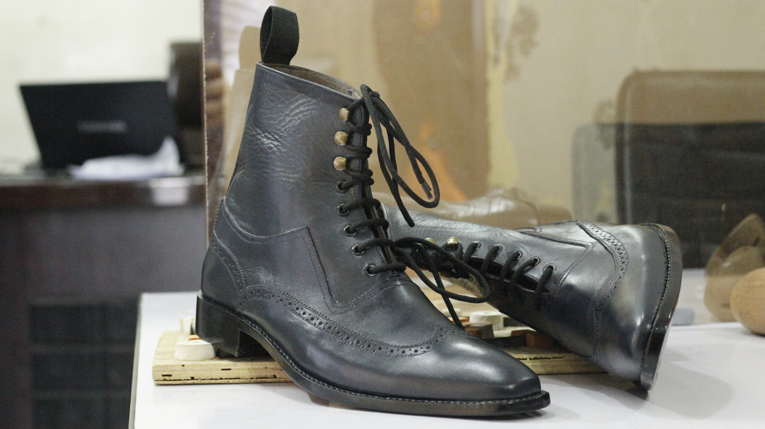 Black Brogue Wing Tip Ankle High Men's Leather Lace Up Boot