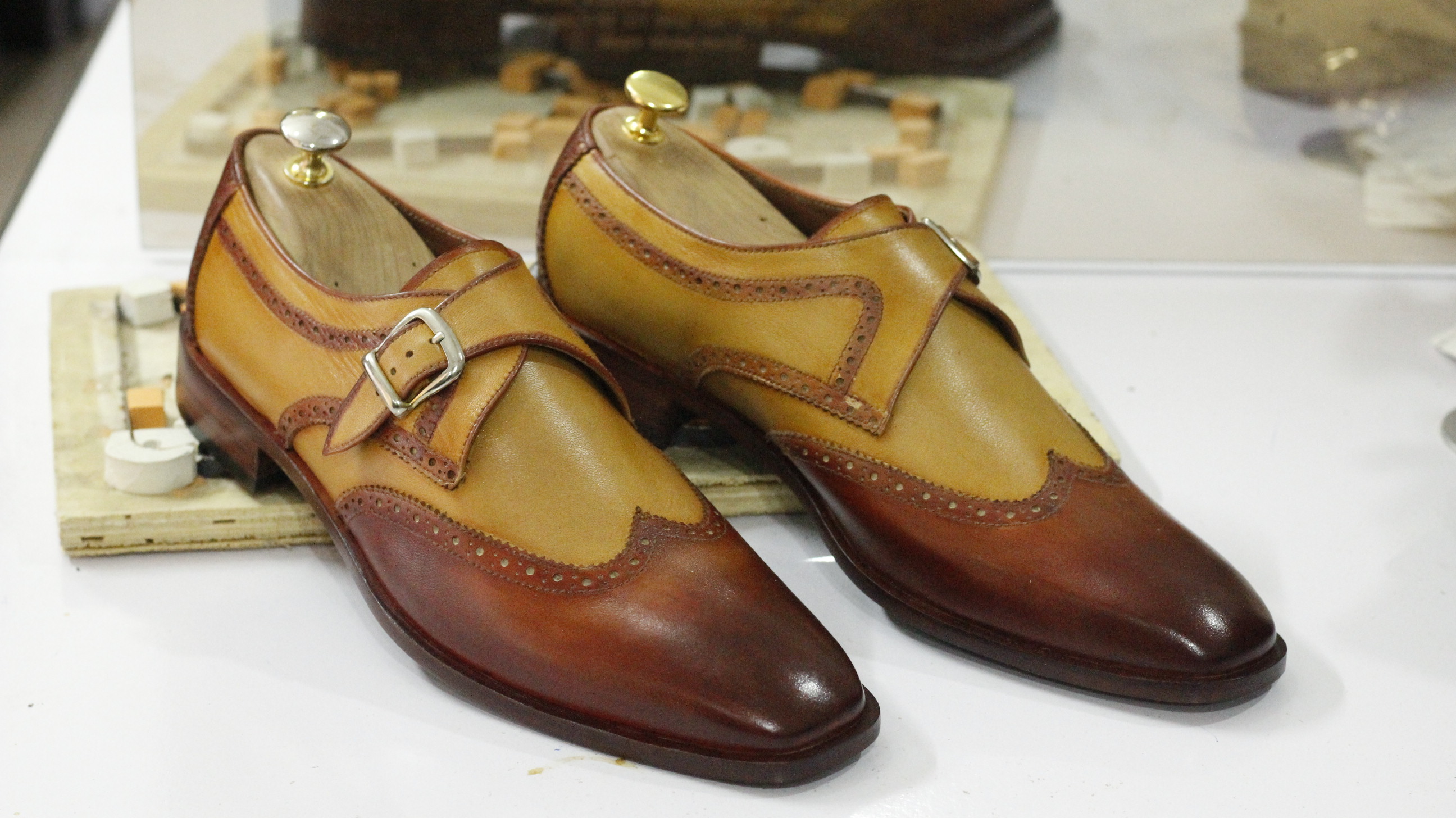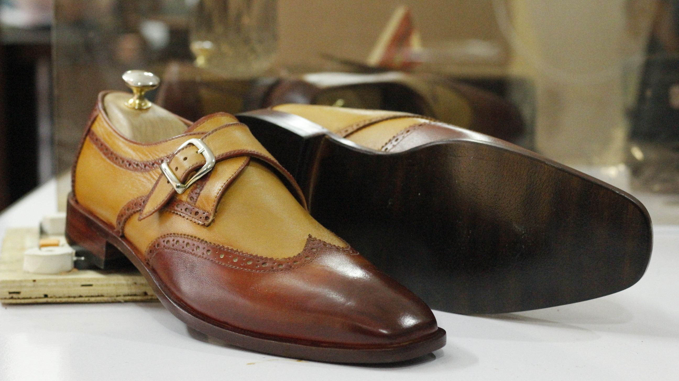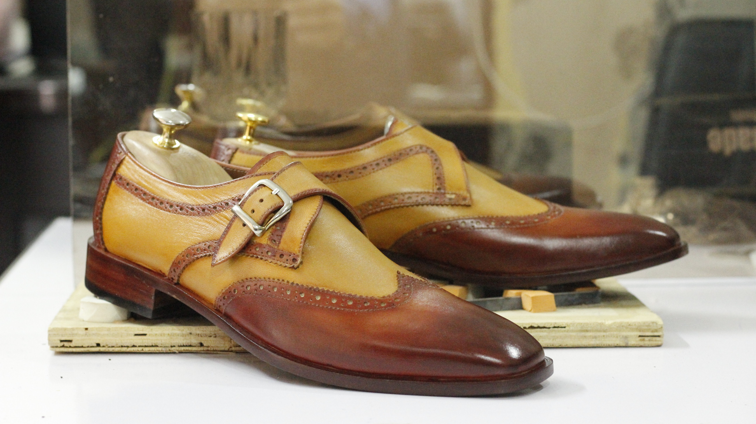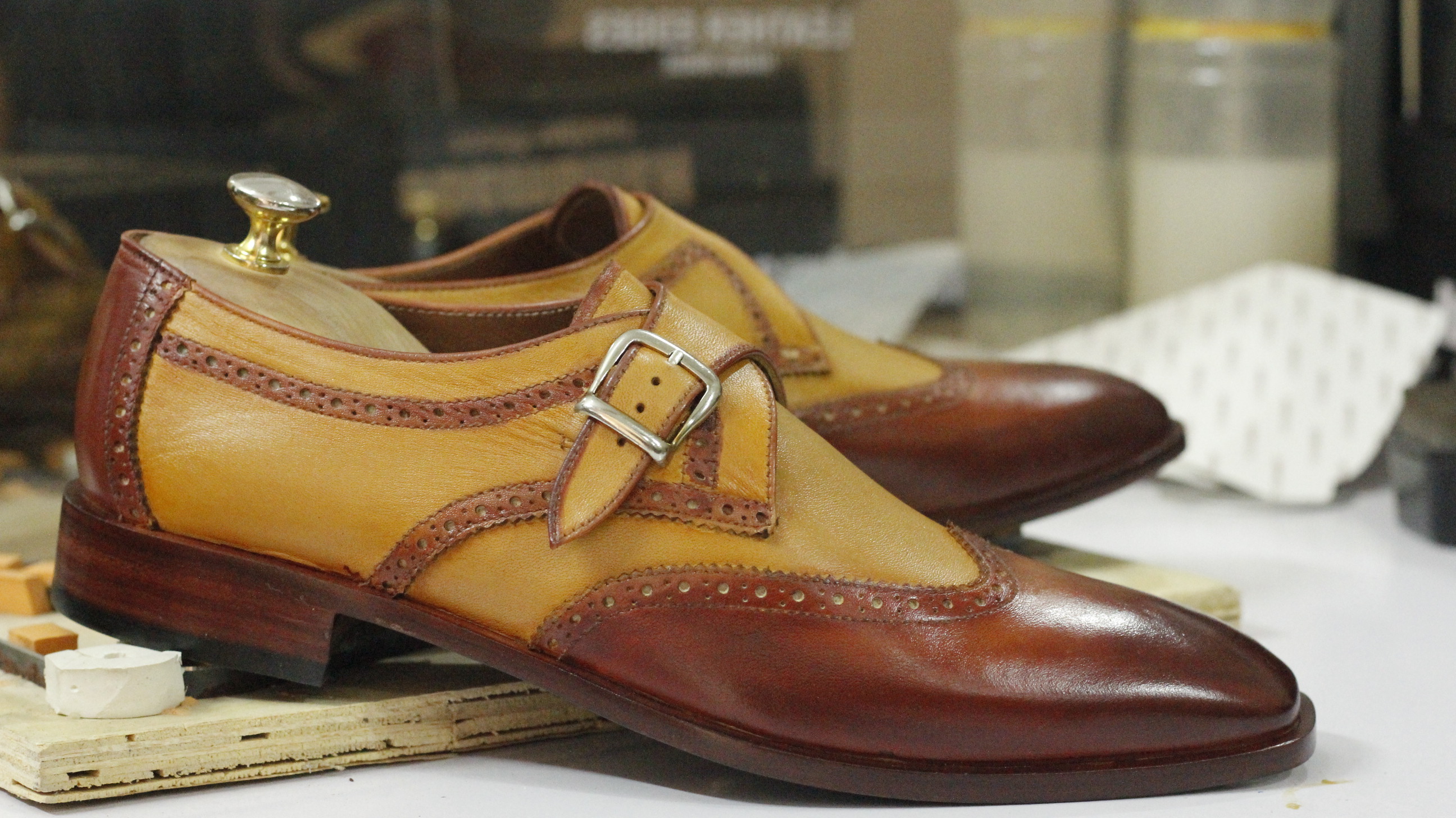 Mustered & Brown Leather Monk Wing Tip Brogue Shoes