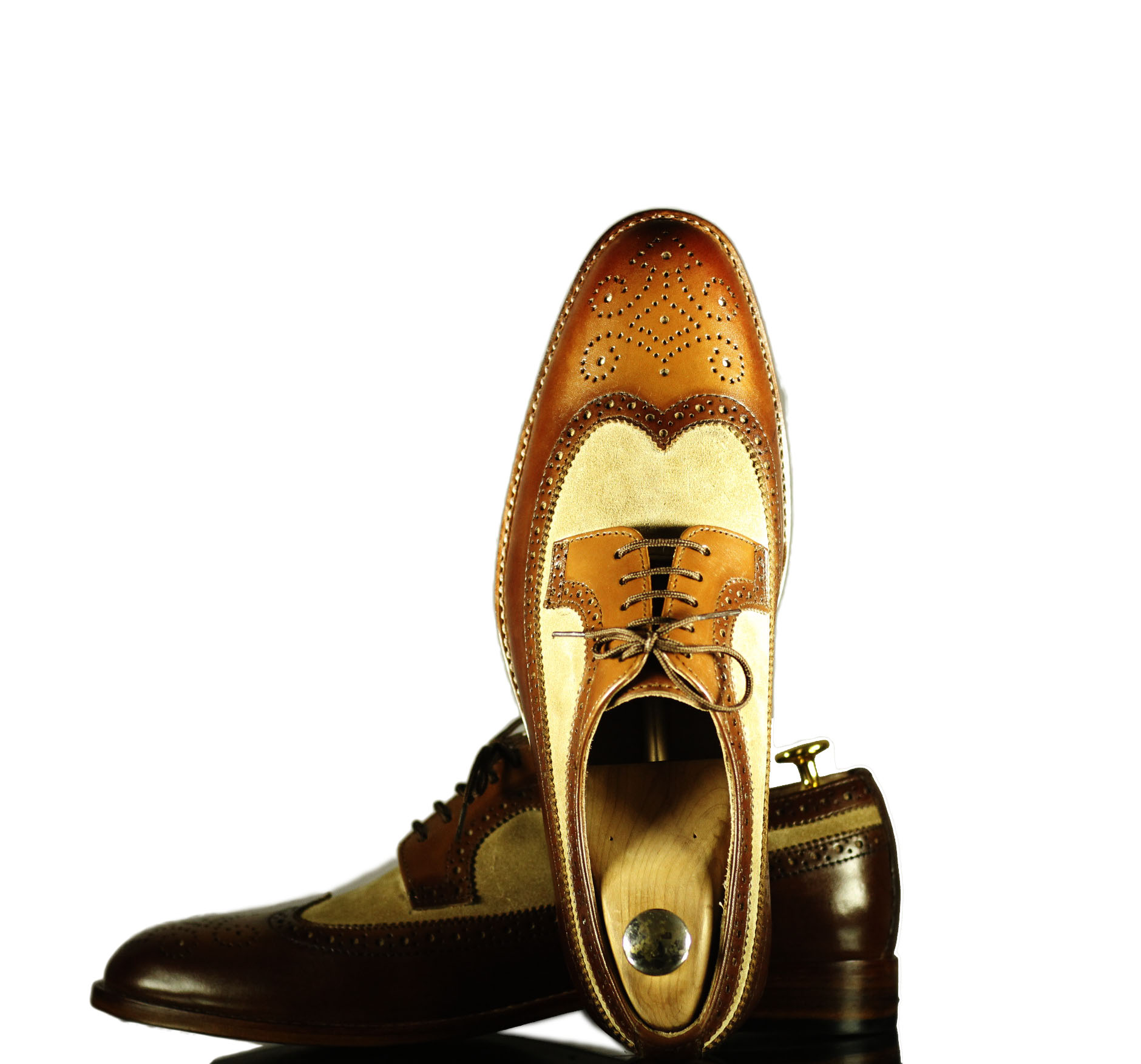 Brown Beige Wing Tip Lace Up Suede Leather Shoes