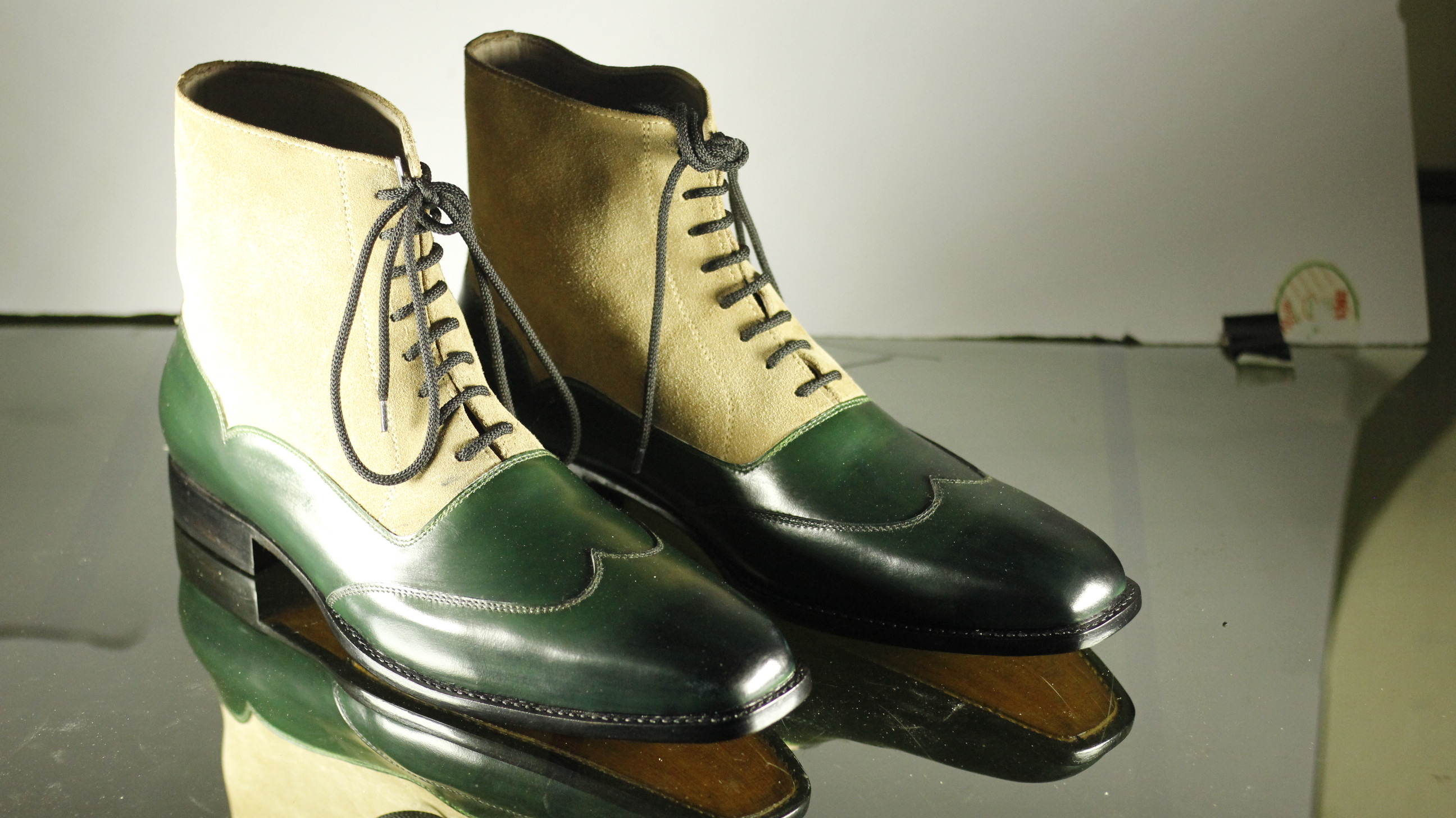 Green & Beige Two Tone Wing Tip Lace Up Leather Suedes Boot