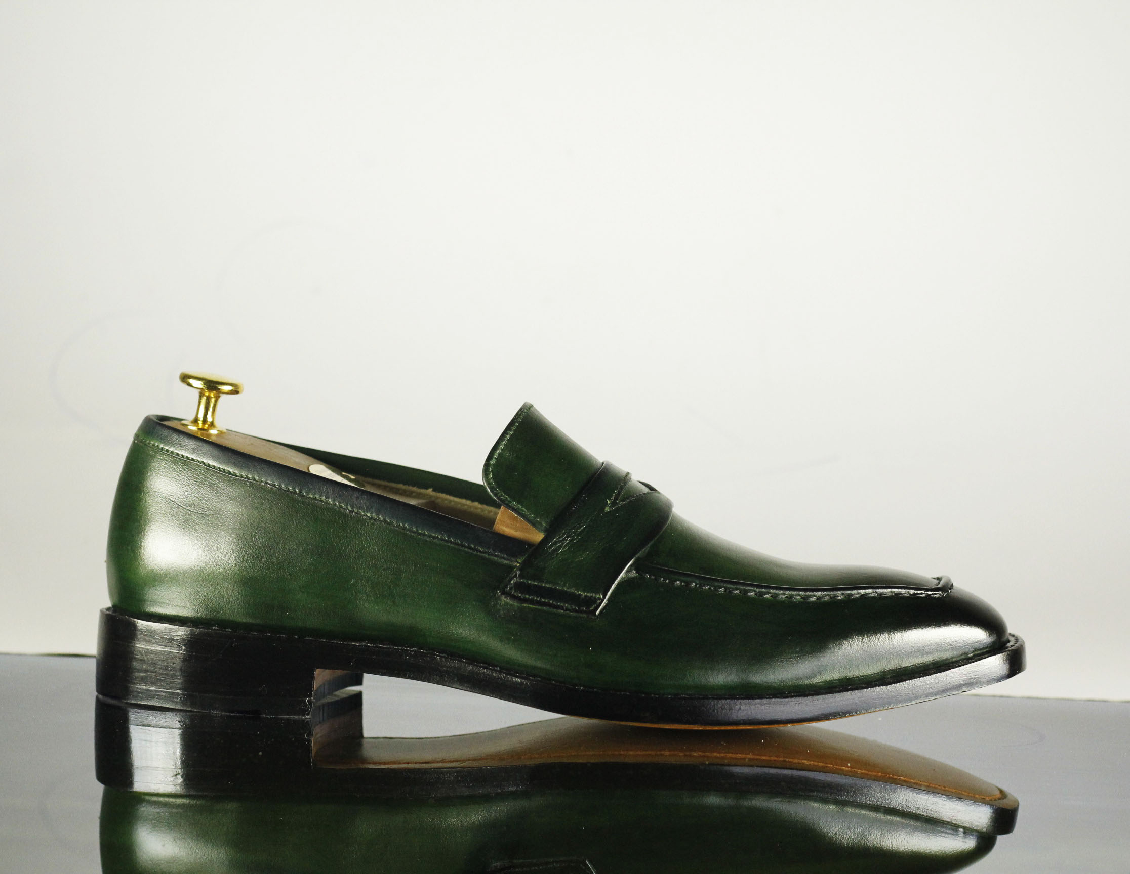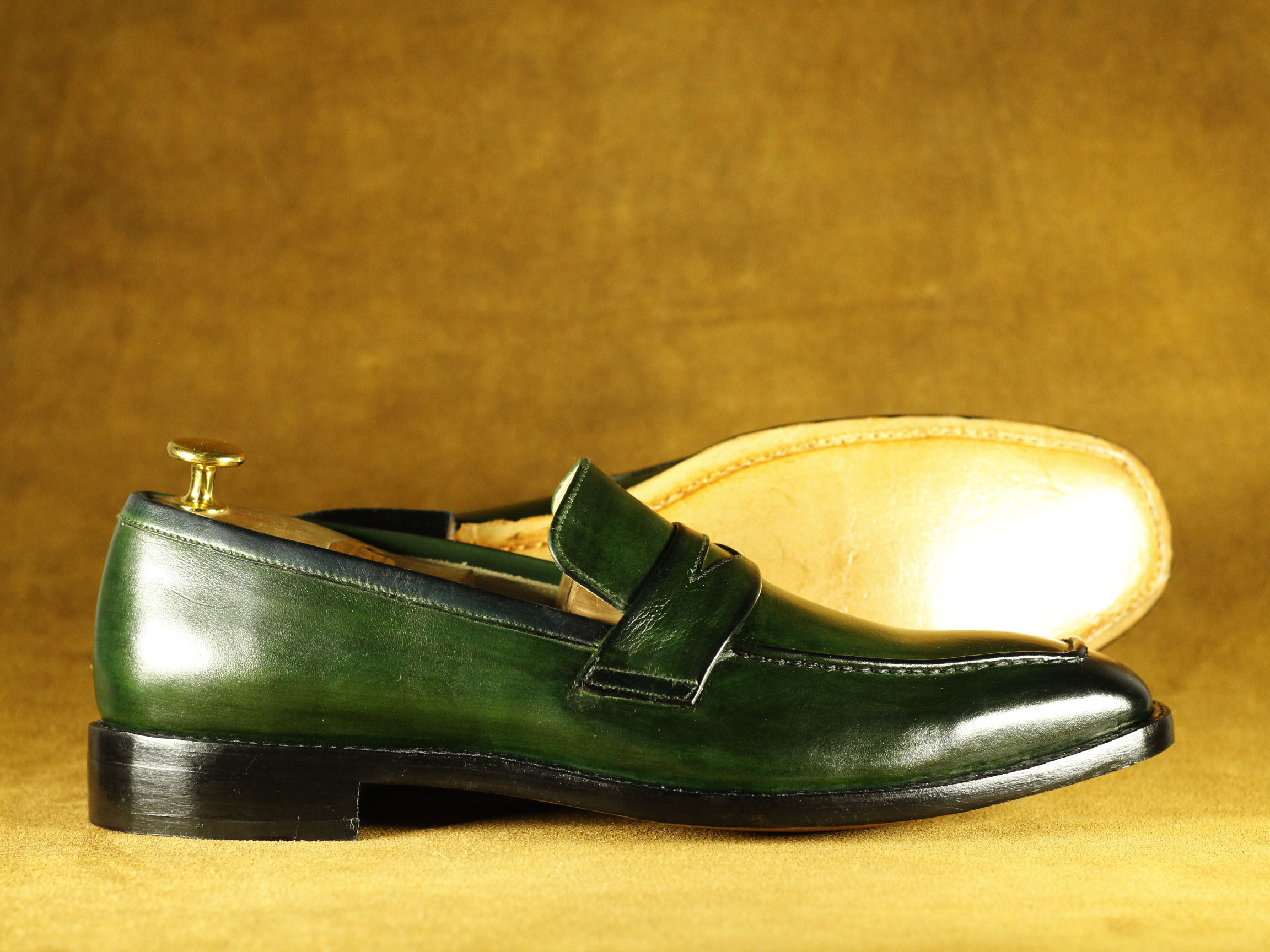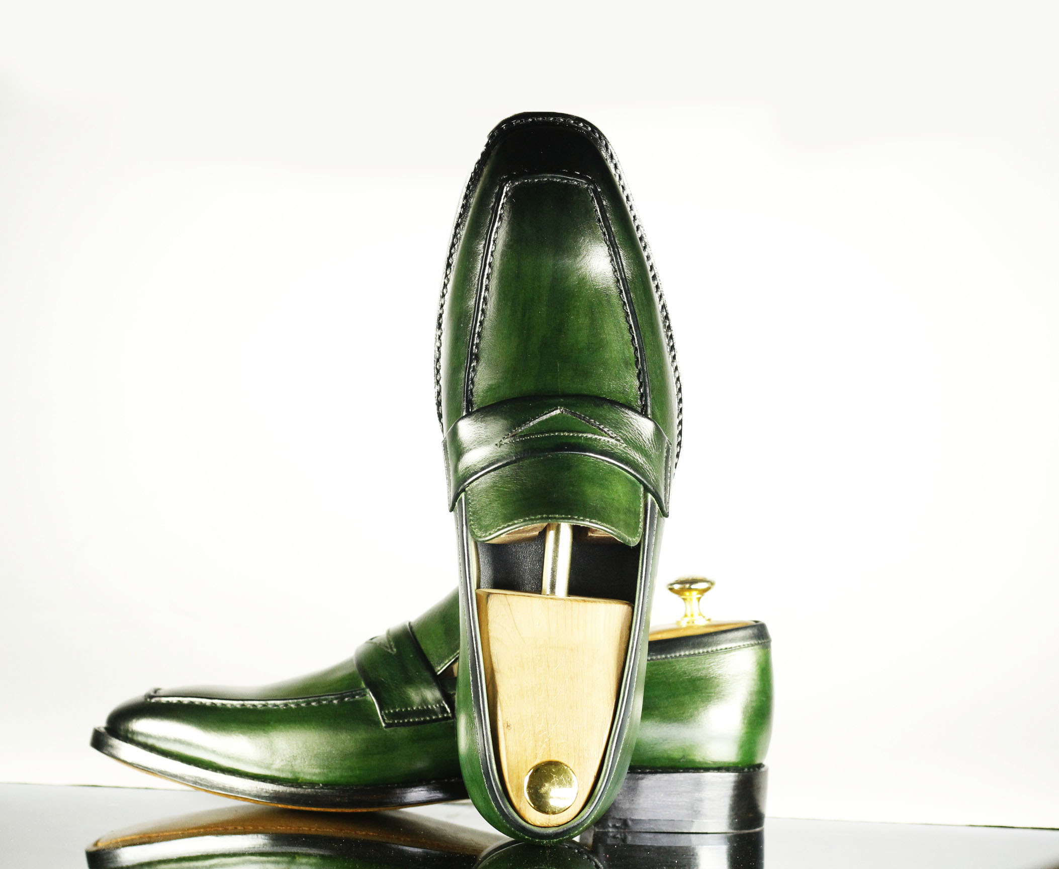 Hand Painted Men's Green Square Toe Slip On Leather Shoes