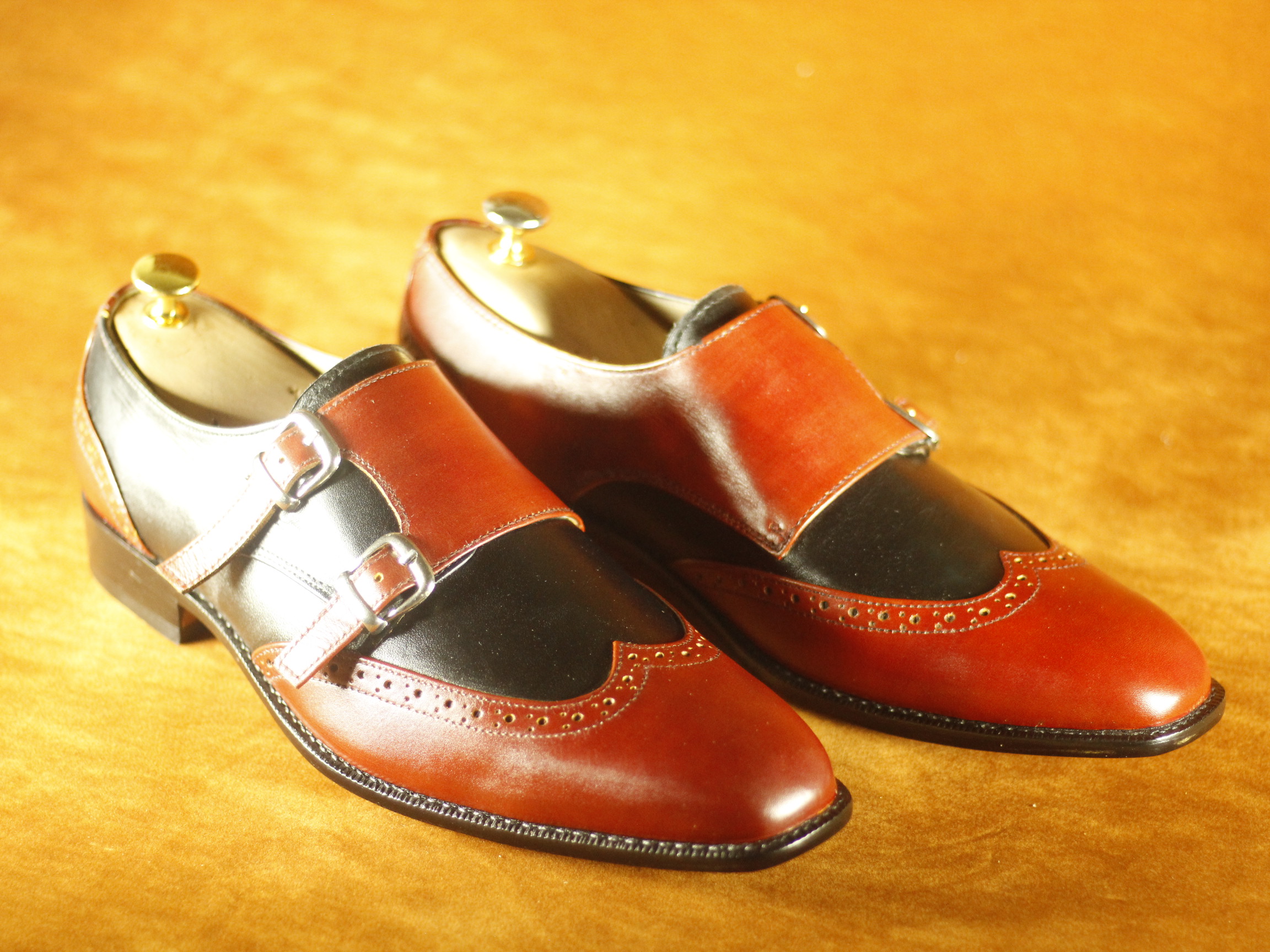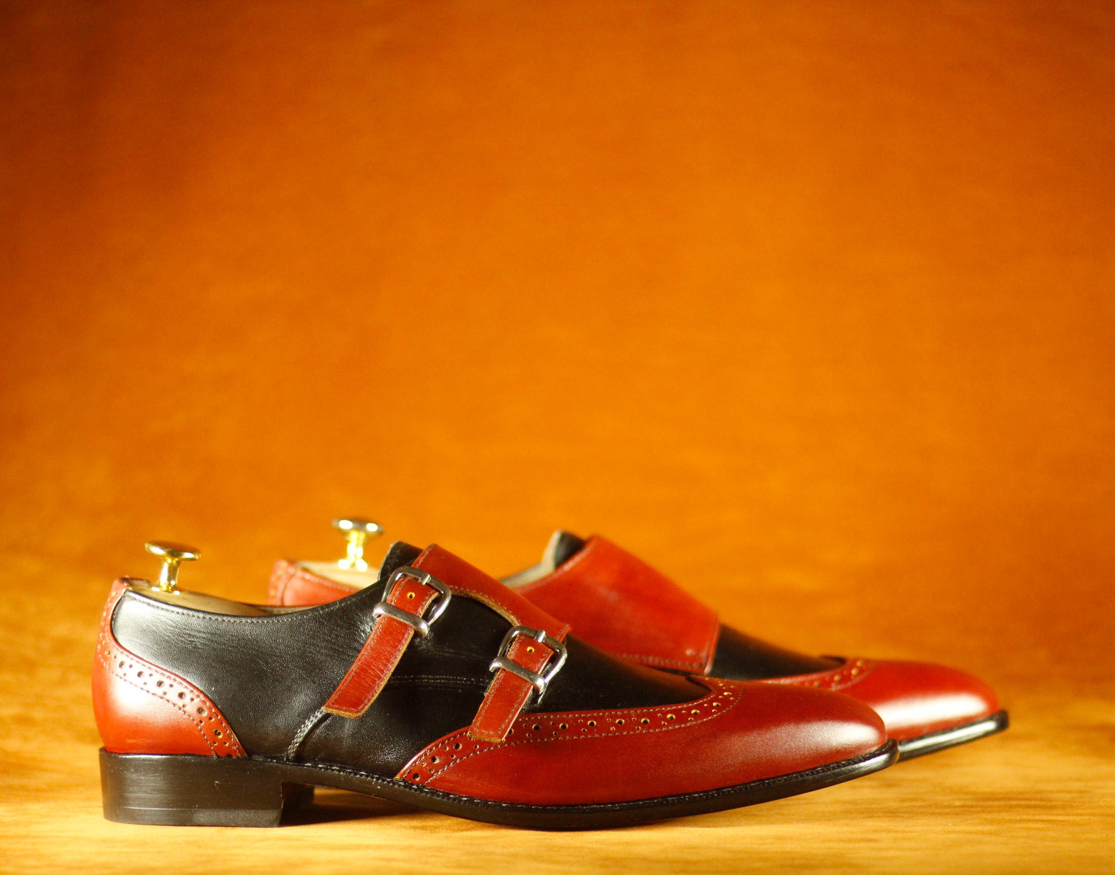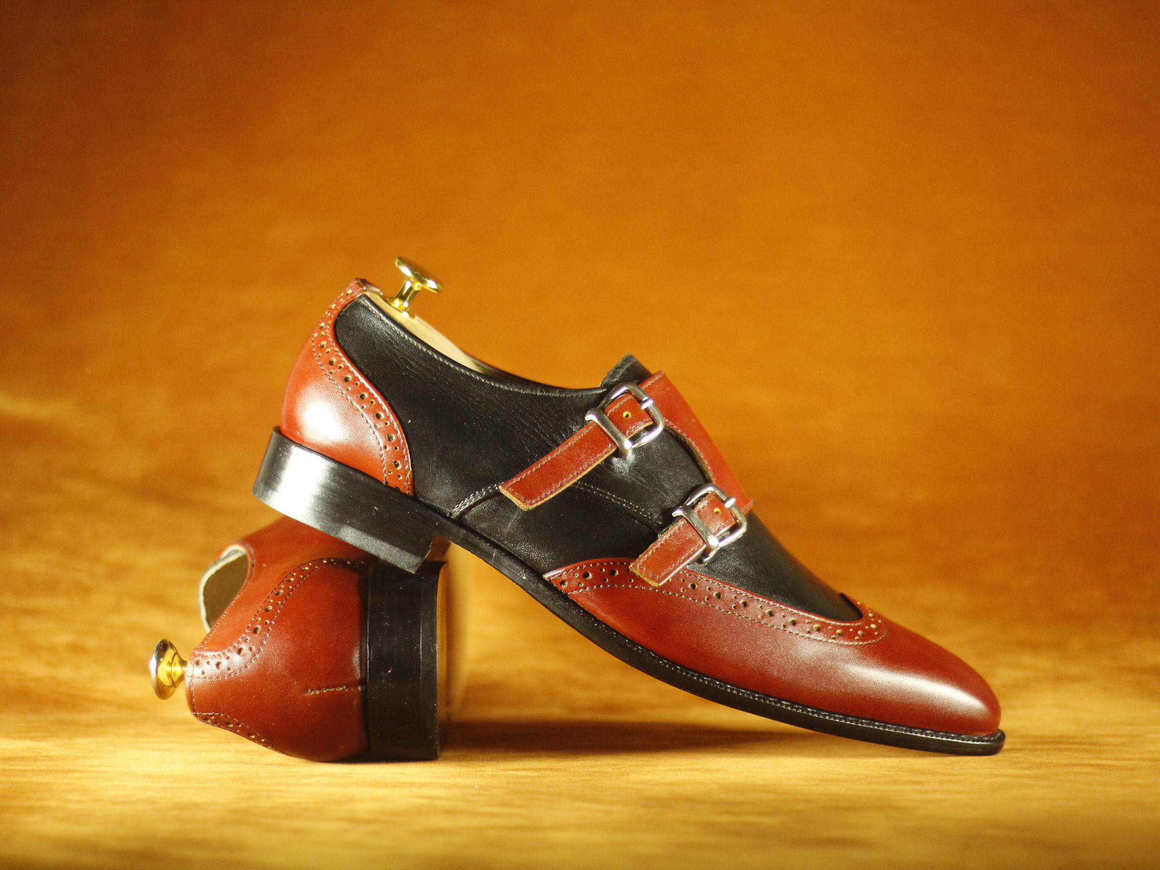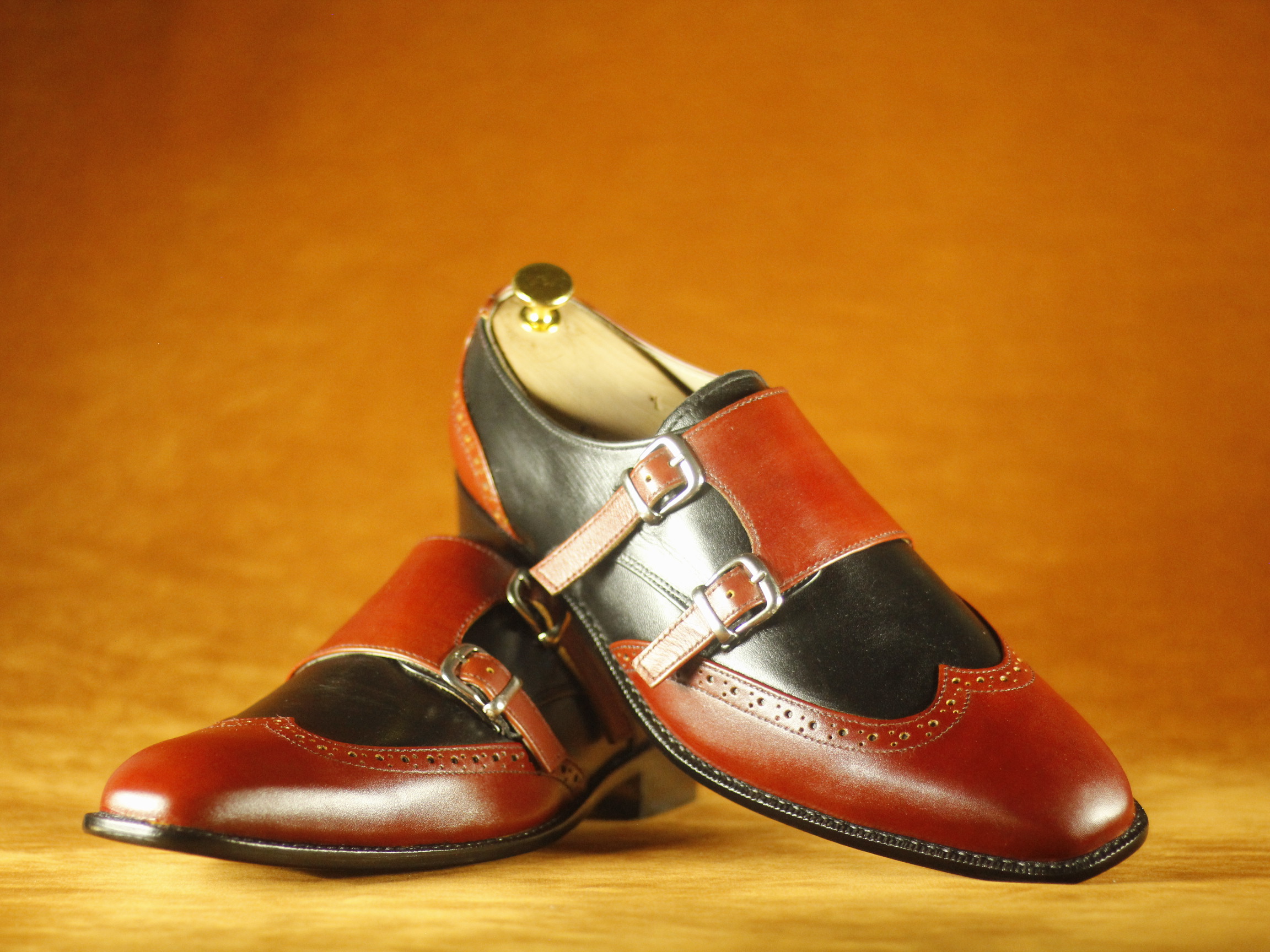 Two Tone Stylish Burgundy & Black Wing Tip Double Monk Leather Shoes