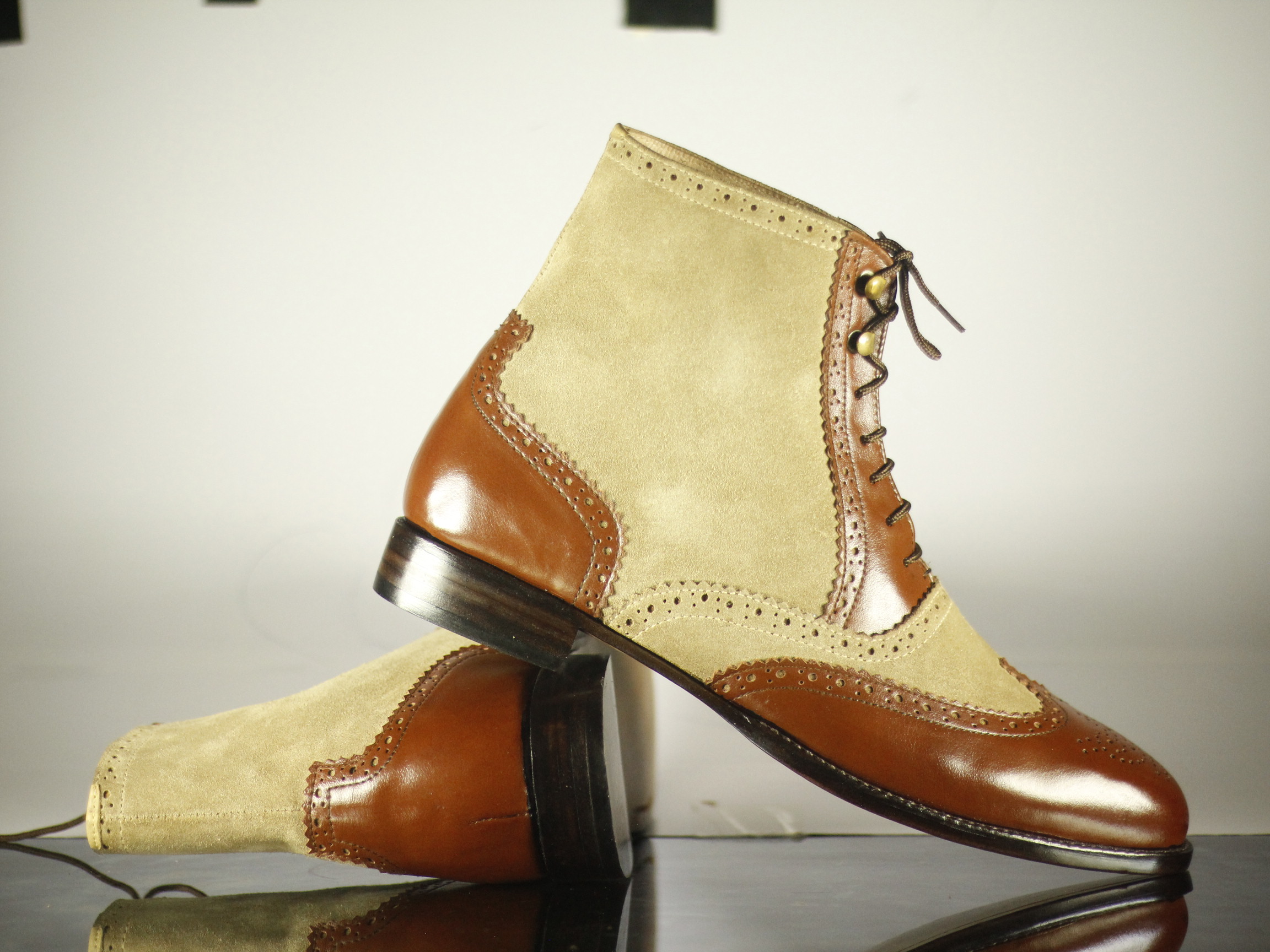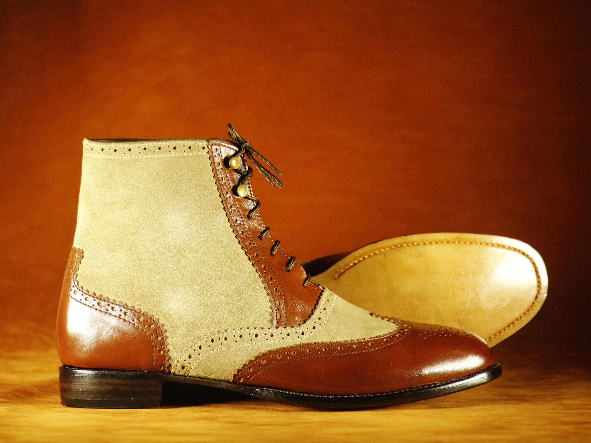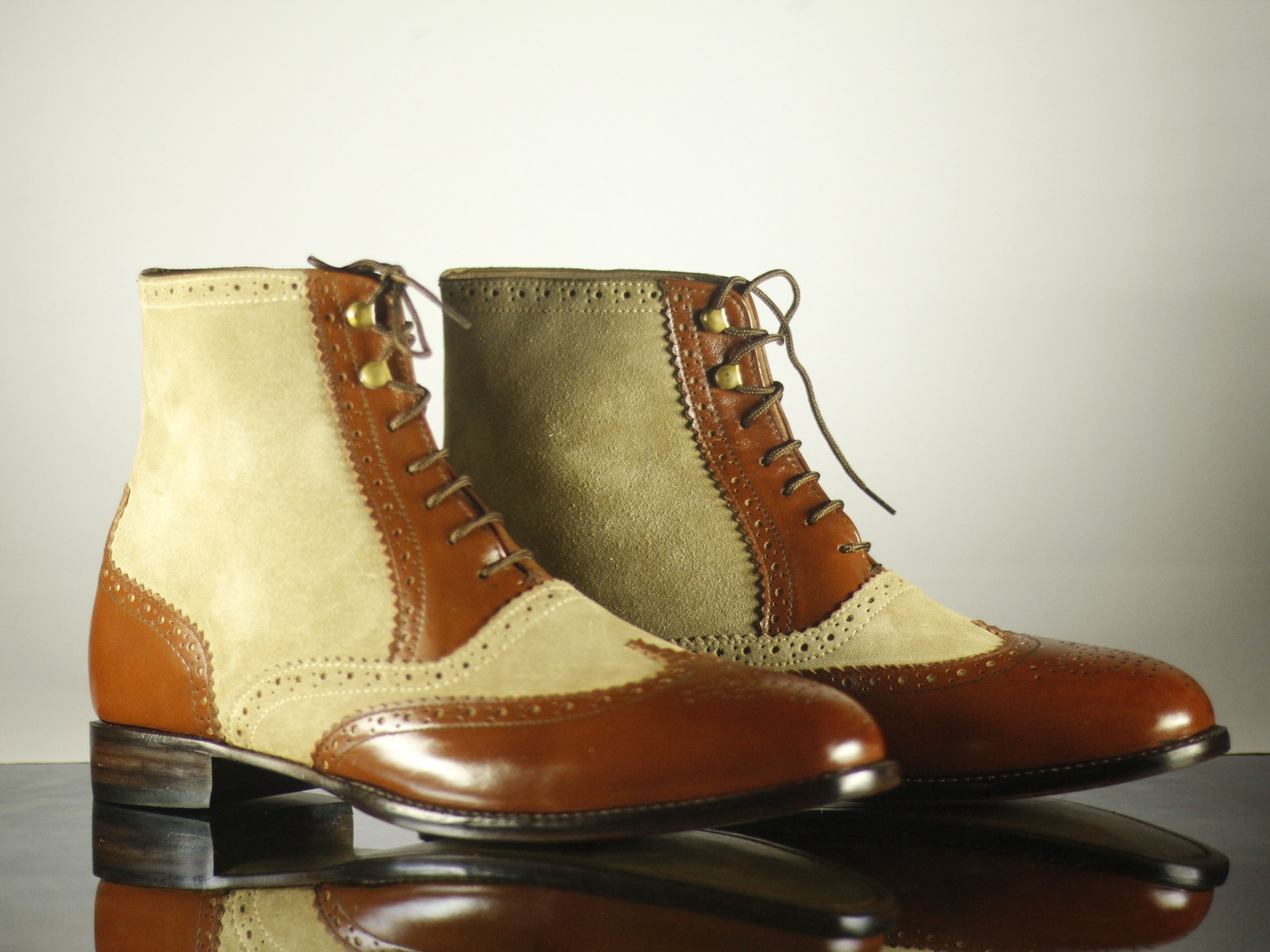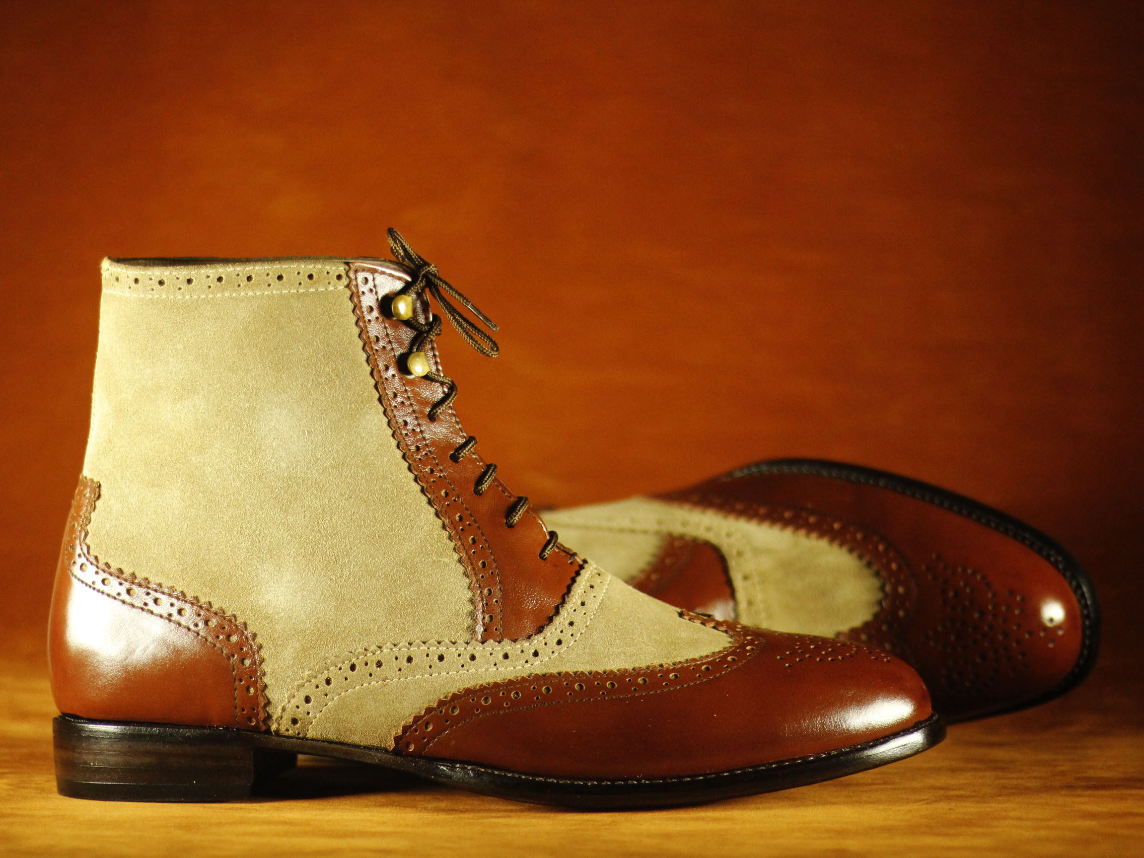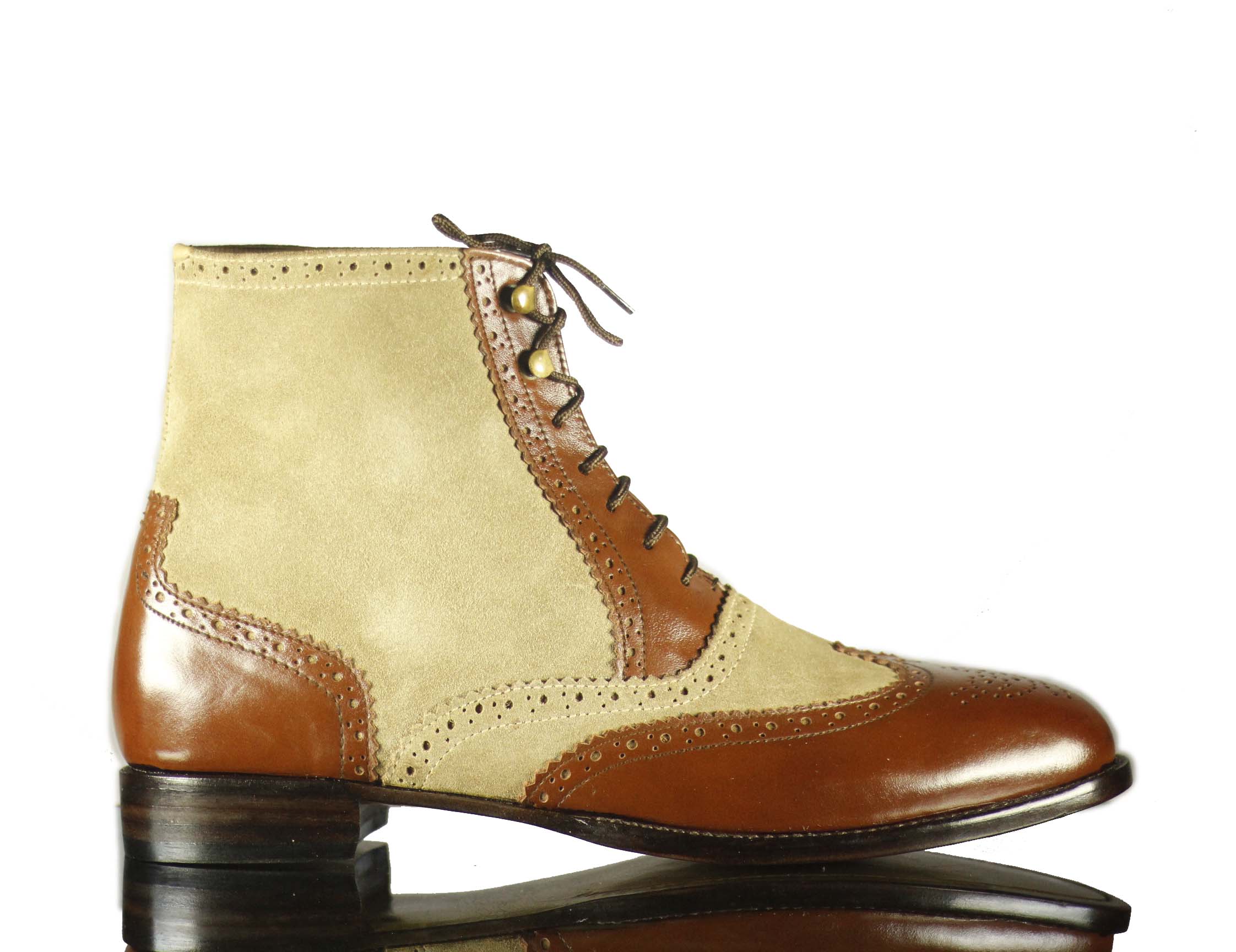 Classy Brown & Beige Suede Wing Tip Ankle High Leather Boot