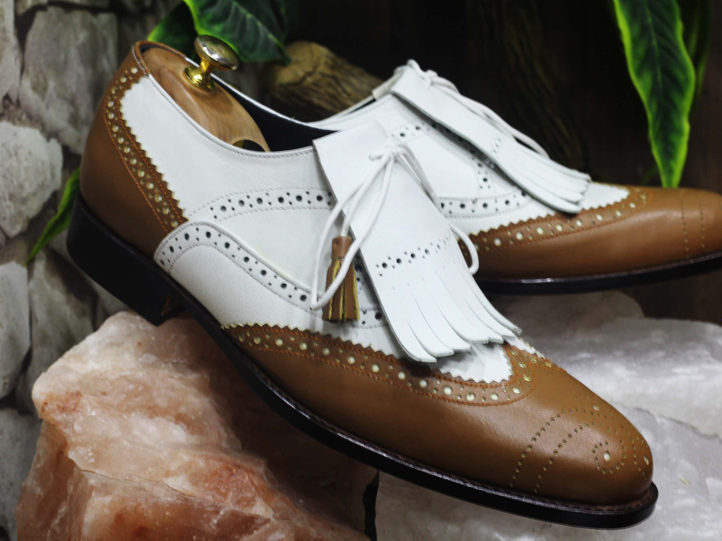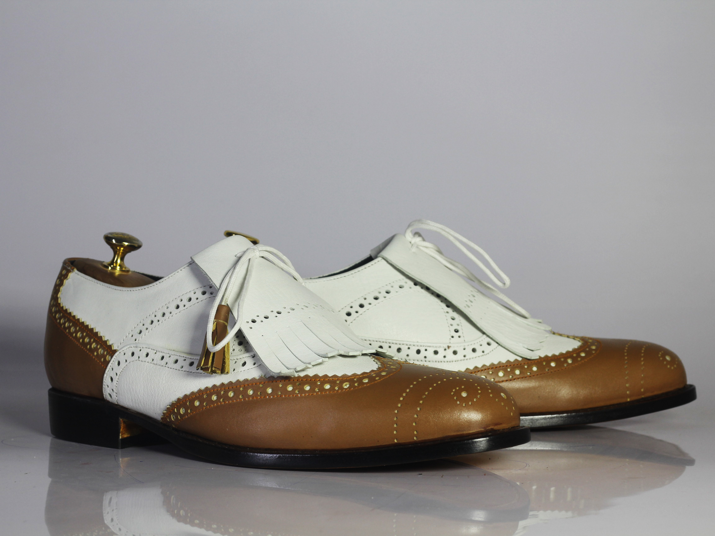 White & Brown Wing Tip Fringe Brogue Leather Shoes