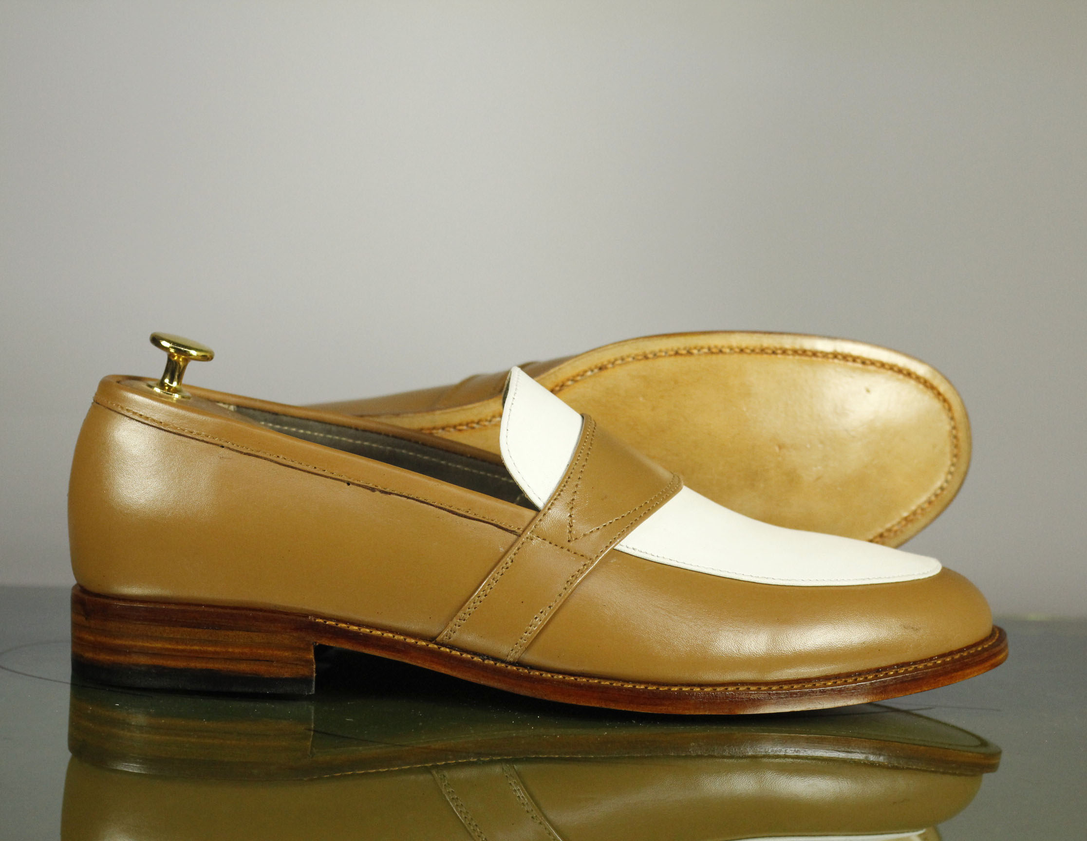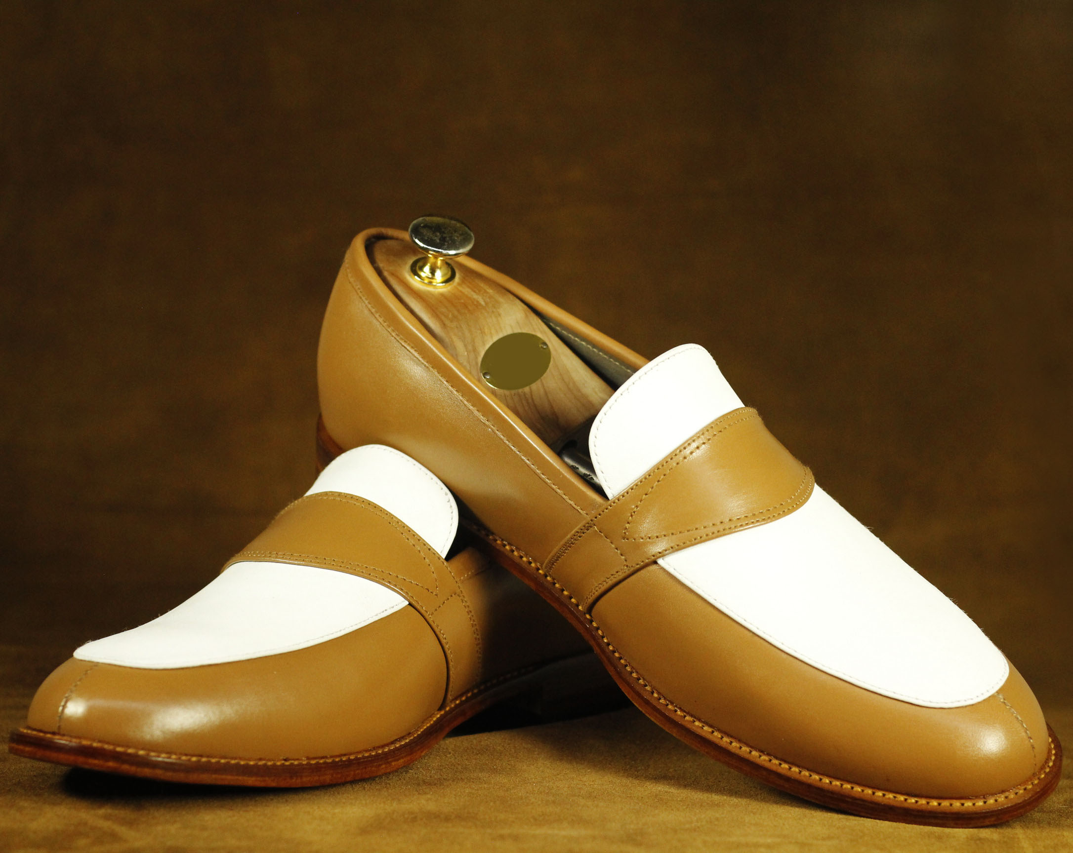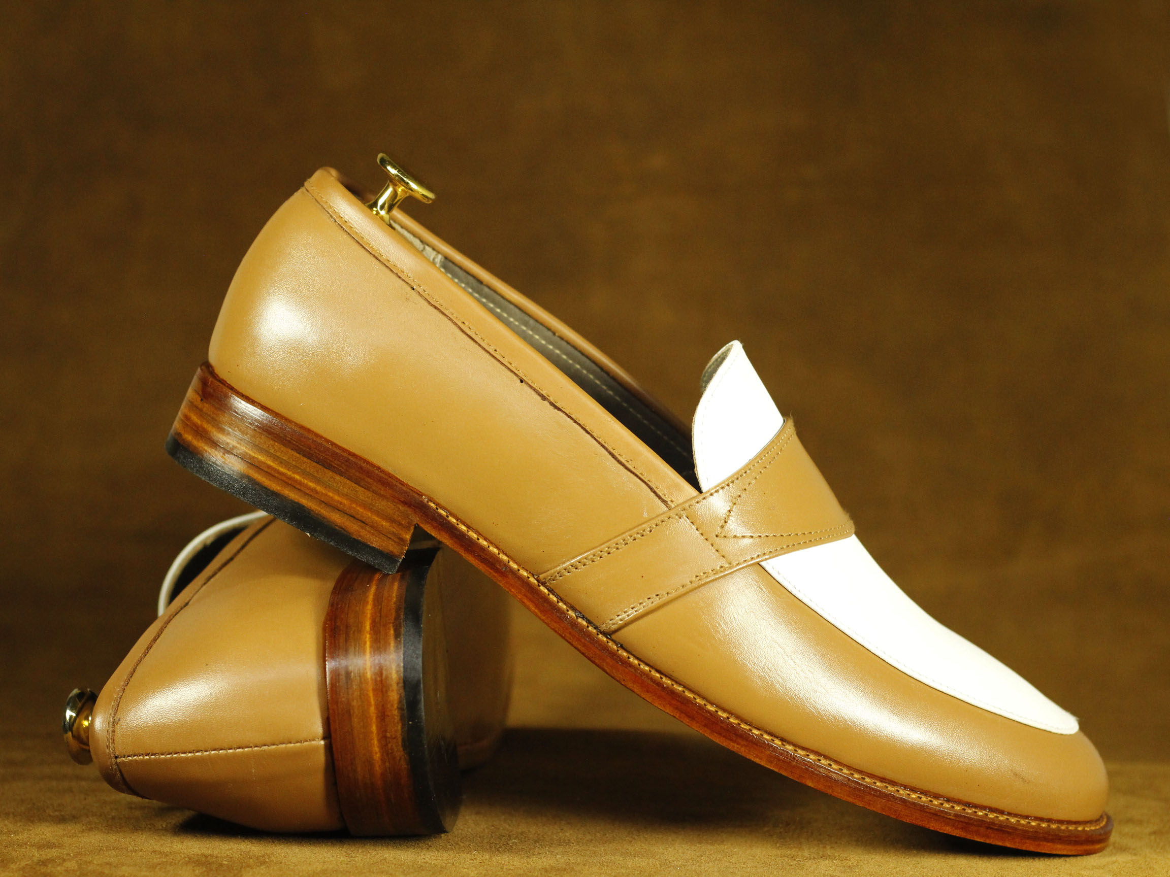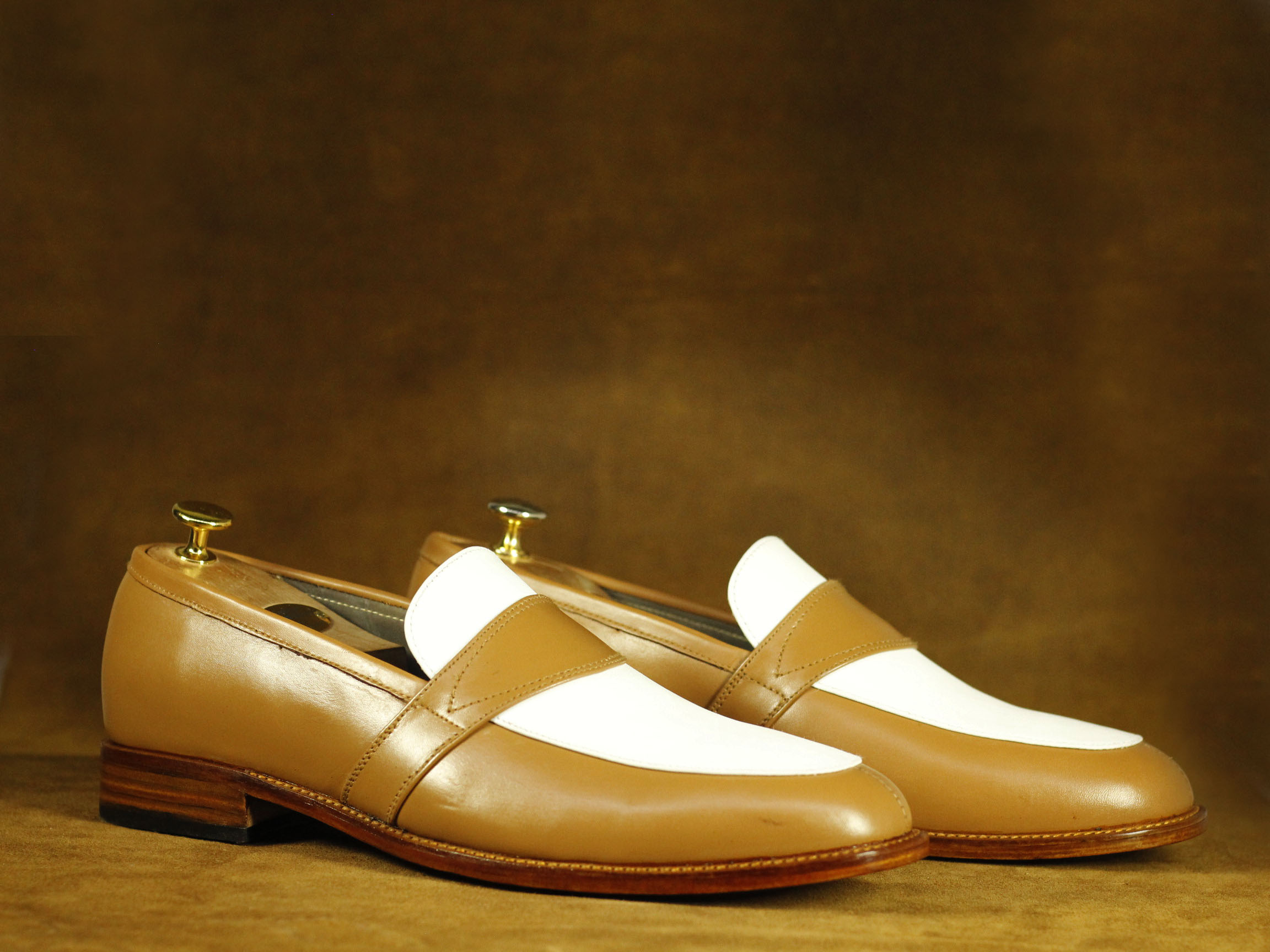 Slip On Tan White Two Tone Round Toe Leather Loafers