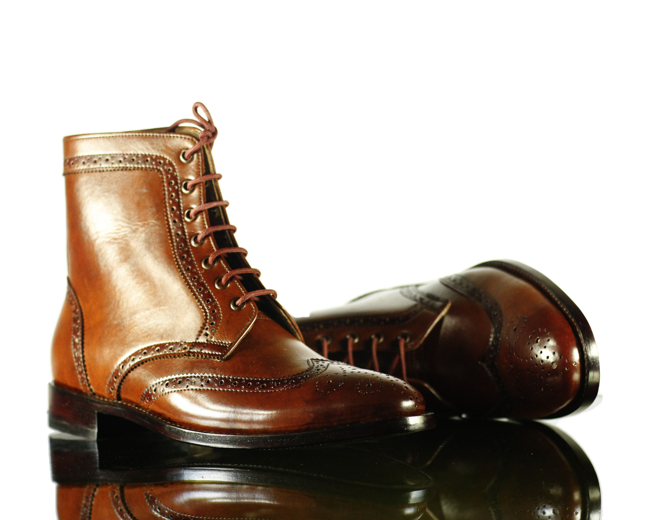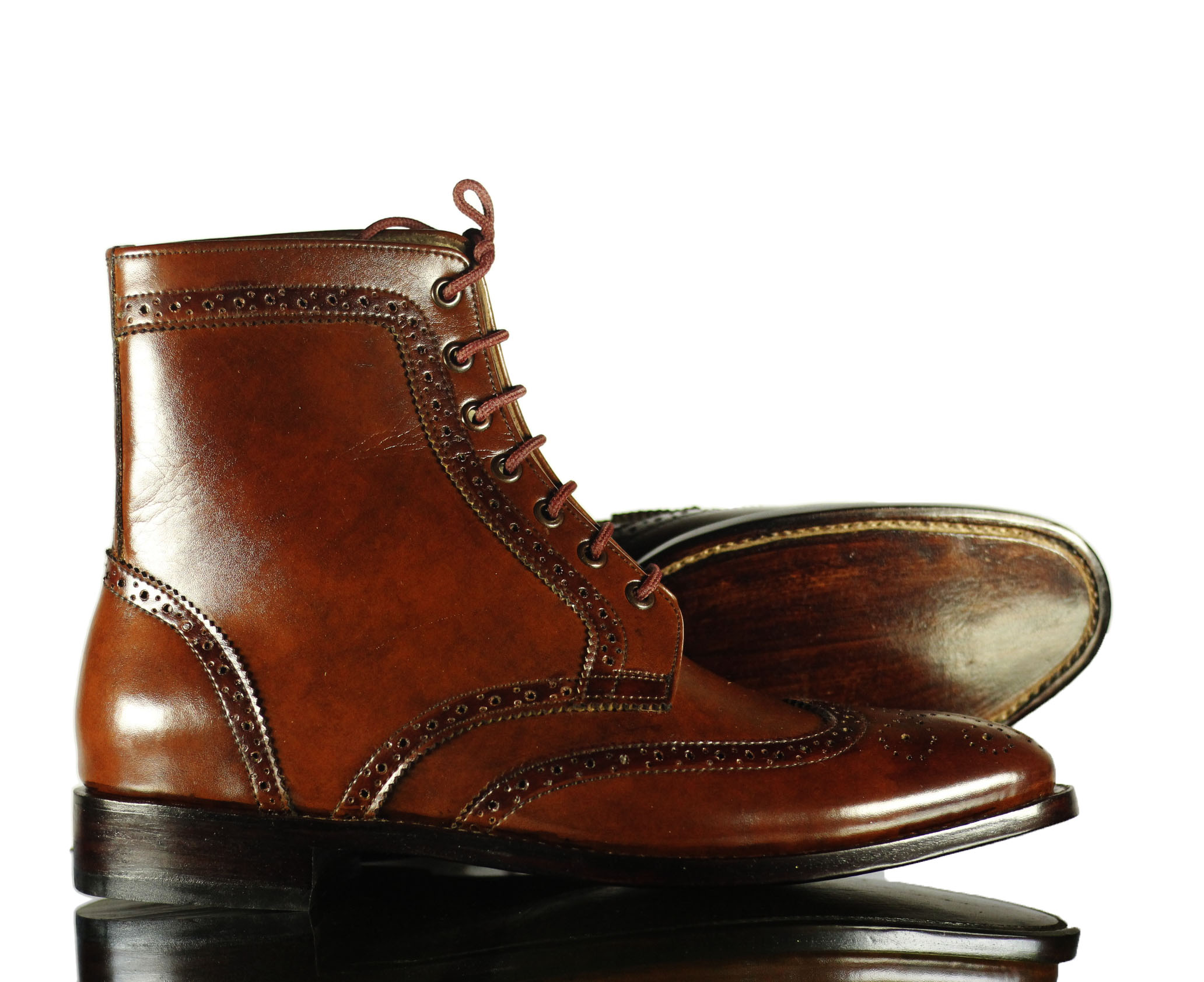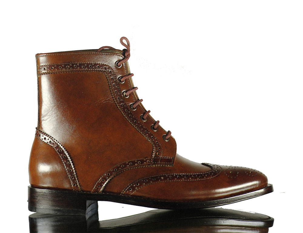 Coffee Brown Wing Tip Lace Up Leather Ankle High Boot