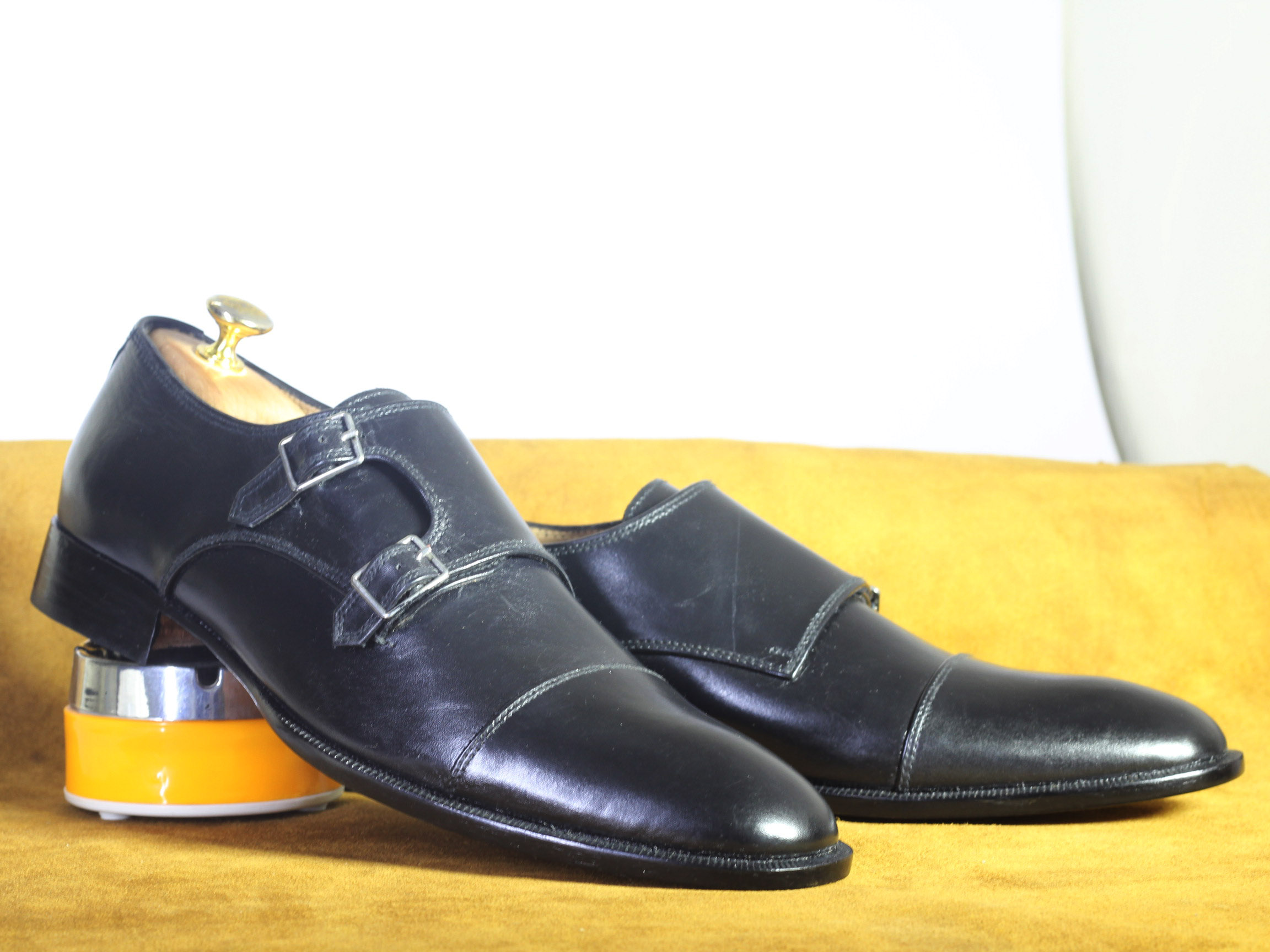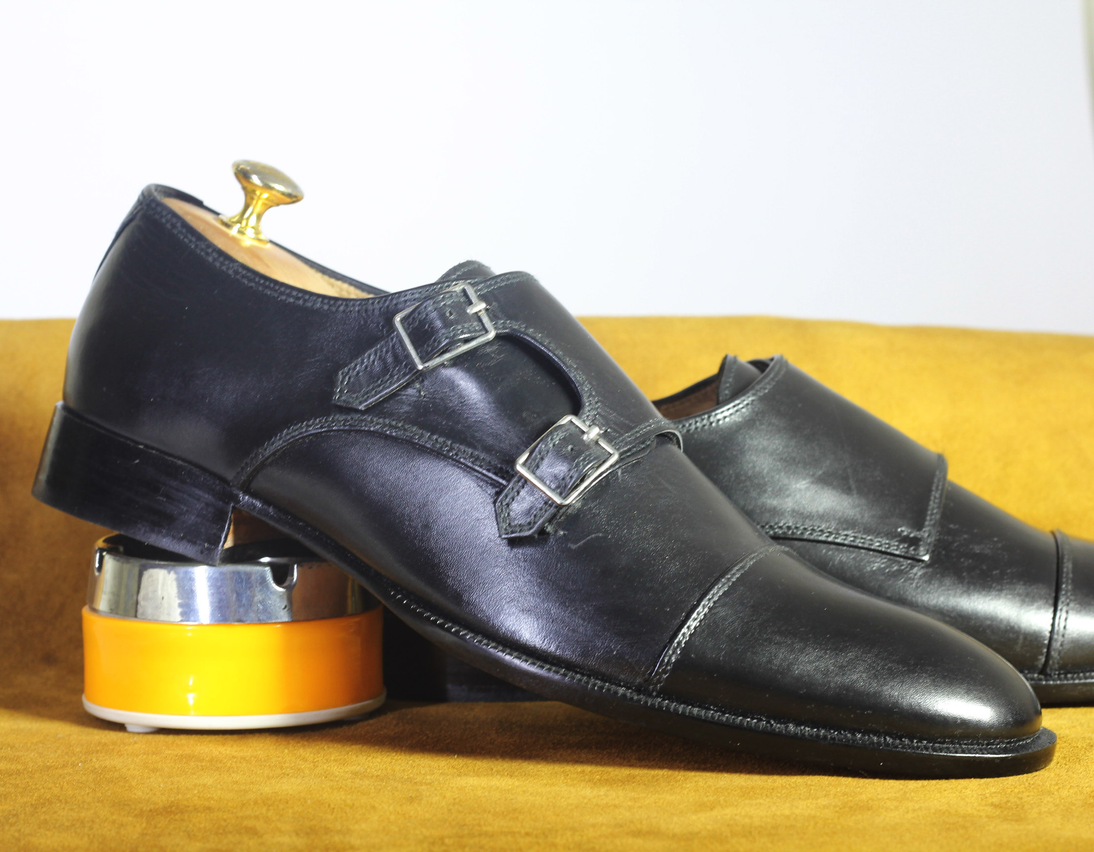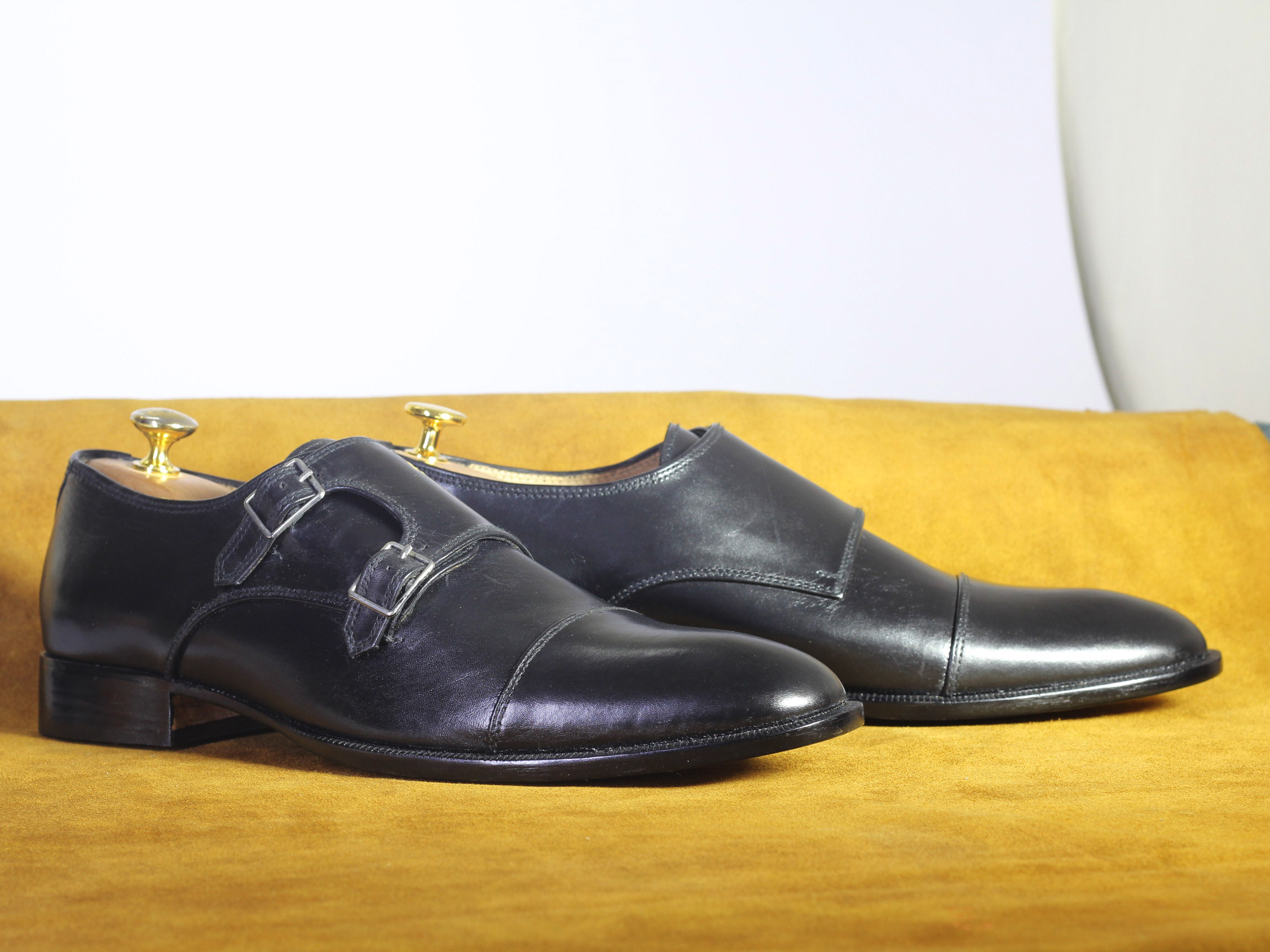 Double Monk Strip Black Cap Toe Leather Men's Foot Wear
