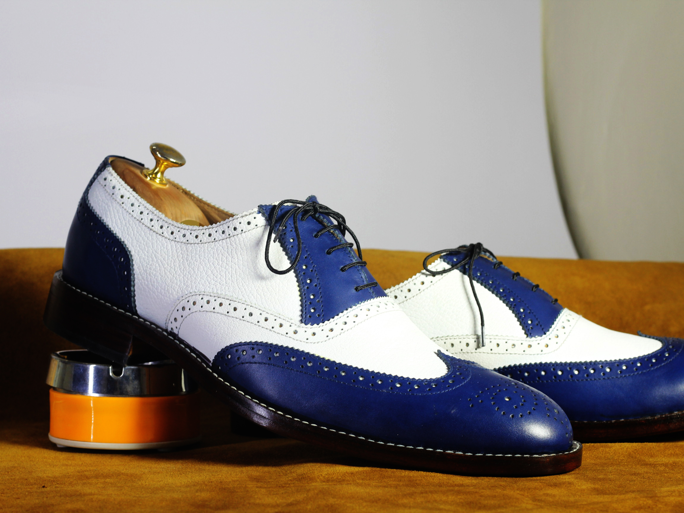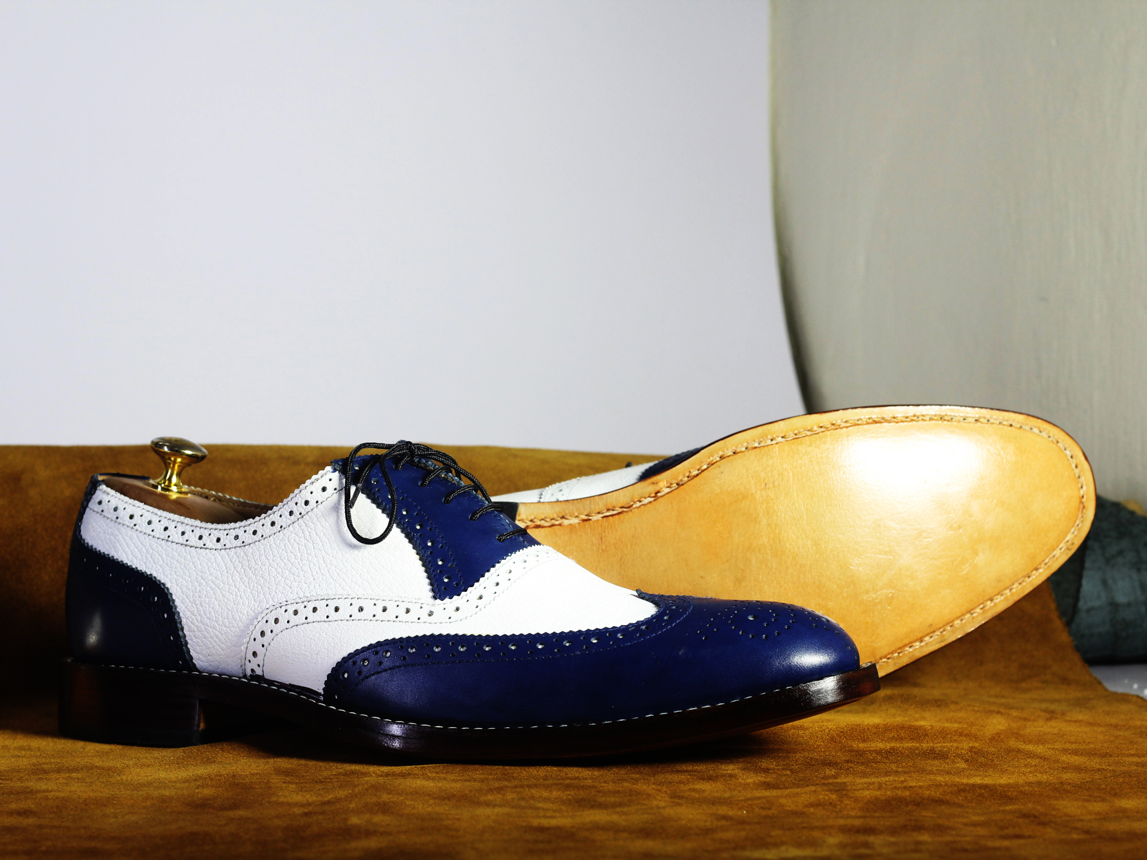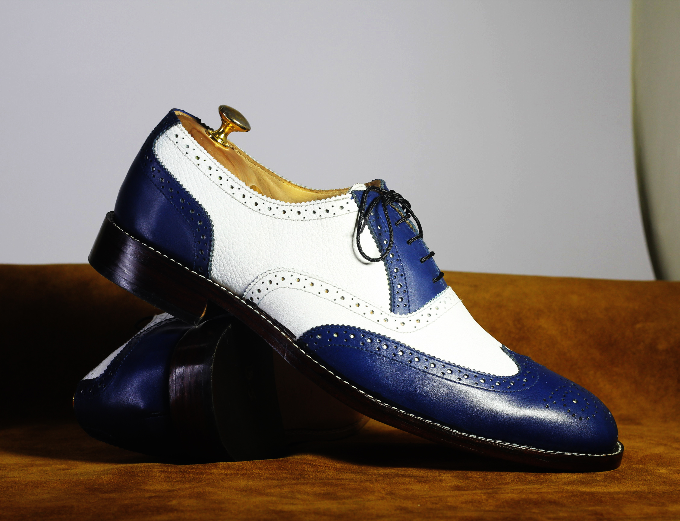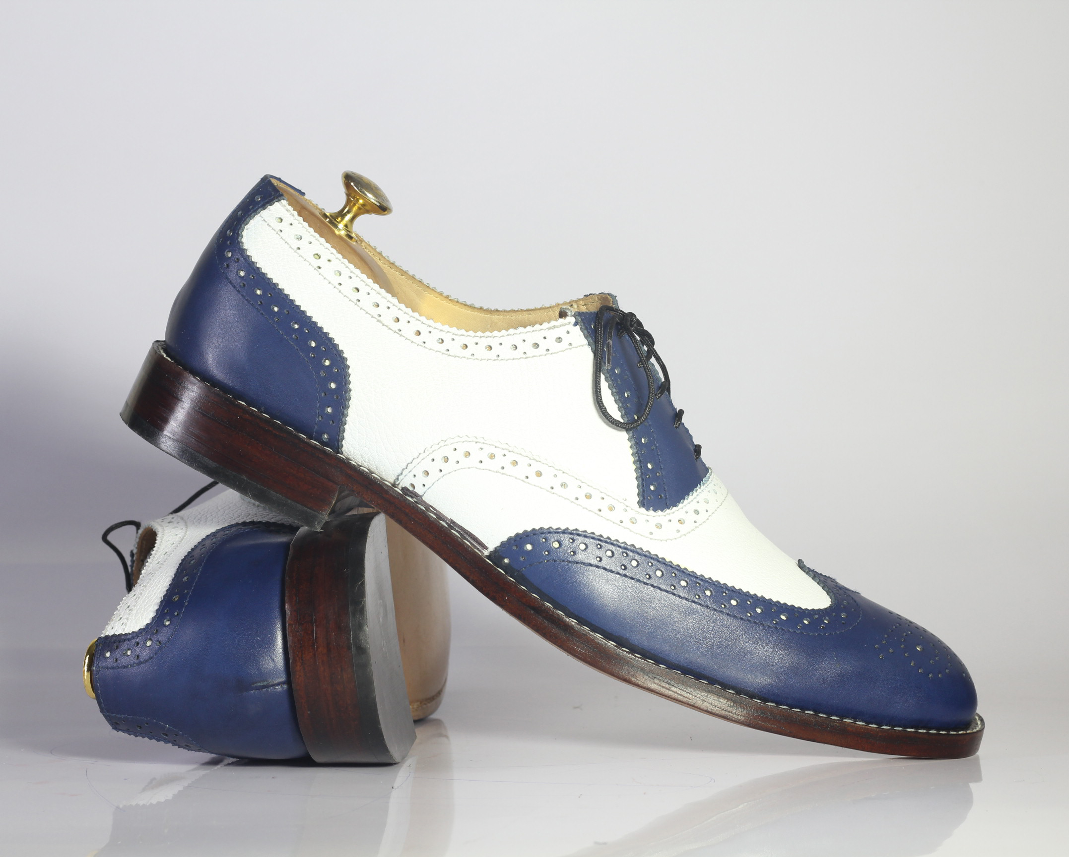 White Blue Wing Tip Brogue Lace Up Leather Shoes