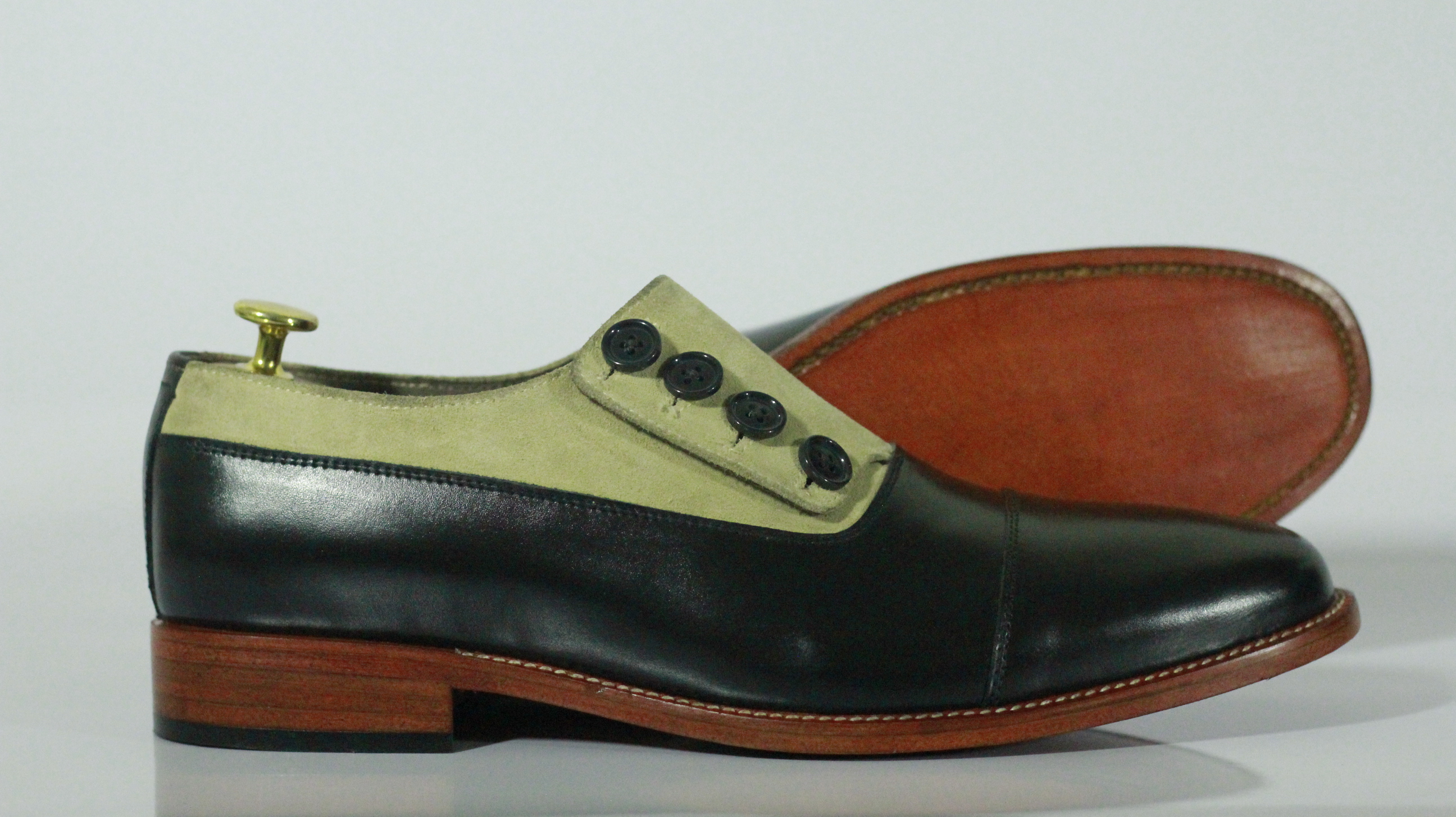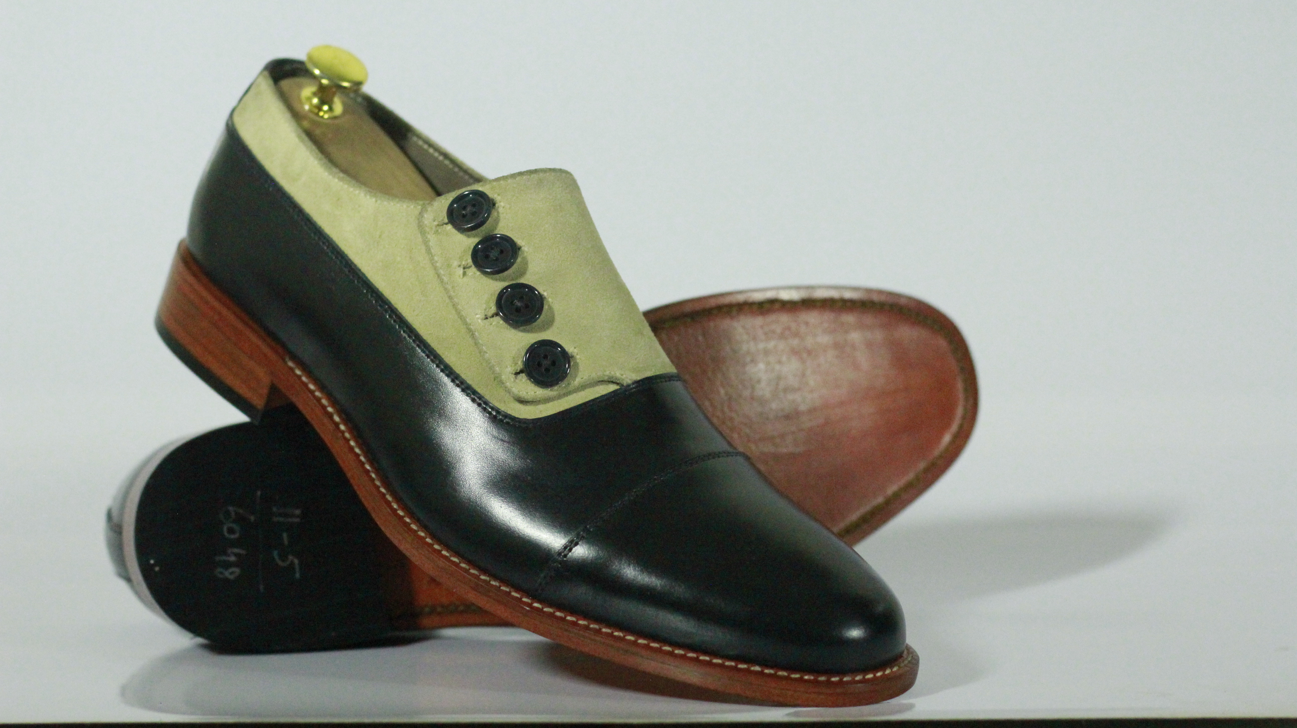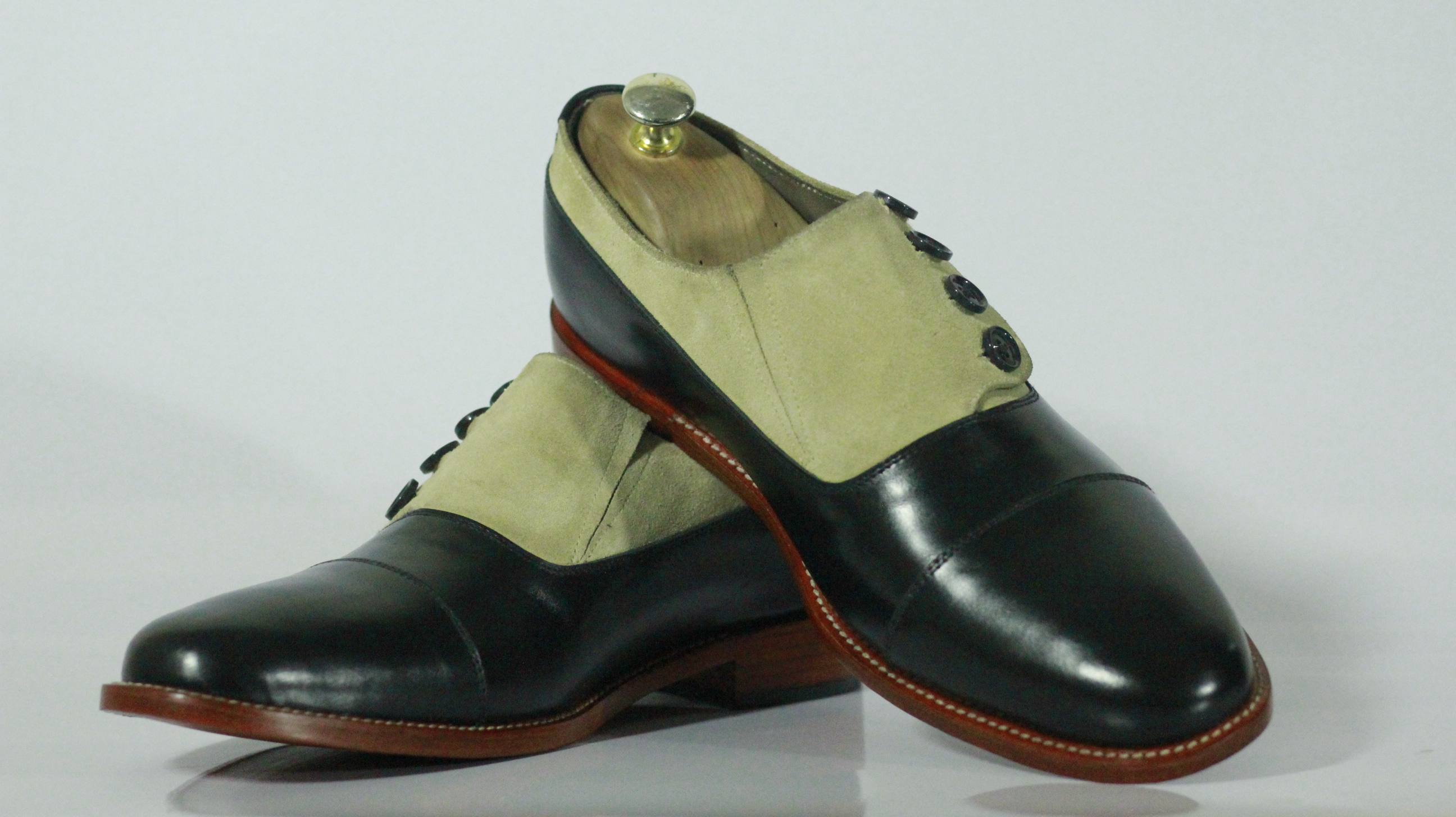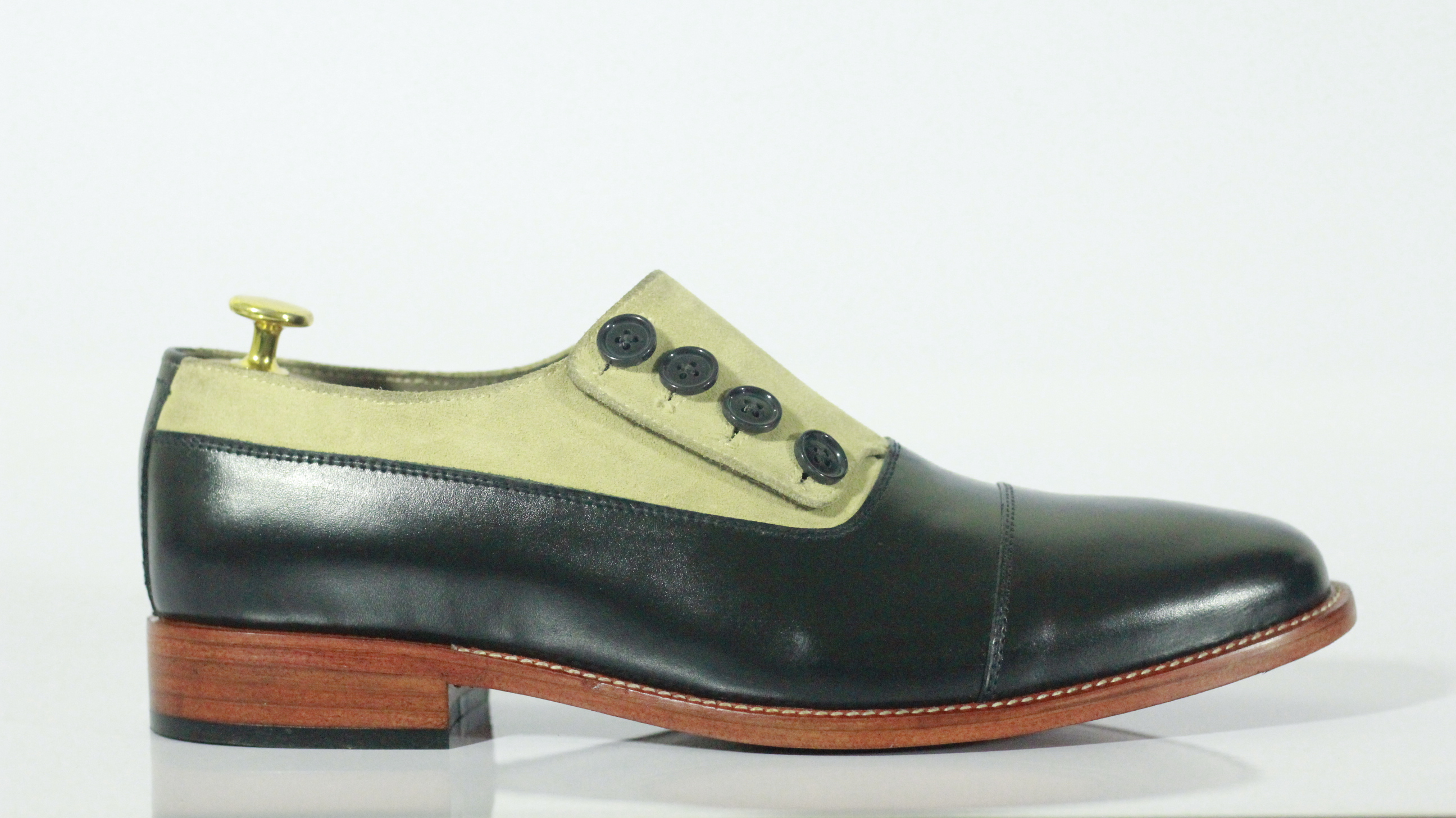 Black Beige Button Top Cap Toe Leather Suede Shoes