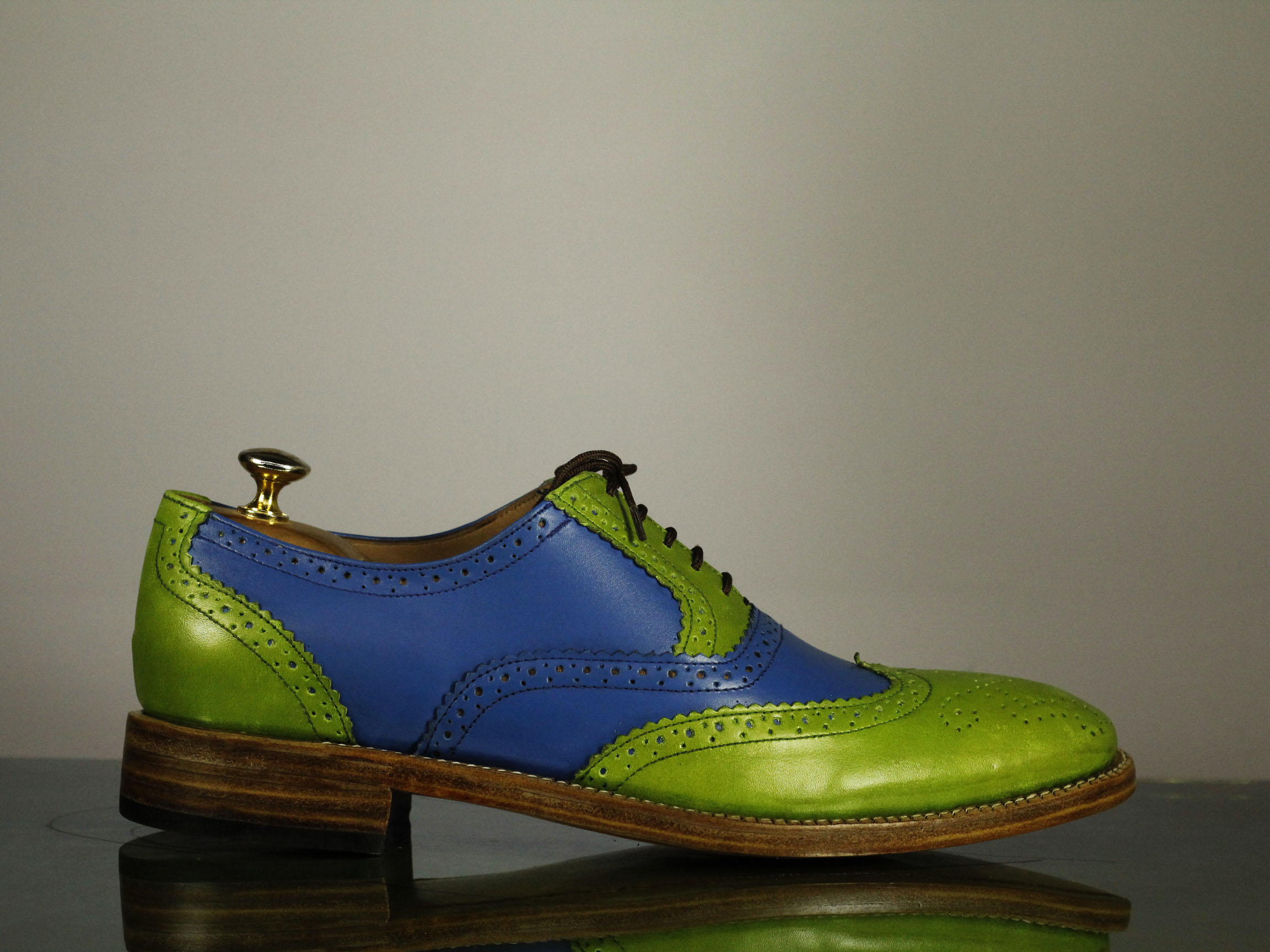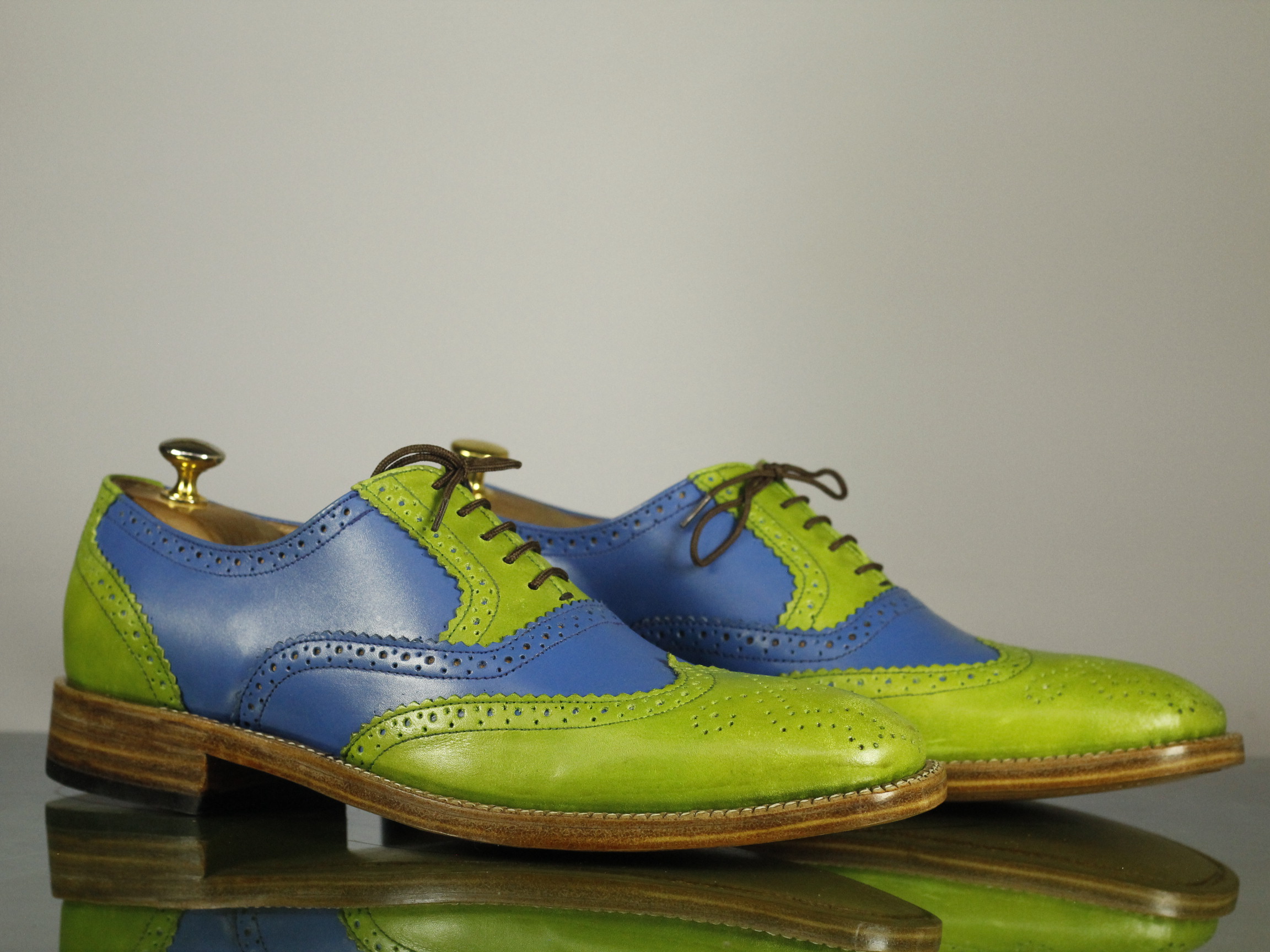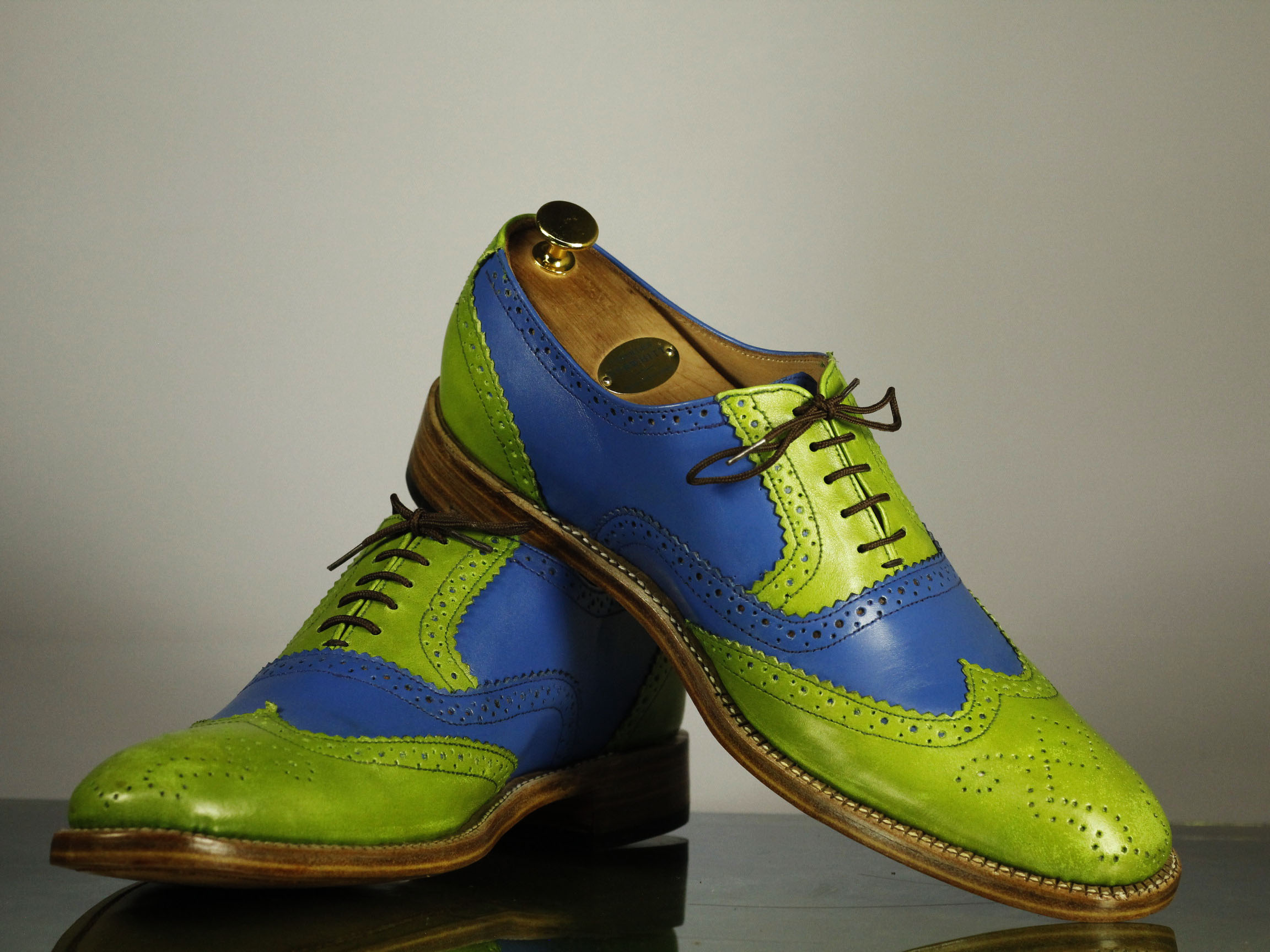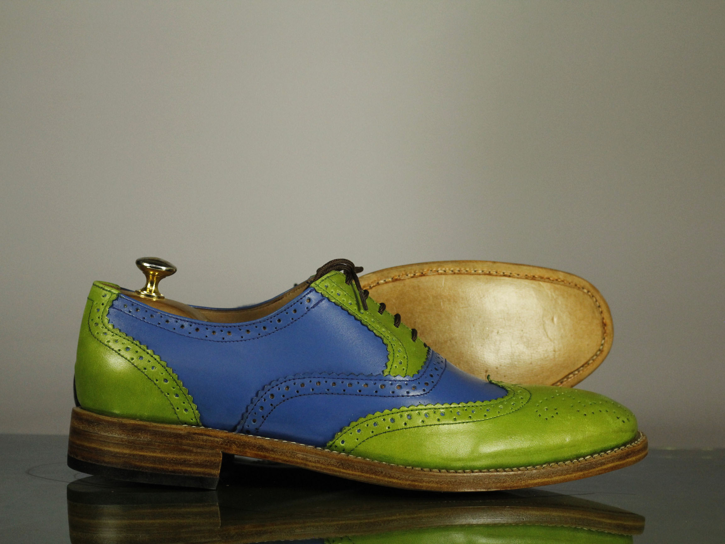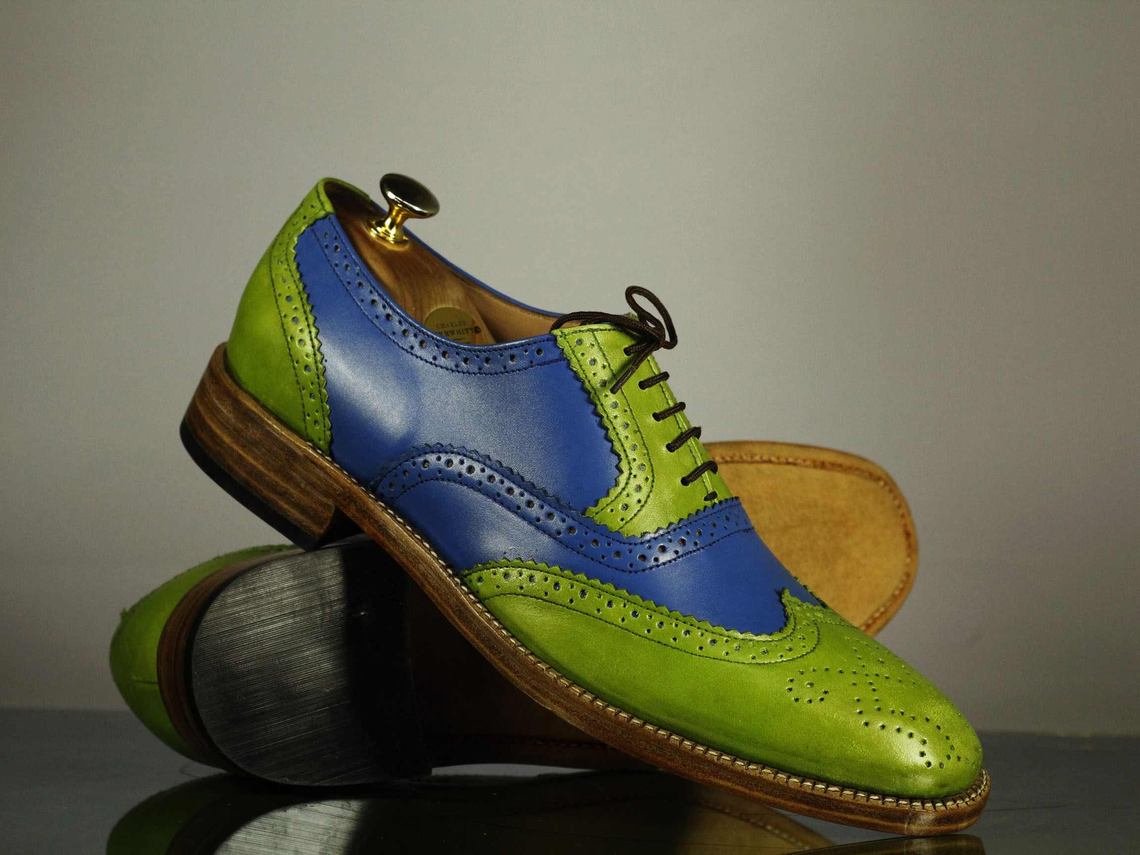 Stylish Wing Tip Two Tone Green & Blue Brogue Lace Up Leather Shoes