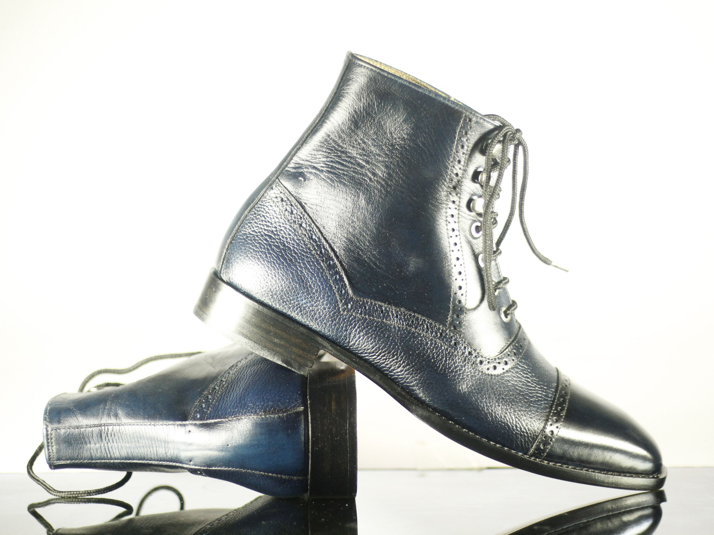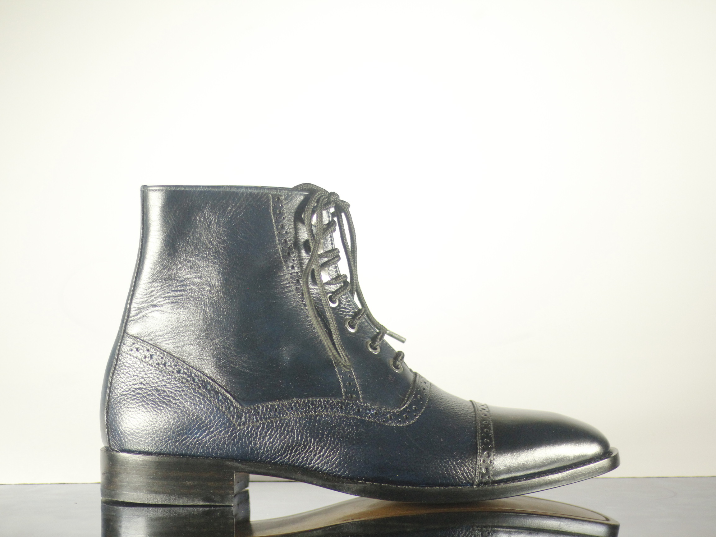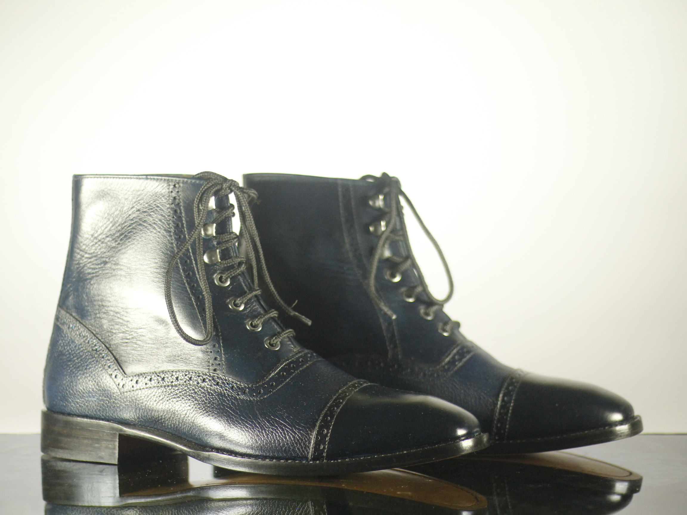 Cap Toe Ankle High Blue Black Lace Up Brogue Leather Boot