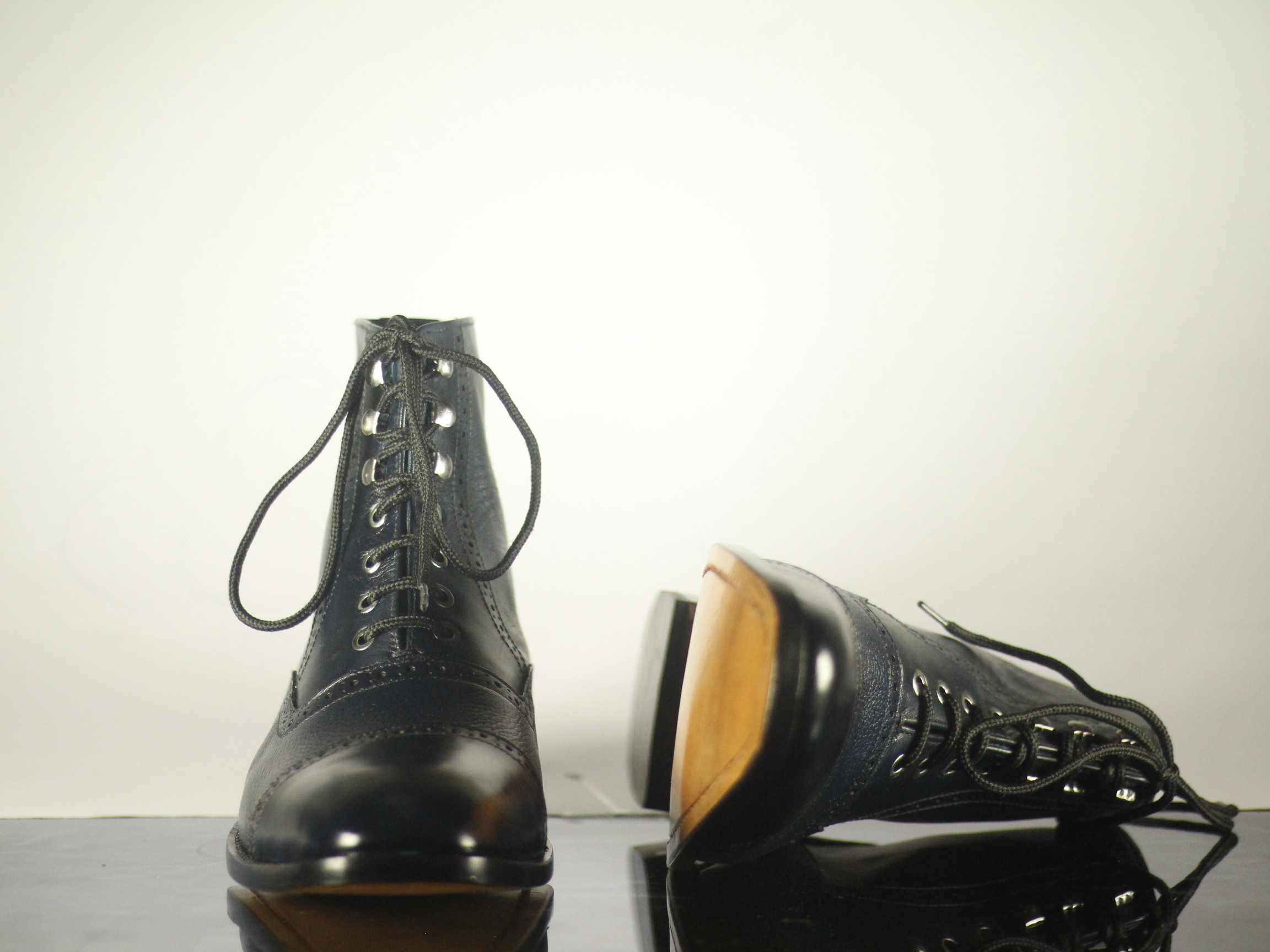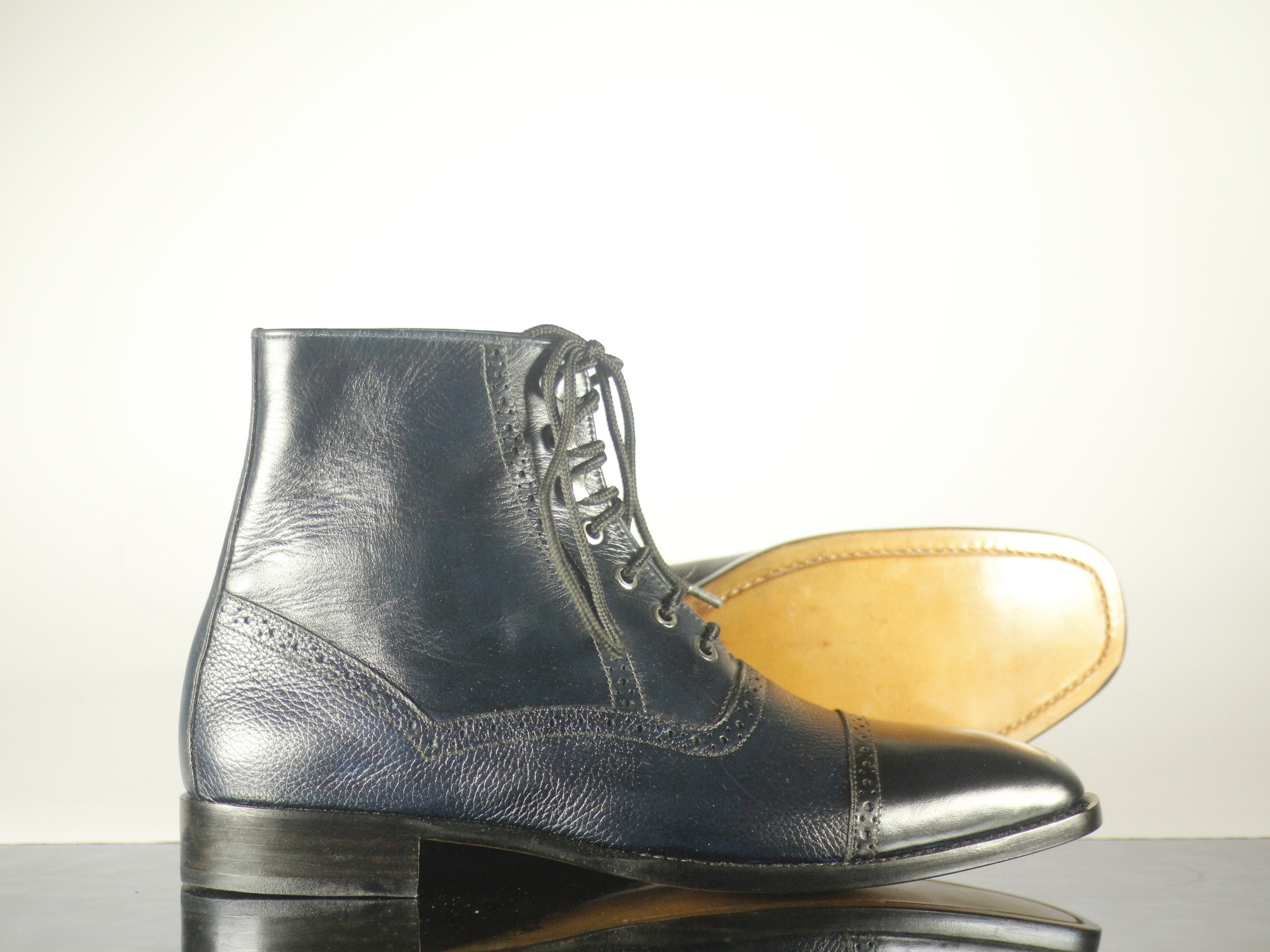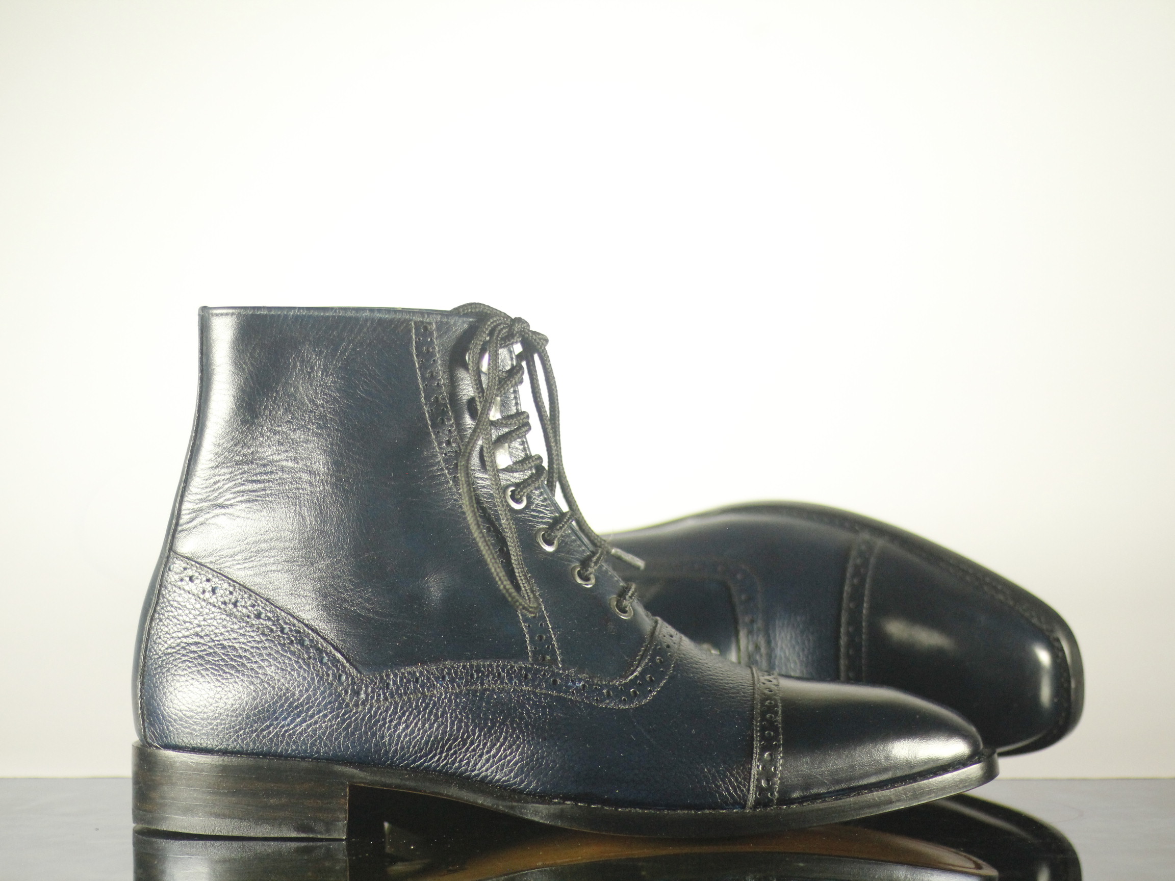 Cap Toe Ankle High Blue Black Lace Up Brogue Leather Boot