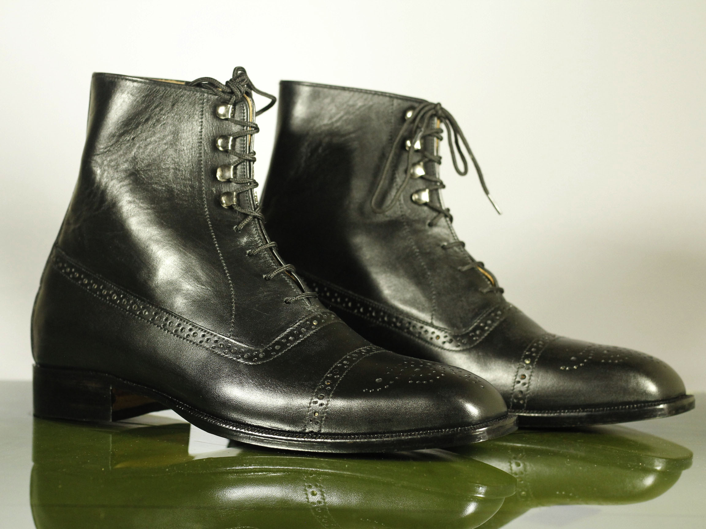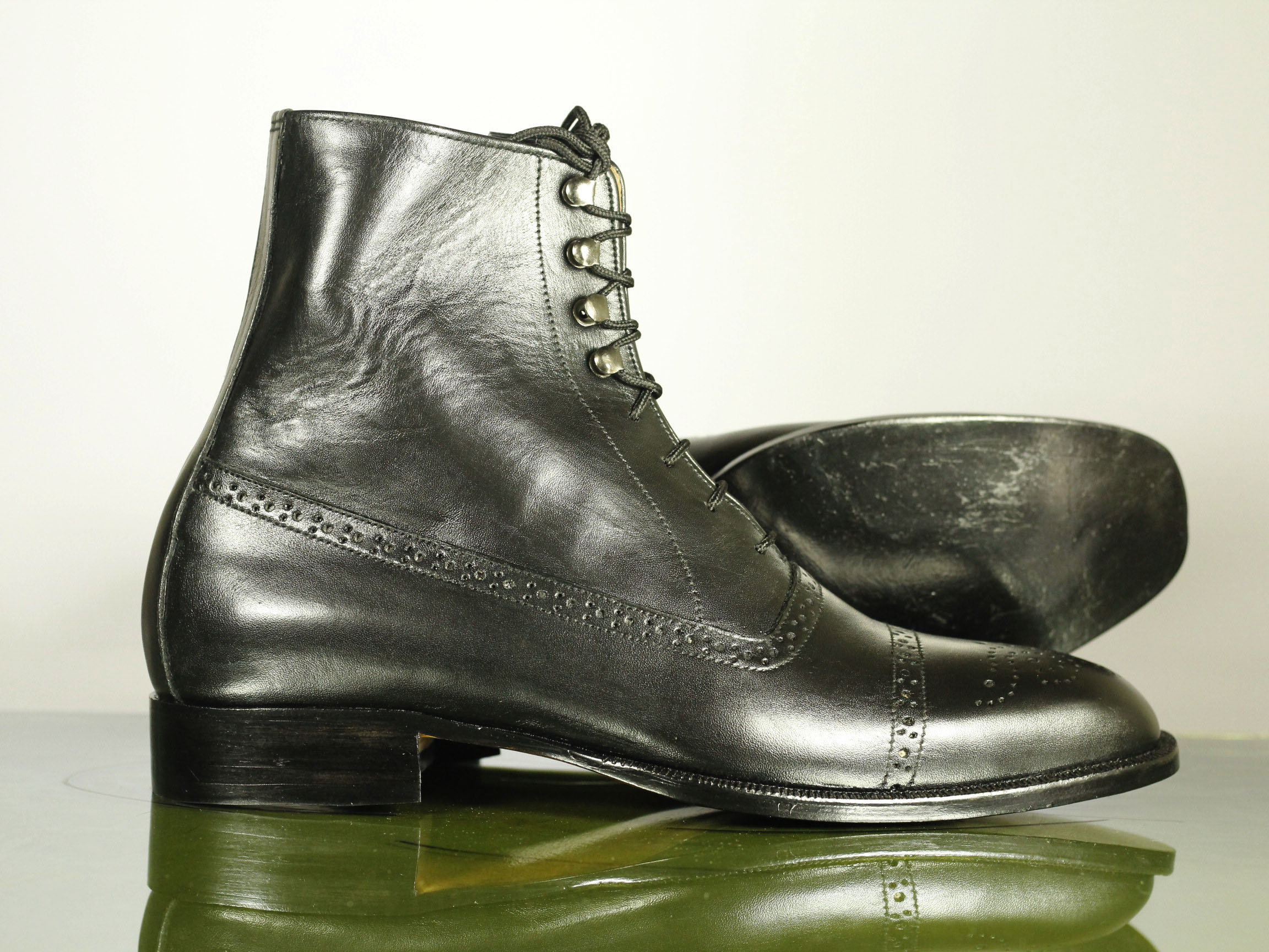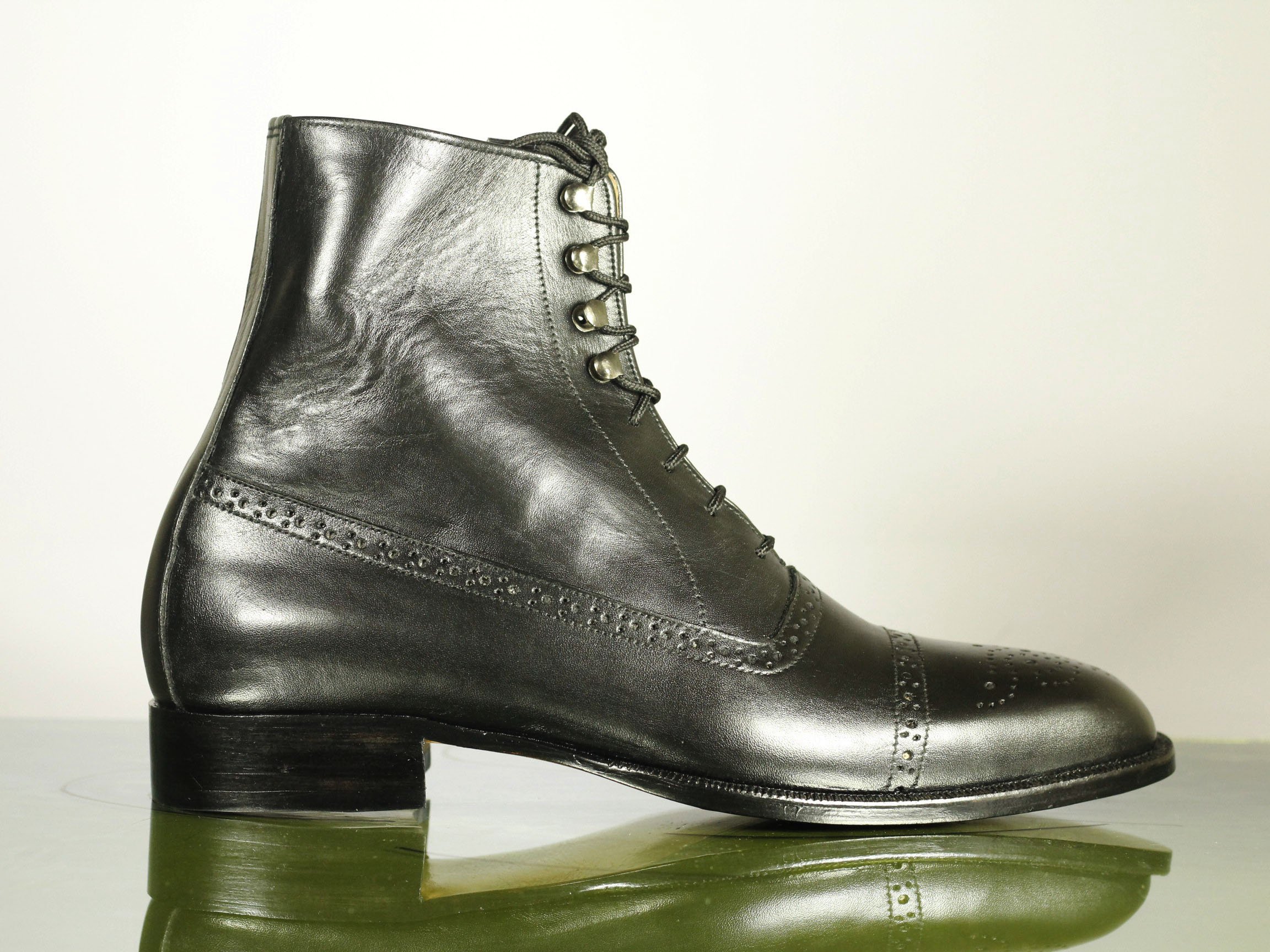 Ankle High Black Cap Toe Brogue Lace Up Leather Men's Boot