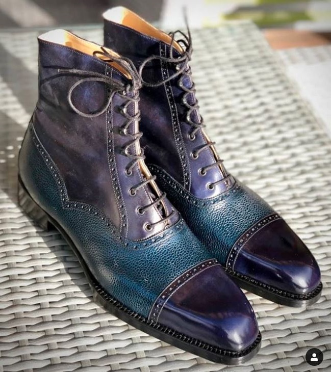Ankle High Cap Toe Alligator Texture Lace Up Blue Black Leather Boot