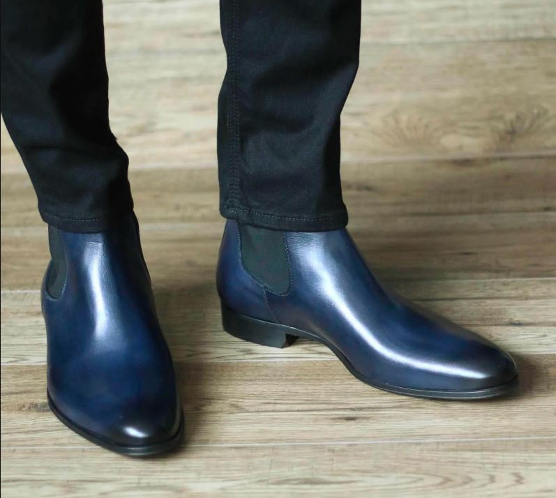 Hand Painted Blue Ankle High Chelsea Leather Boot For Men