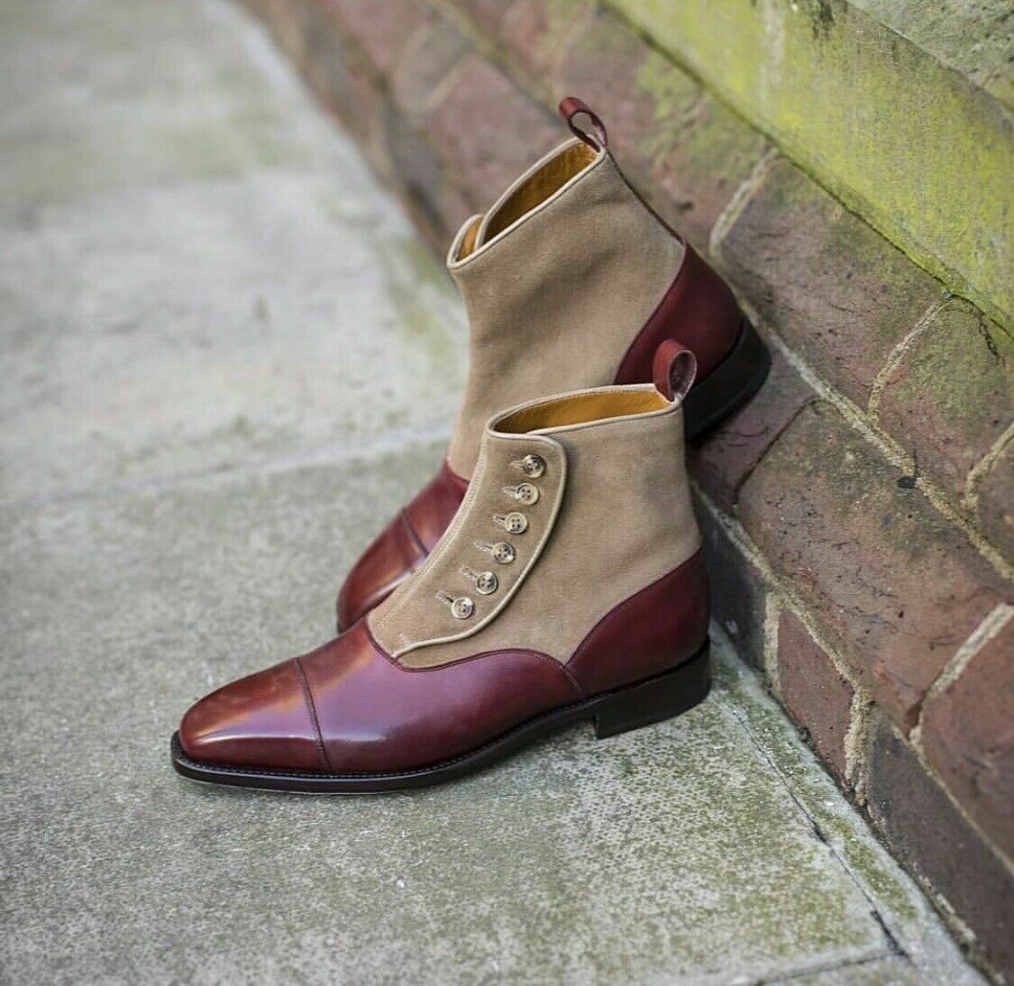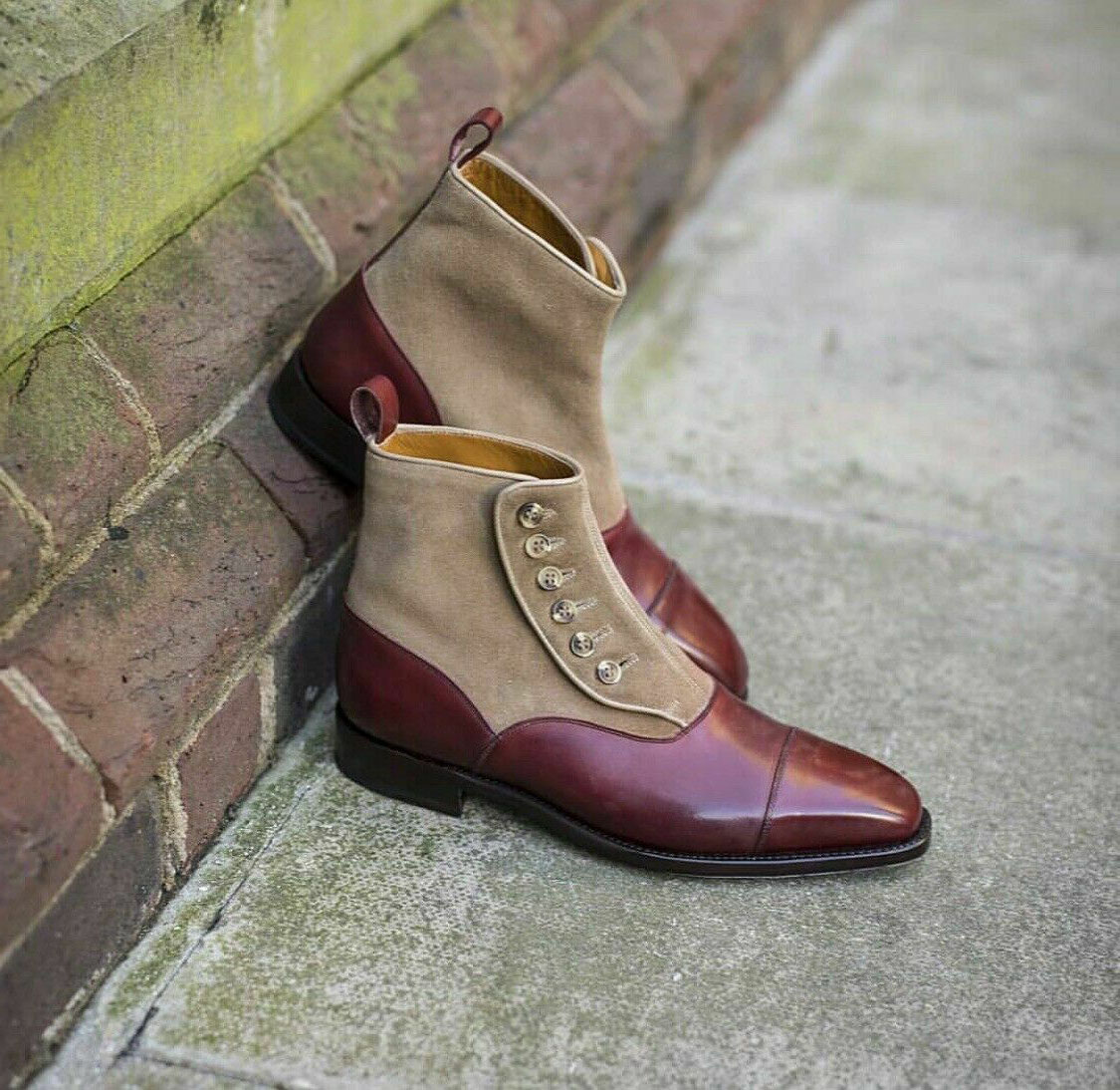 Beautiful Cap Toe Burgundy & Beige Patent Leather Suede Button Top Boot