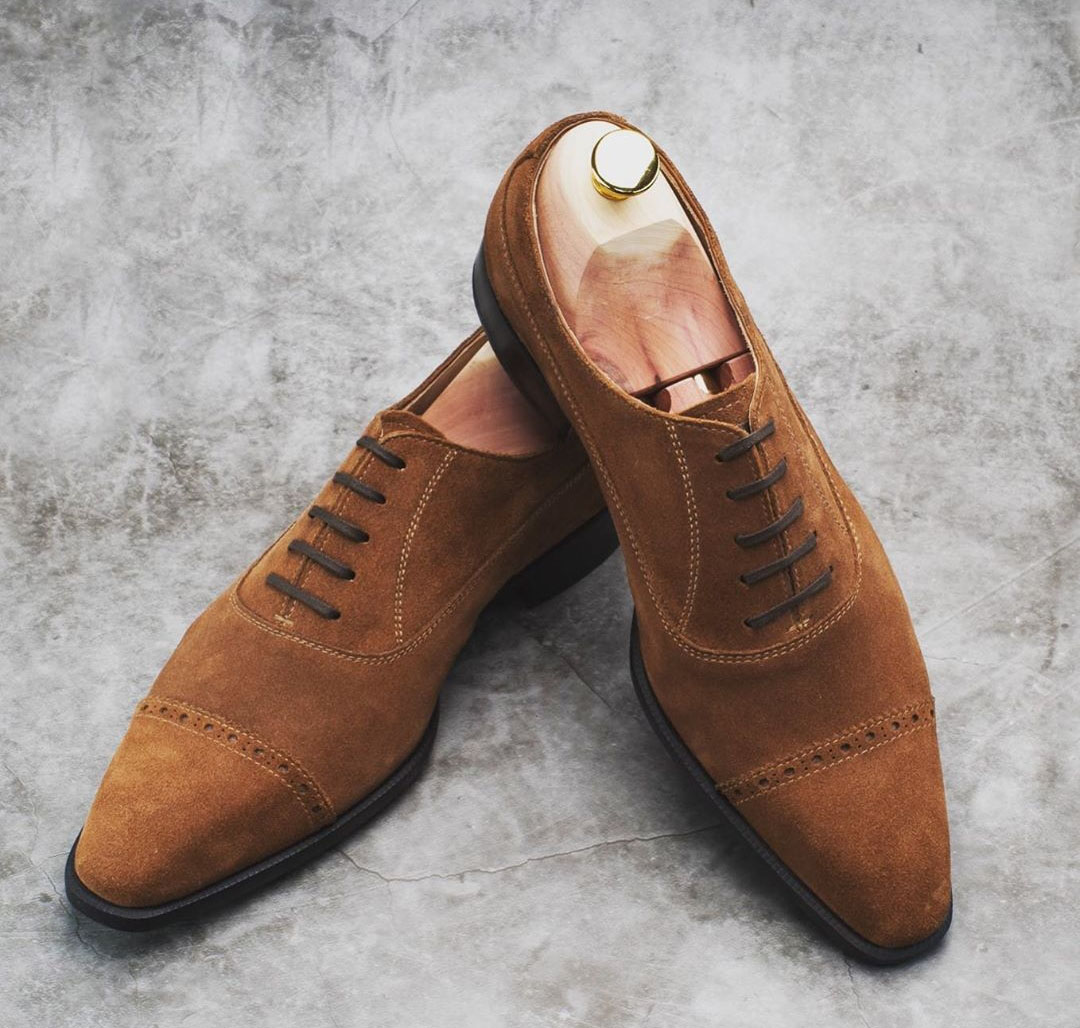 Hand Crafted Tan Cap Toe Brogue Lace Up Leather Suede Shoes