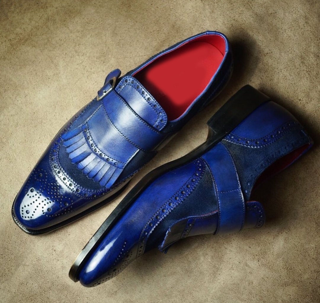 Royal Blue Fringe Style Brogue Buckle Strap Leather suede Loafers