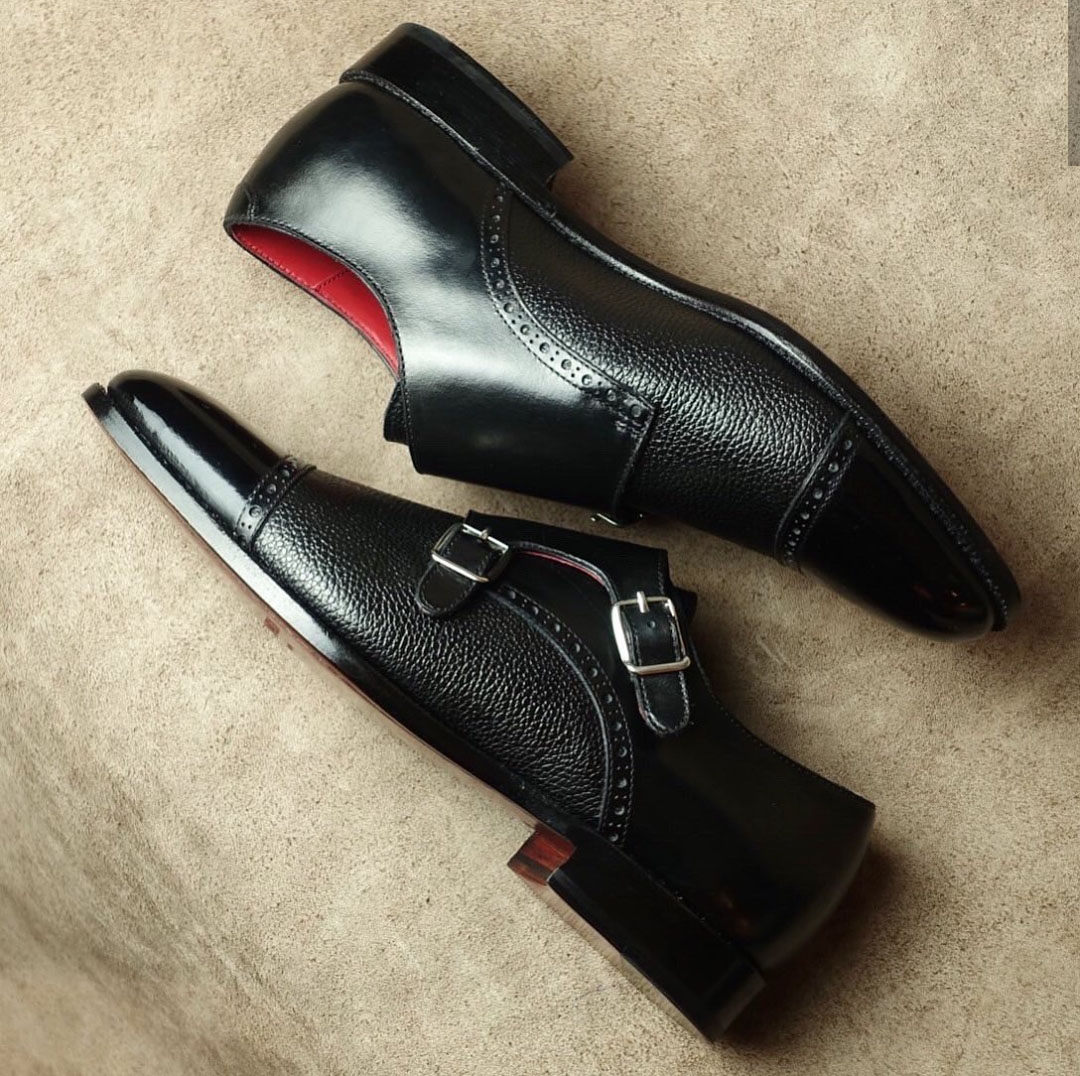Double Monk Cap Toe Alligator texture Black Leather Shoes For Men